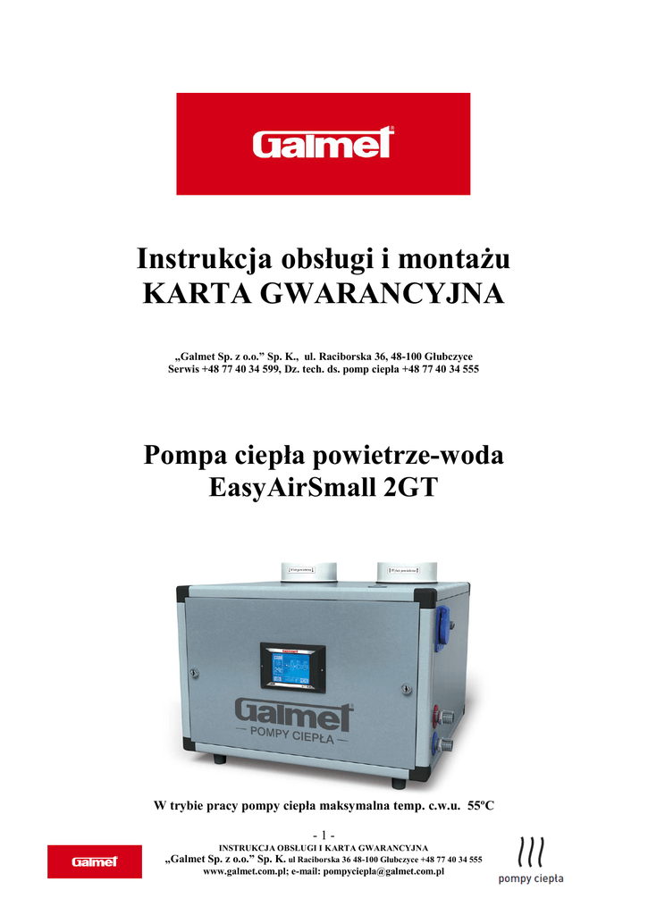Instrukcja obsługi i montażu KARTA GWARANCYJNA „Galmet Sp. z o.o.” Sp. K., ul. Raciborska 36, 48-100 Głubczyce Serwis +48 77 40 34 599, Dz. tech. ds. pomp ciepła +48 77 40 34 555 Pompa ciepła powietrze-woda EasyAirSmall 2GT W trybie pracy pompy ciepła maksymalna temp. c.w.u. 55ºC -1„Galmet INSTRUKCJA OBSŁUGI I KARTA GWARANCYJNA Sp. z o.o.” Sp. K. ul Raciborska 36 48-100 Głubczyce +48 77 40 34 555 www.galmet.com.pl; e-mail: [email protected] Podłączenia oraz rozruchu pompy ciepła może dokonać jedynie instalator lub serwis fabryczny posiadający odpowiednie uprawnienia. W przeciwnym wypadku gwarancja na urządzenie nie będzie udzielona. Należy zapoznać się z niniejszą instrukcją obsługi urządzenia. Użytkowanie niezgodne z instrukcją grozi utratą gwarancji i może spowodować trwałe uszkodzenie urządzenia. Niniejszy sprzęt nie jest przeznaczony do użytkowania przez osoby (w tym dzieci) o ograniczonej zdolności fizycznej, czuciowej lub psychicznej oraz osoby nie mające doświadczenia lub znajomości sprzętu. Chyba, że odbywa się to pod nadzorem lub zgodnie z instrukcją użytkowania sprzętu, przekazanej przez osoby odpowiadające za ich bezpieczeństwo. Urządzenie powinno być zainstalowane zgodnie ze sztuką budowlaną oraz zgodnie z przepisami i normami obowiązującymi w danym kraju. Urządzenie przeznaczone do zamontowania wewnątrz budynku. Pompa ciepła EasyAir Small 2GT o mocy 1,92 kW jest wspomagającym źródłem ogrzewania c.w.u. W okresach wzmożonego zapotrzebowania na c.w.u., użytkownik musi mieć możliwość przygotowania c.w.u. ze źródła podstawowego (t.j. kotła c.o., grzałki elektrycznej itp.). Zalecana pojemność zbiornika aby zoptymalizować czas podgrzewania c.w.u. to 100 ÷ 250 litrów. 1. Eksploatacja i obsługa Pompa ciepła Easy Air Small 2GT jest to powietrzno – wodna pompa ciepła umożliwiająca przygotowanie ciepłej wody użytkowej dla max. 6 osobowej rodziny *. Maksymalna temperatura użytkowej wody jaką może przygotować pompa ciepła to 55 stopni C. Jednak z uwagi na najekonomiczniejsze użytkowanie pompy ciepła zaleca się, aby nie ustawiać temperatury CWU powyżej 45 stopni C, gdyż spowoduje to podniesienie kosztów użytkowania pompy ciepła oraz spowoduje szybsze zużywanie się elementów agregatu pompy ciepła. Temperatura wody ponad 50 stopni może spowodować poważne oparzenie. Należy zachować szczególną ostrożność aby nie doszło do oparzenia się dzieci, osób niepełnosprawnych oraz osób starszych. 2. Opis urządzenia Pompa ciepła Easy Air Small 2GT przeznaczona jest do podłączenia do zbiornika istniejącej instalacji, zawiera jedną wytwornicę ciepła oraz opcjonalnie grzałkę elektryczną (którą można podłączyć do zbiornika) za pomocą których ciepło gromadzone jest w zasobniku pracującej instalacji i ogrzewane do zadanej temperatury. Pompa ciepła pobiera ciepło z otaczającego je powietrza i wykorzystuje je do ogrzania wody w zasobniku. Pompa ciepła może być podłączona także do kanałów powietrznych lecz ich średnica nie może być mniejsza niż 160 mm i łączna długość nie może być większa niż 10 m. Podczas pracy pompa ciepła odprowadza wilgoć z pomieszczenia i normalnym zjawiskiem jest powstawanie kondensatu, przewód odprowadzający kondensat znajduje się pod urządzeniem i należy go umieścić w kratce ściekowej. * przy założonym nominalnym zużyciu c.w.u. 50 litrów / osobę / dzień (nie jednocześnie) -2„Galmet INSTRUKCJA OBSŁUGI I KARTA GWARANCYJNA Sp. z o.o.” Sp. K. ul Raciborska 36 48-100 Głubczyce +48 77 40 34 555 www.galmet.com.pl; e-mail: [email protected] 3. Prawidłowa eksploatacja Pompa ciepła służy do odbioru energii z powietrza znajdującego się w pomieszczeniu lub pomieszczenia do którego podłączone są kanały i przekazuje energię do zasobnika ciepłej wody użytkowej. 4. Nieprawidłowa eksploatacja Niedopuszczalne jest: Wykorzystywanie powietrza zawierającego tłuszcze; Wykorzystywanie do ogrzewania innych cieczy niż woda użytkowa. Ustawianie urządzenia: - na zewnątrz; - w pomieszczeniach narażonych na zamarzanie; - w pomieszczeniach narażonych na kurz, gazy lub łatwopalne pary; - eksploatacja urządzenia z pustym zasobnikiem; - eksploatacja urządzenia z nie napełnioną wężownicą; - eksploatacja poniżej temperatury +5º C. 5. Zasada działania Eksploatacja z zastosowaniem jako pompa ciepła Jest to normalna eksploatacja która może być realizowana w celu ogrzania np: 200 litrów wody zgromadzonej w zasobniku do temp 45 stopni C pompa potrzebuje. Temp. powietrza + 20 ºC + 10 ºC + 7 ºC Temp. zimnej wody 15 ºC 15 ºC 15 ºC Czas ogrzewania 4,5 h 5,5 h 6,0 h Wężownica Pompa ciepła może współpracować z każdym typem zasobnika wyposażonym w wężownicę lecz jej powierzchnia nie może być mniejsza niż 1 mkw. Ważne! Należy podłączyć dolną wężownicę do układu grzewczego i odpowietrzyć układ wymiennika płytowego znajdującego się w górnej części obudowy, gdyż użytkowanie bez napełnionej dolnej wężownicy grozi uszkodzeniem urządzenia i utratą gwarancji. W przypadku braku dodatkowego urządzenia grzewczego dolną wężownicę należy zalać wodą i podłączyć naczynie przeponowe oraz grupę bezpieczeństwa schemat podłączenia znajduje się w dalszej części dokumentacji w rozdziale schematy podłączenia. Pompa ciepła może pracować w układzie otwartym z kotłem C.O.. -3„Galmet INSTRUKCJA OBSŁUGI I KARTA GWARANCYJNA Sp. z o.o.” Sp. K. ul Raciborska 36 48-100 Głubczyce +48 77 40 34 555 www.galmet.com.pl; e-mail: [email protected] 6.a. Dane techniczne pompy ciepła TYP Easy Air Small 2GT Nr . katalogowy Zakres stosowania pompy Temp. CWU Czynnik chłodniczy Wymiary wys. x szer. x głęb. Ciężar Napięcie zasilania Króćce przyłączeniowe Przyłącze kondensatu Nominalny pobór mocy sprężarki Nominalny pobór mocy pompy ciepła Ciśnienie robocze Śr