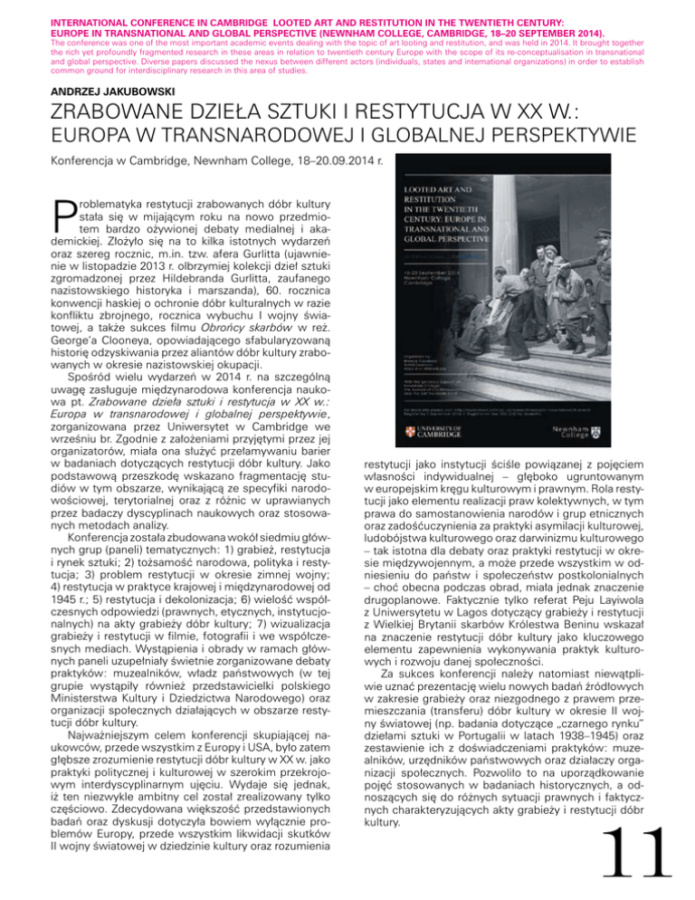 International conference in Cambridge Looted Art and Restitution in the Twentieth Century: Europe in transnational and global perspective (Newnham College, Cambridge, 18–20 September 2014). The conference was one of the most important academic events dealing with the topic of art looting and restitution, and was held in 2014. It brought together the rich yet profoundly fragmented research in these areas in relation to twentieth century Europe with the scope of its re-conceptualisation in transnational and global perspective. Diverse papers discussed the nexus between different actors (individuals, states and international organizations) in order to establish common ground for interdisciplinary research in this area of studies. ANDRZEJ JAKUBOWSKI Zrabowane dzieła sztuki i restytucja w XX w.: Europa w transnarodowej i globalnej perspektywie Konferencja w Cambridge, Newnham College, 18–20.09.2014 r. P roblematyka restytucji zrabowanych dóbr kultury stała się w mijającym roku na nowo przedmiotem bardzo ożywionej debaty medialnej i akademickiej. Złożyło się na to kilka istotnych wydarzeń oraz szereg rocznic, m.in. tzw. afera Gurlitta (ujawnienie w listopadzie 2013 r. olbrzymiej kolekcji dzieł sztuki zgromadzonej przez Hildebranda Gurlitta, zaufanego nazistowskiego historyka i marszanda), 60. rocznica konwencji haskiej o ochronie dóbr kulturalnych w razie konfliktu zbrojnego, rocznica wybuchu I wojny światowej, a także sukces filmu Obrońcy skarbów w reż. George’a Clooneya, opowiadającego sfabularyzowaną historię odzyskiwania przez aliantów dóbr kultury zrabowanych w okresie nazistowskiej okupacji. Spośród wielu wydarzeń w 2014 r. na szczególną uwagę zasługuje międzynarodowa konferencja naukowa pt. Zrabowane dzieła sztuki i restytucja w XX w.: Europa w transnarodowej i globalnej perspektywie, zorganizowana przez Uniwersytet w Cambridge we wrześniu br. Zgodnie z założeniami przyjętymi przez jej organizatorów, miała ona służyć przełamywaniu barier w badaniach dotyczących restytucji dóbr kultury. Jako podstawową przeszkodę wskazano fragmentację studiów w tym obszarze, wynikającą ze specyfiki narodowościowej, terytorialnej oraz z różnic w uprawianych przez badaczy dyscyplinach naukowych oraz stosowanych metodach analizy. Konferencja została zbudowana wokół siedmiu głównych grup (paneli) tematycznych: 1) grabież, restytucja i rynek sztuki; 2) tożsamość narodowa, polityka i restytucja; 3) problem restytucji w okresie zimnej wojny; 4) restytucja w praktyce krajowej i międzynarodowej od 1945 r.; 5) restytucja i dekolonizacja; 6) wielość współczesnych odpowiedzi (prawnych, etycznych, instytucjonalnych) na akty grabieży dóbr kultury; 7) wizualizacja grabieży i restytucji w filmie, fotografii i we współczesnych mediach. Wystąpienia i obrady w ramach głównych paneli uzupełniały świetnie zorganizowane debaty praktyków: muzealników, władz państwowych (w tej grupie wystąpiły również przedstawicielki polskiego Ministerstwa Kultury i Dziedzictwa Narodowego) oraz organizacji społecznych działających w obszarze restytucji dóbr kultury. Najważniejszym celem konferencji skupiającej naukowców, przede wszystkim z Europy i USA, było zatem głębsze zrozumienie restytucji dóbr kultury w XX w. jako praktyki politycznej i kulturowej w szerokim przekrojowym interdyscyplinarnym ujęciu. Wydaje się jednak, iż ten niezwykle ambitny cel został zrealizowany tylko częściowo. Zdecydowana większość przedstawionych badań oraz dyskusji dotyczyła bowiem wyłącznie problemów Europy, przede wszystkim likwidacji skutków II wojny światowej w dziedzinie kultury oraz rozumienia restytucji jako instytucji ściśle powiązanej z pojęciem własności indywidualnej – głęboko ugruntowanym w europejskim kręgu kulturowym i prawnym. Rola restytucji jako elementu realizacji praw kolektywnych, w tym prawa do samostanowienia narodów i grup etnicznych oraz zadośćuczynienia za praktyki asymilacji kulturowej, ludobójstwa kulturowego oraz darwinizmu kulturowego – tak istotna dla debaty oraz praktyki restytucji w okresie międzywojennym, a może przede wszystkim w odniesieniu do państw i społeczeństw postkolonialnych – choć obecna podczas obrad, miała jednak znaczenie drugoplanowe. Faktycznie tylko referat Peju Layiwola z Uniwersytetu w Lagos dotyczący grabieży i restytucji z Wielkiej Brytanii skarbów Królestwa Beninu wskazał na znaczenie restytucji dóbr kultury jako kluczowego elementu zapewnienia wykonywania praktyk kulturowych i rozwoju danej społeczności. Za sukces konferencji należy natomiast niewątpliwie uznać prezentację wielu nowych badań źródłowych w zakresie grabieży oraz niezgodnego z prawem przemieszczania (transferu) dóbr kultury w okresie II wojny światowej (np. badania dotyczące „czarnego rynku” dziełami sztuki w Portugalii w latach 1938–1945) oraz zestawienie ich z doświadczeniami praktyków: muzealników, urzędników państwowych oraz działaczy organizacji społecznych. Pozwoliło to na uporządkowanie pojęć stosowanych w badaniach historycznych, a odnoszących się do różnych sytuacji prawnych i faktycznych charakteryzujących akty grabieży i restytucji dóbr kultury. 11