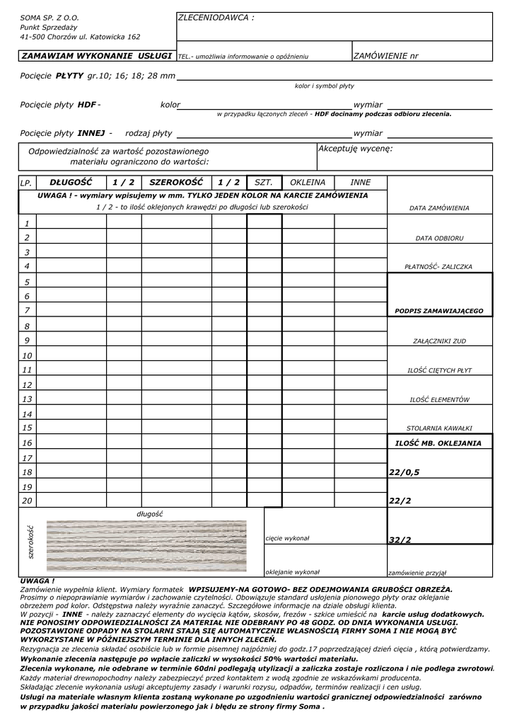 SOMA SP. Z O.O. Punkt Sprzedaży 41-500 Chorzów ul. Katowicka 162 ZLECENIODAWCA : ZAMAWIAM WYKONANIE USŁUGI TEL.- umożliwia informowanie o opóźnieniu ZAMÓWIENIE nr Pocięcie PŁYTY gr.10; 16; 18; 28 mm kolor i symbol płyty Pocięcie płyty HDF - kolor wymiar w przypadku łączonych zleceń - HDF docinamy podczas odbioru zlecenia. Pocięcie płyty INNEJ - rodzaj płyty wymiar Akceptuję wycenę: Odpowiedzialność za wartość pozostawionego materiału ograniczono do wartości: LP. DŁUGOŚĆ 1/2 SZEROKOŚĆ 1/2 SZT. OKLEINA INNE UWAGA ! - wymiary wpisujemy w mm. TYLKO JEDEN KOLOR NA KARCIE ZAMÓWIENIA 1 / 2 - to ilość oklejonych krawędzi po długości lub szerokości DATA ZAMÓWIENIA 1 2 DATA ODBIORU 3 4 PŁATNOŚĆ- ZALICZKA 5 6 7 PODPIS ZAMAWIAJĄCEGO 8 9 ZAŁĄCZNIKI ZUD 10 11 ILOŚĆ CIĘTYCH PŁYT 12 13 ILOŚĆ ELEMENTÓW 14 15 STOLARNIA KAWAŁKI 16 ILOŚĆ MB. OKLEJANIA 17 18 22/0,5 19 20 22/2 szerokość długość cięcie wykonał 32/2 oklejanie wykonał zamówienie przyjął UWAGA ! Zamówienie wypełnia klient. Wymiary formatek WPISUJEMY-NA GOTOWO- BEZ ODEJMOWANIA GRUBOŚCI OBRZEŻA. Prosimy o niepoprawianie wymiarów i zachowanie czytelności. Obowiązuje standard usłojenia pionowego płyty oraz oklejanie obrzeżem pod kolor. Odstępstwa należy wyraźnie zanaczyć. Szczegółowe informacje na dziale obsługi klienta. W pozycji - INNE - należy zaznaczyć elementy do wycięcia kątów, skosów, frezów - szkice umieścić na karcie usług dodatkowych. NIE PONOSIMY ODPOWIEDZIALNOŚCI ZA MATERIAŁ NIE ODEBRANY PO 48 GODZ. OD DNIA WYKONANIA USŁUGI. POZOSTAWIONE ODPADY NA STOLARNI STAJĄ SIĘ AUTOMATYCZNIE WŁASNOŚCIĄ FIRMY SOMA I NIE MOGĄ BYĆ WYKORZYSTANE W PÓŻNIEJSZYM TERMINIE DLA INNYCH ZLECEŃ. Rezygnacja ze zlecenia składać osobiście lub w formie pisemnej najpóżniej do godz.17 poprzedzającej dzień cięcia , którą potwierdzamy. Wykonanie zlecenia następuje po wpłacie zaliczki w wysokości 50% wartości materiału. Zlecenia wykonane, nie odebrane w terminie 60dni podlegają utylizacji a zaliczka zostaje rozliczona i nie podlega zwrotowi. Każdy materiał drewnopochodny należy zabezpieczyć przed kontaktem z wodą zgodnie ze wskazówkami producenta. Składając zlecenie wykonania usługi akceptujemy zasady i warunki rozysu, odpadów, terminów realizacji i cen usług. Usługi na materiale własnym klienta zostaną wykonane po uzgodnieniu wartości granicznej odpowiedzialności zarówno w przypadku jakości materiału powierzonego jak i błędu ze strony firmy Soma .