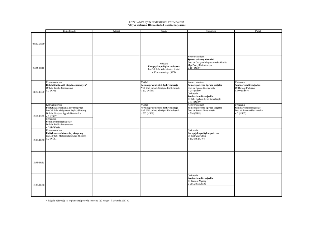 ROZKŁAD ZAJĘĆ W SEMESTRZE LETNIM 2016/17 Polityka społeczna, III rok, studia I stopnia, stacjonarne Poniedziałek Wtorek Środa Czwartek Piątek 08:00-09:30 Wykład Europejska polityka społeczna Prof. dr hab. Włodzimierz Anioł s. Czarnowskiego (KP3) 09:45-11:15 Konwersatorium Rehabilitacja osób niepełnosprawnych* Dr hab. Emilia Jaroszewska 11:30-13:00 s. 2 (KP3) Wykład Równouprawnienie i dyskryminacja Prof. UW, dr hab. Grażyna Firlit-Fesnak s. 202 (NŚ69) Konwersatorium Polityka zatrudnienia i rynku pracy Prof. dr hab. Małgorzata Szylko-Skoczny Dr hab. Grażyna Spytek-Bandurska 13:15-14:45 s. 2 (NŚ67) Ćwiczenia Seminarium licencjackie Dr hab. Emilia Jaroszewska s. 334 (NŚ69) Konwersatorium Polityka zatrudnienia i rynku pracy Prof. dr hab. Małgorzata Szylko-Skoczny s. 2 (NŚ67) 15:00-16:30 Wykład Równouprawnienie i dyskryminacja Prof. UW, dr hab. Grażyna Firlit-Fesnak s. 202 (NŚ69) Konwersatorium System ochrony zdrowia* Doc. dr Grażyna Magnuszewska-Otulak Mgr Paweł Kaźmierczyk s. 101 (NŚ67) Konwersatorium Pomoc społeczna i praca socjalna Doc. dr Renata Gierszewska s. 214 (NŚ69) Ćwiczenia Seminarium licencjackie Dr hab. Barbara Rysz-Kowalczyk s. 334 (NŚ69) Konwersatorium Pomoc społeczna i praca socjalna Doc. dr Renata Gierszewska s. 214 (NŚ69) Ćwiczenia Europejska polityka społeczna Dr Piotr Zawadzki s. 112 (St. BUW) 16:45-18:15 Ćwiczenia Seminarium licencjackie Dr Tomasz Mering s. 205/206 (NŚ69) 18:30-20:00 * Zajęcia odbywają się w pierwszej połowie semestru (20 lutego - 7 kwietnia 2017 r.) Ćwiczenia Seminarium licencjackie Dr Bartosz Pieliński s. 109 (NŚ67) Ćwiczenia Seminarium licencjackie Doc. dr Renata Gierszewska s. 2 (NŚ67)