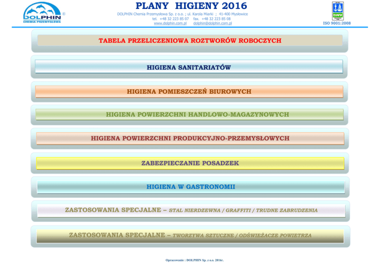 PLANY HIGIENY 2016 ® DOLPHIN Chemia Przemysłowa Sp. z o.o. ; ul. Karola Miarki ; 41-400 Mysłowice tel. +48 32 223 85 07 fax. +48 32 223 85 08 www.dolphin.com.pl [email protected] TABELA PRZELICZENIOWA ROZTWORÓW ROBOCZYCH HIGIENA SANITARIATÓW HIGIENA POMIESZCZEŃ BIUROWYCH HIGIENA POWIERZCHNI HANDLOWO-MAGAZYNOWYCH HIGIENA POWIERZCHNI PRODUKCYJNO-PRZEMYSŁOWYCH ZABEZPIECZANIE POSADZEK HIGIENA W GASTRONOMII ZASTOSOWANIA SPECJALNE – STAL NIERDZEWNA / GRAFFITI / TRUDNE ZABRUDZENIA ZASTOSOWANIA SPECJALNE – TWORZYWA SZTUCZNE / ODŚWIEŻACZE POWIETRZA Opracowanie : DOLPHIN Sp. z o.o. 2016r. ISO 9001:2008 PLANY HIGIENY 2016 ® DOLPHIN Chemia Przemysłowa Sp. z o.o. ; ul. Karola Miarki ; 41-400 Mysłowice tel. +48 32 223 85 07 fax. +48 32 223 85 08 www.dolphin.com.pl [email protected] ISO 9001:2008 TABELA PRZELICZENIOWA ROZTWORÓW ROBOCZYCH Rozcieńczenie 1:400 1:200 1:100 1:75 1:50 1:40 1:33 1:10 1:3 0,25% 0,5% 1% 1,5% 2% 2,5% 3% 10% 30% 1 litr 2,5 ml 5 ml 10 ml 15 ml 20 ml 25 ml 30 ml 100 ml 300 ml 5 litrów 12,5 ml 25 ml 37,5 ml 75 ml 100 ml 125 ml 150 ml 500 ml 1500 ml 10 litrów 25 ml 50 ml 100 ml 150 ml 200 ml 250 ml 300 ml 1000 ml 3000 ml 50 litrów 125 ml 25 ml 50 ml 75 ml 1000 ml 1250 ml 1500 ml 5000 ml 15000 ml 80 litrów 200 ml 400 ml 800 ml 1200 ml 1600 ml 2000 ml 2400 ml 8000 ml 24000 ml 120 litrów 300 ml 600 ml 1200 ml 1800 ml 2400 ml 3000 ml 3600 ml 12000 ml 36000 ml Stężenie w % Ilość roztworu Opracowanie : DOLPHIN Sp. z o.o. 2016r. PLANY HIGIENY 2016 ® DOLPHIN Chemia Przemysłowa Sp. z o.o. ; ul. Karola Miarki ; 41-400 Mysłowice tel. +48 32 223 85 07 fax. +48 32 223 85 08 www.dolphin.com.pl [email protected] ISO 9001:2008 HIGIENA SANITARIATÓW Jaka powierzchnia ? Powierzchnie ceramiczne …………………………………. Pow. ceramiczne emaliowane, armatura Powierzchnie ceramiczne, PCV, posadzka i glazura ścienna Powierzchnie ceramiczne, PCV emaliowane glazura ścienna, armatura Powierzchnie ceramiczne, posadzka i glazura ścienna Co chcemy osiągnąć ? Usuwanie zanieczyszczeń organicznych i nieorganicznych, dezynfekcja, eliminacja przykrych zapachów w sanitariatach Usuwanie zanieczyszczeń organicznych i nieorganicznych, dezynfekcja, eliminacja przykrych zapachów w sanitariatach Usuwanie zanieczyszczeń organicznych i nieorganicznych /kamień, rdza, resztki mydła/, wszelkich powierzchni w sanitariatach Gruntowne doczyszczanie zanieczyszczeń nieorganicznych i organicznych /kamień, rdza, cement/ w sanitariatach Którym środkiem? W jakim stężeniu? Jak często stosować ? SANI ACID fresh gel* SANI ACID fresh dry* / kwaśne / Koncentrat Codziennie wg potrzeb SANI MAX gel / zasadowy / SANI CLEAN fresh nano* / kwaśny / SANI POWER Koncentrat rozprowadzić pod górną krawędzią pisuaru, bidetu lub muszli klozetowej, pozostawić na kilka minut i spłukać wodą *nowa linia Fresh line ……………………………………………………………………………………………. Koncentrat rozprowadzić pod górną krawędzią pisuaru lub muszli klozetowej , pozostawić na kilka minut i spłukać …………………………………….. SANI ACID fresh dry* Jak to zrobić najlepiej ? Roztwór: 0,5-2% /pozostałe powierzchnie/ Codziennie wg potrzeb Gotowy do użycia Codziennie wg potrzeb Koncentrat: /pisuary muszle klozetowe lub roztwór: 1-3% /pozostałe powierzchnie/ Opracowanie : DOLPHIN Sp. z o.o. 2016r. Codziennie Cyklicznie wg potrzeb Przygotować roztwór mx 50-200ml koncentratu na 10 l wody - myć mopem *nowa linia Fresh line Rozprowadzić z atomizera ,pozostawić chwilę następnie przetrzeć suchą szmatką lub czyściwem do sucha *nowa linia Fresh Line Koncentrat rozprowadzić i pozostawić jak powyżej, obficie spłukując po ok.10 min. Pozostałe powierzchnie: - przygotować roztwór mx 100-200ml koncentratu na 10 l wody (300ml do usuwania cementu) - myć mopem, pozostawiając na kilka minut - przetrzeć po uprzednim wypłukaniu PLANY HIGIENY 2016 ® DOLPHIN Chemia Przemysłowa Sp. z o.o. ; ul. Karola Miarki ; 41-400 Mysłowice tel. +48 32 223 85 07 fax. +48 32 223 85 08 www.dolphin.com.pl [email protected] ISO 9001:2008 HIGIENA POMIESZCZEŃ BIUROWYCH Jaka powierzchnia ? Co chcemy osiągnąć? Powierzchnie zmywalne, ceramiczne, szklane, glazura, meblowe, drewniane i PCV Uniwersalne mycie, pielęgnacja i nabłyszczenie, antystatyczność, przyspieszone wysychanie powierzchni ponadpodłogowych Powierzchnie szklane i szkliwione, inne przeszklenia z tworzyw sztucznych Czyszczenie i Pielęgnacja powierzchni szklanych i szkliwionych Wodoodporne powierzchnie zmywalne posadzkowe, meblowe i PCV Uniwersalne mycie, pielęgnacja i wybłyszczenie, szybkie odparowanie powierzchni podłogowych i ponadpodłogowych Wodoodporne posadzki kamienne i PCV Ręczne mycie i pielęgnacja posadzek, przyspieszone wysychanie powierzchni podłogowych Którym środkiem? ECO UNIVERSAL lub UNIVERSAL Clean lub UNIVERSAL Clean citro W jakim stężeniu? Gotowy do użycia ECO CRYSTAL lub CRYSTAL nano Gotowy do użycia …………………………………… ………………………… SUPER CRYSTAL Roztwór: 1-1,5% Jak często stosować ? Codziennie wg potrzeb Wg potrzeb Jak to zrobić najlepiej ? Za pomocą spryskiwacza pokryć równomiernie rosą czyszczoną powierzchnię wytrzeć do sucha czystą ścierką lub czyściwem papierowym. Gotowe preparaty: - za pomocą spryskiwacza pokryć równomiernie rosą czyszczoną powierzchnię - wytrzeć do sucha czystą ścierką lub czyściwem papierowym. ………………………………………………………………………………………. Koncentrat: - przygotować mx 100-150ml koncentratu na 10l wody demineralizowanej i …jak wyżej Mycie ręczne: - przygotować roztwór: 25-50ml/10l wody - myć powierzchnię mopem UNIVERSL Extra lub UNIVERSAL Citro Roztwór: 0,25-0,5% FLOOR Clean / FLOOR Clean fresh* Roztwór: 0,5-1% Opracowanie : DOLPHIN Sp. z o.o. 2016r. Codziennie Codziennie Mycie maszynowe: - prz