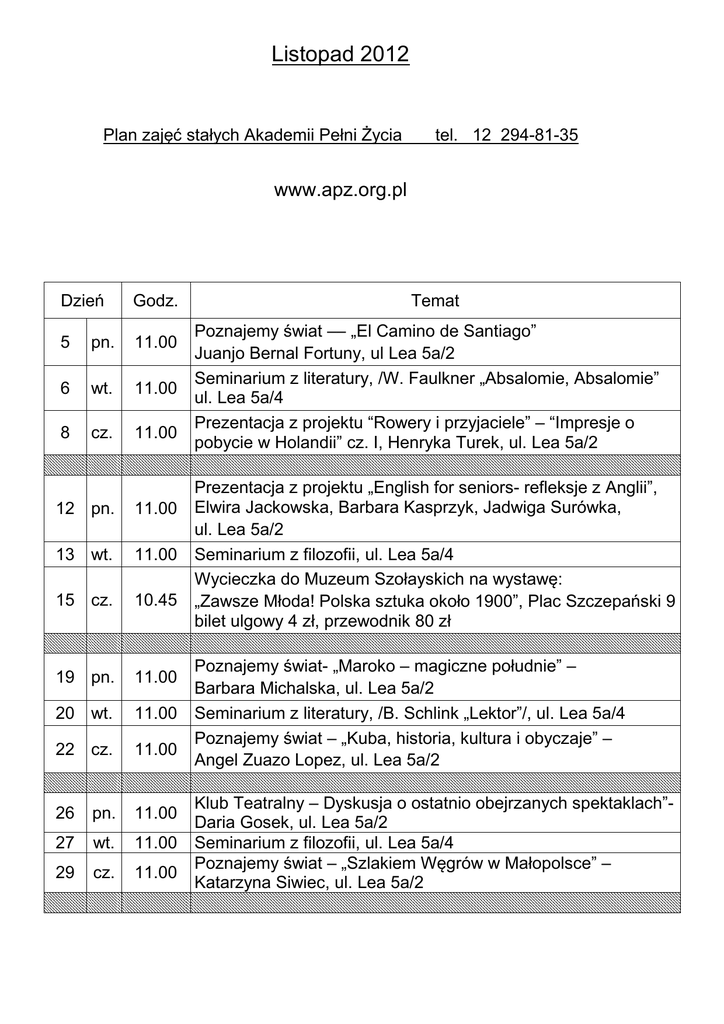 Listopad 2012 Plan zajęć stałych Akademii Pełni Życia tel. 12 294-81-35 www.apz.org.pl Dzień Godz. 5 pn. 11.00 6 wt. 11.00 8 cz. 11.00 12 pn. 11.00 13 wt. 11.00 15 cz. 10.45 19 pn. 11.00 20 wt. 11.00 22 cz. 11.00 26 pn. 11.00 27 wt. 11.00 29 cz. 11.00 Temat Poznajemy świat –– „El Camino de Santiago” Juanjo Bernal Fortuny, ul Lea 5a/2 Seminarium z literatury, /W. Faulkner „Absalomie, Absalomie” ul. Lea 5a/4 Prezentacja z projektu “Rowery i przyjaciele” – “Impresje o pobycie w Holandii” cz. I, Henryka Turek, ul. Lea 5a/2 Prezentacja z projektu „English for seniors- refleksje z Anglii”, Elwira Jackowska, Barbara Kasprzyk, Jadwiga Surówka, ul. Lea 5a/2 Seminarium z filozofii, ul. Lea 5a/4 Wycieczka do Muzeum Szołayskich na wystawę: „Zawsze Młoda! Polska sztuka około 1900”, Plac Szczepański 9 bilet ulgowy 4 zł, przewodnik 80 zł Poznajemy świat- „Maroko – magiczne południe” – Barbara Michalska, ul. Lea 5a/2 Seminarium z literatury, /B. Schlink „Lektor”/, ul. Lea 5a/4 Poznajemy świat – „Kuba, historia, kultura i obyczaje” – Angel Zuazo Lopez, ul. Lea 5a/2 Klub Teatralny – Dyskusja o ostatnio obejrzanych spektaklach”Daria Gosek, ul. Lea 5a/2 Seminarium z filozofii, ul. Lea 5a/4 Poznajemy świat – „Szlakiem Węgrów w Małopolsce” – Katarzyna Siwiec, ul. Lea 5a/2