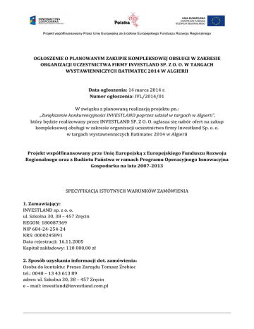 Projekt współfinansowany Przez Unię Europejską ze środków Europejskiego Funduszu Rozwoju Regionalnego OGŁOSZENIE O PLANOWANYM ZAKUPIE KOMPLEKSOWEJ OBSŁUGI W ZAKRESIE ORGANIZACJI UCZESTNICTWA FIRMY INVESTLAND SP. Z O. O. W TARGACH WYSTAWIENNICZYCH BATIMATEC 2014 W ALGIERII Data ogłoszenia: 14 marca 2014 r. Numer ogłoszenia: IVL/2014/01 W związku z planowaną realizacją projektu pn.: „Zwiększenie konkurencyjności INVESTLAND poprzez udział w targach w Algierii”, który będzie realizowany przez INVESTLAND SP. Z O. O. ogłasza się nabór ofert na zakup kompleksowej obsługi w zakresie organizacji uczestnictwa firmy Investland Sp. o. o. w targach wystawienniczych Batimatec 2014 w Algierii Projekt współfinansowany prze Unię Europejską z Europejskiego Funduszu Rozwoju Regionalnego oraz z Budżetu Państwa w ramach Programu Operacyjnego Innowacyjna Gospodarka na lata 2007-2013 SPECYFIKACJA ISTOTNYCH WARUNKÓW ZAMÓWIENIA 1. Zamawiający: INVESTLAND sp. z o. o. ul. Szkolna 30, 38 – 457 Zręcin REGON: 180087369 NIP 684-24-254-24 KRS: 0000245891 Data rejestracji: 16.11.2005 Kapitał zakładowy: 110 000,00 zł 2. Sposób uzyskania informacji dot. zamówienia: Osoba do kontaktu: Prezes Zarządu Tomasz Źrebiec tel.: 0048 – 13 43 613 89 adres: ul. Szkolna 30, 38 – 457 Zręcin e – mail: [email protected] Projekt współfinansowany Przez Unię Europejską ze środków Europejskiego Funduszu Rozwoju Regionalnego 3. Opis przedmiotu zamówienia: Przedmiotem zamówienia jest kompleksowa usługa w zakresie realizacji udziału firmy Investland w targach w ramach projektu „Zwiększenie konkurencyjności INVESTLAND poprzez udział w targach w Algierii”, w szczególności: 3.1. 3.2. 3.3. 3.4. 3.5. 3.6. 3.7. 3.8. 3.9. 3.10. 3.11. 3.12. 3.13. 3.14. 3.15. 3.16. 3.17. 3.18. 3.19. Organizacja przelotu (bilety lotnicze dla dwóch przedstawicieli Zamawiającego uczestniczących w targach) Organizacja noclegu dla dwóch przedstawicieli Zamawiającego uczestniczących w targach, w okresie jeden dzień przed rozpoczęciem Wynajem powierzchni wystawienniczej Wynajem zabudowy powierzchni wystawienniczej Obsługa techniczna w obrębie powierzchni wystawienniczej Wpis do katalogu targowego, pokrycie opłat rejestracyjnych Transport i spedycja eksponatów wraz z ubezpieczeniem i odprawą celną Organizacja pokazów, prezentacji produktów Organizacja udziału w spotkaniach bilateralnych i wyjazdach studyjnych Organizacja udziału zamawiającego w szkoleniach Tłumaczenie symultaniczne lub konsekutywne Produkcja i emisja reklamy w mediach targowych Przygotowanie i wydruk katalogów i broszur promocyjnych oraz tłumaczenia tych materiałów Przygotowanie materiałów reklamowych Przygotowanie/ publikacja reklam i informacji prasowych Produkcja i emisja kampanii reklamowej Usługi doradcze i prawne związane z uzyskaniem wprowadzenia towarów na rynek algierski Przygotowanie i tłumaczenie dokumentacji technicznej Promocja programu 4. Kryteria oceny ofert: 4.1 Cena – 100% 5. Miejsce i termin składania ofert: 5.1. Adres siedziby: ul. Szkolna 30, 38 – 457 Zręcin 5.2. Termin: do 24.03.2014 r. 5.3. Oferty w formie pisemnej należy składać osobiście lub drogą pocztową na adres siedziby spółki „INVESTLAND Sp. z o.o. Oferta powinna zostać umieszczona w zamkniętej kopercie, na której będą znajdować się dane adresowe Oferenta (pieczęć Projekt współfinansowany Przez Unię Europejską ze środków Europejskiego Funduszu Rozwoju Regionalnego firmowa w prawym górnym rogu koperty), Zamawiającego oraz adnotacja: „Konkurs ofert na zakup kompleksowej obsługi w zakresie organizacji uczestnictwa firmy Investland Sp. z o. o. w targach wystawienniczych BATIMATEC 2014 w Algierii do projektu pn. „Zwiększenie konkurencyjności INVESTLAND poprzez udział w targach w Algierii”. Nie otwierać przed dniem 24.03.2014 r., godz. 12.00.” 6. Pozostałe informacje: 6.1. Oferty muszą zawierać: - nazwę i adres Oferenta - datę sporządzenia oferty, - opis nawiązujący do przedmiotu oferty i kryteriów wyszczególnionych w zapytaniu ofertowym - ceny za realizację poszczególnych działań wymienionych w punkcie 3 niniejszego Zapytania Ofertowego oraz wartość całkowitą oferty - warunki i terminy płatności - termin ważności oferty - oświadczenie dotyczące posiadania wiedzy i doświadczenia umożliwiającego realizację zamówienia - podpis osoby lub osób uprawnionych do reprezentowania Oferenta wraz z pieczątką imienną lub służbową i firmową. Z wybranym w postępowaniu Oferentem zostanie podpisana umowa wykonawstwa. 6.2. Nie dopuszcza się składania ofert cząstkowych 6.3. Nie dopuszcza się składania ofert warunkowych i wariantowych 6.4. Wszelkie koszty związane z udziałem Oferenta w niniejszym postępowaniu ponosi Oferent. 6.5. Wybór dostawców nastąpi w oparciu o najbardziej korzystne ekonomicznie oferty w oparciu o punkt 4. niniejszego ogłoszenia – Kryteria oceny ofert, z zachowaniem zasad jawności, przejrzystości i uczciwej konkurencji. 6.6. Zamawiający zastrzega sobie prawo do rezygnacji z części zamówienia, o czym poinformuje Wykonawcę, z którym podpisze umowę, niezwłocznie po wystąpieniu okoliczności powodujących taka decyzję. 6.7. Ewentualne zmiany w harmonogramie realizacji zamówienia niezależne od Zamawiającego, a podyktowane na przykład zmianami wprowadzonymi przez organizatora imprezy wystawienniczej muszą być respektowane przed Wykonawcę. Wykonawca zostanie pisemnie poinformowany o ww. zmianach niezwłocznie po ich pojawieniu się. Projekt współfinansowany Przez Unię Europejską ze środków Europejskiego Funduszu Rozwoju Regionalnego Załączniki: 1) Szczegółowa specyfikacja i opis zakresu zamówienia 2) Proponowany wzór składanej Oferty Z poważaniem ZARZĄD INVESTLAND SP. Z O. O.