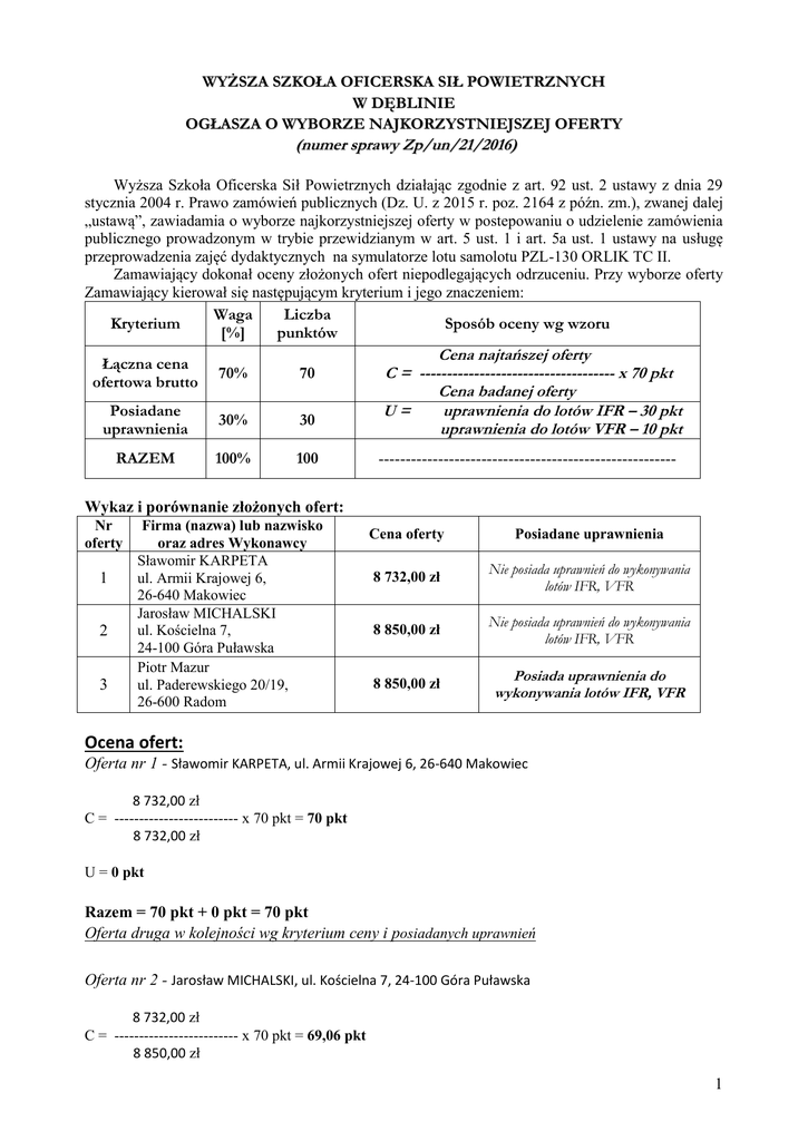 WYŻSZA SZKOŁA OFICERSKA SIŁ POWIETRZNYCH W DĘBLINIE OGŁASZA O WYBORZE NAJKORZYSTNIEJSZEJ OFERTY (numer sprawy Zp/un/21/2016) Wyższa Szkoła Oficerska Sił Powietrznych działając zgodnie z art. 92 ust. 2 ustawy z dnia 29 stycznia 2004 r. Prawo zamówień publicznych (Dz. U. z 2015 r. poz. 2164 z późn. zm.), zwanej dalej „ustawą”, zawiadamia o wyborze najkorzystniejszej oferty w postepowaniu o udzielenie zamówienia publicznego prowadzonym w trybie przewidzianym w art. 5 ust. 1 i art. 5a ust. 1 ustawy na usługę przeprowadzenia zajęć dydaktycznych na symulatorze lotu samolotu PZL-130 ORLIK TC II. Zamawiający dokonał oceny złożonych ofert niepodlegających odrzuceniu. Przy wyborze oferty Zamawiający kierował się następującym kryterium i jego znaczeniem: Waga Liczba Kryterium Sposób oceny wg wzoru [%] punktów Łączna cena ofertowa brutto 70% 70 Posiadane uprawnienia 30% 30 RAZEM 100% 100 Cena najtańszej oferty C = ------------------------------------ x 70 pkt Cena badanej oferty U= uprawnienia do lotów IFR – 30 pkt uprawnienia do lotów VFR – 10 pkt ------------------------------------------------------- Wykaz i porównanie złożonych ofert: Nr oferty 1 2 3 Firma (nazwa) lub nazwisko oraz adres Wykonawcy Sławomir KARPETA ul. Armii Krajowej 6, 26-640 Makowiec Jarosław MICHALSKI ul. Kościelna 7, 24-100 Góra Puławska Piotr Mazur ul. Paderewskiego 20/19, 26-600 Radom Cena oferty Posiadane uprawnienia 8 732,00 zł Nie posiada uprawnień do wykonywania lotów IFR, VFR 8 850,00 zł Nie posiada uprawnień do wykonywania lotów IFR, VFR 8 850,00 zł Posiada uprawnienia do wykonywania lotów IFR, VFR Ocena ofert: Oferta nr 1 - Sławomir KARPETA, ul. Armii Krajowej 6, 26-640 Makowiec 8 732,00 zł C = ------------------------- x 70 pkt = 70 pkt 8 732,00 zł U = 0 pkt Razem = 70 pkt + 0 pkt = 70 pkt Oferta druga w kolejności wg kryterium ceny i posiadanych uprawnień Oferta nr 2 - Jarosław MICHALSKI, ul. Kościelna 7, 24-100 Góra Puławska 8 732,00 zł C = ------------------------- x 70 pkt = 69,06 pkt 8 850,00 zł 1 U = 0 pkt Razem = 69,06 pkt + 0 pkt = 69,06 pkt Oferta trzecia w kolejności wg kryterium ceny i posiadanych uprawnień Oferta nr 3 - Piotr Mazur, ul. Paderewskiego 20/19, 26-600 Radom 8 732,00 zł C = ------------------------- x 70 pkt = 69,06 pkt 8 850,00 zł U = 30 pkt Razem = 69,06 pkt + 30 pkt = 99,06 pkt Oferta pierwsza w kolejności wg kryterium ceny i posiadanych uprawnień Z przedmiotowego postępowania nie wykluczono żadnego Wykonawcy. W toku postępowania nie odrzucono żadnej oferty. Data publikacji ogłoszenia: 01 marca 2016 r. KANCLERZ Wyższej Szkoły Oficerskiej Sił Powietrznych mgr Waldemar BIENIEK 2