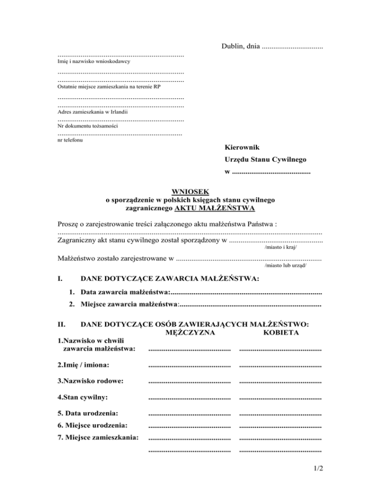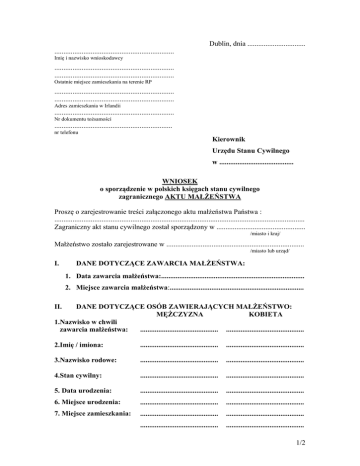 Dublin, dnia ................................ .................................................................. Imię i nazwisko wnioskodawcy .................................................................. .................................................................. Ostatnie miejsce zamieszkania na terenie RP .................................................................. .................................................................. Adres zamieszkania w Irlandii .................................................................. Nr dokumentu tożsamości ................................................................. nr telefonu Kierownik Urzędu Stanu Cywilnego w ......................................... WNIOSEK o sporządzenie w polskich księgach stanu cywilnego zagranicznego AKTU MAŁŻEŃSTWA Proszę o zarejestrowanie treści załączonego aktu małżeństwa Państwa : .......................................................................................................................................... Zagraniczny akt stanu cywilnego został sporządzony w ................................................. /miasto i kraj/ Małżeństwo zostało zarejestrowane w ............................................................................ /miasto lub urząd/ I. DANE DOTYCZĄCE ZAWARCIA MAŁŻEŃSTWA: 1. Data zawarcia małżeństwa:............................................................................... 2. Miejsce zawarcia małżeństwa:.......................................................................... DANE DOTYCZĄCE OSÓB ZAWIERAJĄCYCH MAŁŻEŃSTWO: MĘŻCZYZNA KOBIETA 1.Nazwisko w chwili zawarcia małżeństwa: ........................................... ........................................... II. 2.Imię / imiona: ........................................... ........................................... 3.Nazwisko rodowe: ........................................... ........................................... 4.Stan cywilny: ........................................... ........................................... 5. Data urodzenia: ........................................... ........................................... 6. Miejsce urodzenia: ........................................... ........................................... 7. Miejsce zamieszkania: ........................................... ........................................... ........................................... ........................................... 1/2 III. DANE DOTYCZĄCE MAŁŻEŃSTWO: RODZICÓW OSÓB ZAWIERAJĄCYCH MĘŻCZYZNA KOBIETA 8.Nazwisko rodowe ojca ............................................ ............................................ 9.Imię / imiona ............................................ ............................................ 10.Nazwisko rodowe matki ............................................ ............................................ 11.Imię / imiona matki ............................................ IV. ............................................ NAZWISKA NOSZONE PO ZAWARCIU MAŁŻEŃSTWA 12. Mężczyzny 13. Kobiety 14. Dzieci ....................................................................................................... ....................................................................................................... ....................................................................................................... Oświadczam, że ten akt nie został zarejestrowany w księgach stanu cywilnego na terenie RP. Wnioskodawca: osoba, której dotyczy akt, jej ojciec, matka, brat, siostra, mąż, żona, syn, córka, dziadek, babcia, wnuk oraz osoba, która wykaże interes prawny. UWAGA: DEKLAROWANE DANE, KTÓRE NIE WYSTEPUJĄ W PZREDŁOŻONYM AKCIE MAŁŻEŃSTWA, MOGĄ ZOSTAĆ WPISANE DO POLSKICH KSIĄG S.C., JEŻELI ZOSTANĄ POTWIERDZONE PRZEZ DODATKOWE DOKUMENTY UZUPEŁNIAJĄCE. A.PROSZĘ O UZUPEŁNIENIE BRAKUJĄCYCH W ORYGINALNYM AKCIE DANYCH OSOBOWYCH POPRZEZ WPISANIE:...................................................... .......................................................................................................................................... .......................................................................................................................................... .......................................................................................................................................... B.PROSZĘ O SPROSTOWANIE AKTU MAŁŻEŃSTWA W ZAKRESIE: .......................................................................................................................................... .......................................................................................................................................... C.PROSZĘ O ZASTOSOWANIE POLSKICH ZNAKÓW DIAKRETYCZNYCH NA PODSTAWIE AKTÓW URODZENIA. PROSZĘ O ZASTOSOWANIE NASTĘPUJĄCEJ PISOWNI IMION I NAZWISK:....................................................... .......................................................................................................................................... .......................................................................................................................................... D.ZOSTAŁEM POINFORMOWANY O MOŻLIWOŚCI UZUPEŁNIENIA / SPROSTOWANIA AKTU. REZYGNUJĘ Z POWYŻSZYCH CZYNNOŚCI* ....................................................... /podpis wnioskodawcy/ * w przypadku rezygnacji z czynności uzupełnienia lub prostowania należy skreślić punkty A, B, C i zaznaczyć pkt. D 2/2