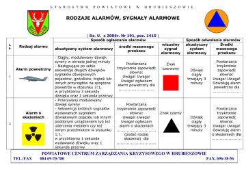 S T A R O S T W O P O W I A T O W E W H R U B I E S Z O W I E RODZAJE ALARMÓW, SYGNAŁY ALARMOWE ( Dz. U. z 2006r. Nr 191, poz. 1415 ) Sposób ogłaszania alarmów L. p. Rodzaj alarmu Alarm powietrzny 1 Alarm o skaŜeniach 2 akustyczny system alarmowy - Ciągły, modulowany dźwięk syreny w okresie jednej minuty - Następujące po sobie sekwencje długich dźwięków sygnałów dźwiękowych pojazdów, gwizdków, trąbek lub innych przyrządów na spręŜone powietrze w stosunku 3:1, w przybliŜeniu 3 sekundy dźwięku oraz 1 sekunda przerwy - Przerywany modulowany dźwięk syreny - Sekwencja krótkich sygnałów wydawanych sygnałem dźwiękowym pojazdu lub innym podobnym urządzeniem lub teŜ uderzenia metalem czy teŜ innym przedmiotem w stosunku 1:1, w przybliŜeniu 1 sekunda wydawania dźwięku oraz 1 sekunda przerwy środki masowego przekazu Powtarzana trzykrotnie zapowiedź słowna: Uwaga! Uwaga! Uwaga! ogłaszam alarm powietrzny dla ............................ Powtarzana trzykrotnie zapowiedź słowna: Uwaga! Uwaga! Uwaga! ogłaszam alarm o skaŜeniach ............................... (podać rodzaj skaŜenia) dla ............................... wizualny sygnał alarmowy Znak czerwony Sposób odwołania alarmów akustyczny Środki system masowego alarmowy przekazu Dźwięk ciągły trwający 3 minuty Powtarzana trzykrotnie zapowiedź słowna: Uwaga! Uwaga! Odwołuję alarm powietrzny dla ...................... Dźwięk ciągły trwający 3 minuty Powtarzana trzykrotnie zapowiedź słowna: Uwaga! Uwaga! Odwołuję alarm o skaŜeniach dla ....................... Znak czarny POWIATOWE CENTRUM ZARZĄDZANIA KRYZYSOWEGO W HRUBIESZOWIE TEL./FAX 084 69-70-780 FAX. 696-38-56 S T A R O S T W O P O W I A T O W E W H R U B I E S Z O W I E KOMUNIKATY OSTRZEGAWCZE L.p. Rodzaj komunikatu 1 Uprzedzenie o zagroŜeniu skaŜeniami 2 Uprzedzenie o zagroŜeniu zakaŜeniami 3 ( Dz. U. z 2006r. Nr 191, poz. 1415 ) Sposób ogłaszania komunikatu Sposób odwołania komunikatu akustyczny akustyczny środki masowego przekazu środki masowego przekazu system system alarmowy alarmowy Powtarzana trzykrotnie zapowiedź Powtarzana trzykrotnie słowna: Uwaga! Uwaga! Osoby znajdujące się zapowiedź słowna: Uwaga! Uwaga! Odwołuję uprzedzenie na terenie .................. około ----godz......... min.......... moŜe nastąpić o zagroŜeniu .................... skaŜenie ..................... (podać (rodzaj skaŜenia) rodzaj skaŜenia) w kierunku dla .............................. ........................ (podać kierunek) Uprzedzenie o klęskach Ŝywiołowych i zagroŜeniu środowiska --- Formy i treść komunikatu uprzedzenia o zagroŜeniu zakaŜeniami ustalają organy Państwowej Inspekcji Sanitarnej --- Powtarzana trzykrotnie zapowiedź słowna: Informacja o zagroŜeniu i sposobie postępowania mieszkańców --- --- --- Powtarzana trzykrotnie zapowiedź słowna: Uwaga! Uwaga! Odwołuję alarm o klęskach ............ dla .......... POWIATOWE CENTRUM ZARZĄDZANIA KRYZYSOWEGO W HRUBIESZOWIE TEL./FAX 084 69-70-780 FAX. 696-38-56