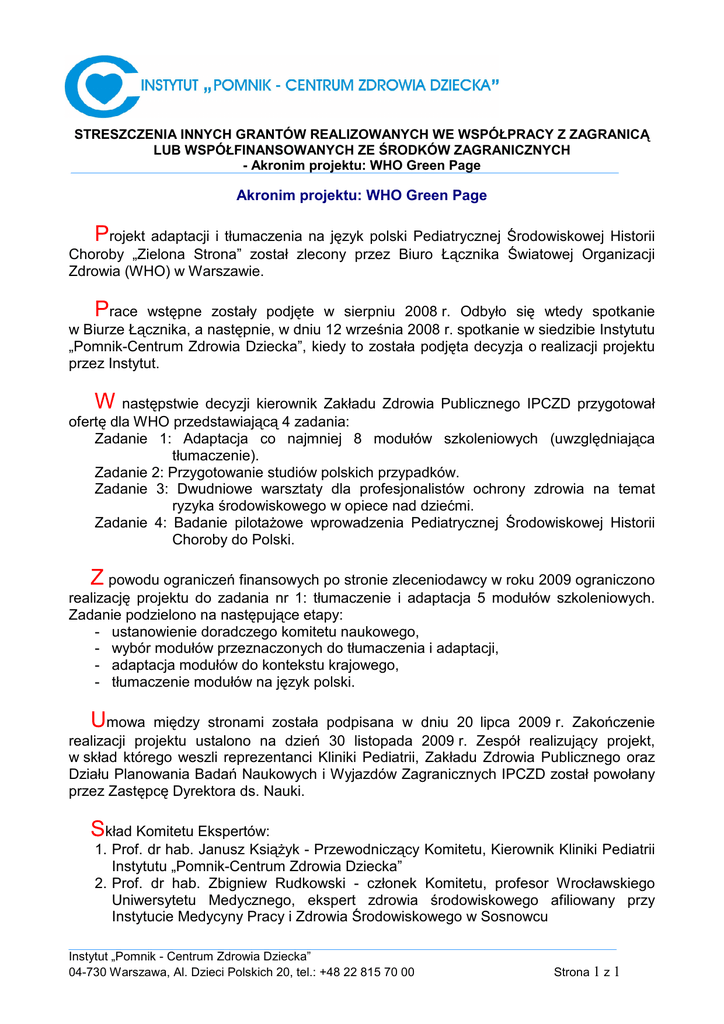 STRESZCZENIA INNYCH GRANTÓW REALIZOWANYCH WE WSPÓŁPRACY Z ZAGRANICĄ LUB WSPÓŁFINANSOWANYCH ZE ŚRODKÓW ZAGRANICZNYCH - Akronim projektu: WHO Green Page Akronim projektu: WHO Green Page Projekt adaptacji i tłumaczenia na język polski Pediatrycznej Środowiskowej Historii Choroby „Zielona Strona” został zlecony przez Biuro Łącznika Światowej Organizacji Zdrowia (WHO) w Warszawie. Prace wstępne zostały podjęte w sierpniu 2008 r. Odbyło się wtedy spotkanie w Biurze Łącznika, a następnie, w dniu 12 września 2008 r. spotkanie w siedzibie Instytutu „Pomnik-Centrum Zdrowia Dziecka”, kiedy to została podjęta decyzja o realizacji projektu przez Instytut. W następstwie decyzji kierownik Zakładu Zdrowia Publicznego IPCZD przygotował ofertę dla WHO przedstawiającą 4 zadania: Zadanie 1: Adaptacja co najmniej 8 modułów szkoleniowych (uwzględniająca tłumaczenie). Zadanie 2: Przygotowanie studiów polskich przypadków. Zadanie 3: Dwudniowe warsztaty dla profesjonalistów ochrony zdrowia na temat ryzyka środowiskowego w opiece nad dziećmi. Zadanie 4: Badanie pilotaŜowe wprowadzenia Pediatrycznej Środowiskowej Historii Choroby do Polski. Z powodu ograniczeń finansowych po stronie zleceniodawcy w roku 2009 ograniczono realizację projektu do zadania nr 1: tłumaczenie i adaptacja 5 modułów szkoleniowych. Zadanie podzielono na następujące etapy: - ustanowienie doradczego komitetu naukowego, - wybór modułów przeznaczonych do tłumaczenia i adaptacji, - adaptacja modułów do kontekstu krajowego, - tłumaczenie modułów na język polski. Umowa między stronami została podpisana w dniu 20 lipca 2009 r. Zakończenie realizacji projektu ustalono na dzień 30 listopada 2009 r. Zespół realizujący projekt, w skład którego weszli reprezentanci Kliniki Pediatrii, Zakładu Zdrowia Publicznego oraz Działu Planowania Badań Naukowych i Wyjazdów Zagranicznych IPCZD został powołany przez Zastępcę Dyrektora ds. Nauki. Skład Komitetu Ekspertów: 1. Prof. dr hab. Janusz KsiąŜyk - Przewodniczący Komitetu, Kierownik Kliniki Pediatrii Instytutu „Pomnik-Centrum Zdrowia Dziecka” 2. Prof. dr hab. Zbigniew Rudkowski - członek Komitetu, profesor Wrocławskiego Uniwersytetu Medycznego, ekspert zdrowia środowiskowego afiliowany przy Instytucie Medycyny Pracy i Zdrowia Środowiskowego w Sosnowcu Instytut „Pomnik - Centrum Zdrowia Dziecka” 04-730 Warszawa, Al. Dzieci Polskich 20, tel.: +48 22 815 70 00 Strona 1 z 1
