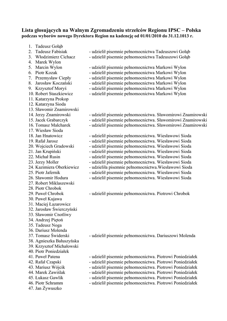 Lista głosujących na Walnym Zgromadzeniu strzelców Regionu IPSC – Polska podczas wyborów nowego Dyrektora Region na kadencję od 01/01/2010 do 31.12.1013 r. 1. Tadeusz Gołąb 2. Tadeusz Fabisiak 3. Włodzimierz Cichacz 4. Marek Wylon 5. Marcin Wylon 6. Piotr Kozak 7. Przemysław Ciepły 8. Jarosław Koczański 9. Krzysztof Moryś 10. Robert Staszkiewicz 11. Katarzyna Prokop 12. Katarzyna Sioda 13. Sławomir Znamirowski 14. Jerzy Znamirowski 15. Jacek Grabarczyk 16. Tomasz Malcharek 17. Wiesław Sioda 18. Jan Hnatowicz 19. Rafał Jarosz 20. Wojciech Gradowski 21. Jan Krupiński 22. Michał Rusin 23. Jerzy Moller 24. Kazimiera Oberkiewicz 25. Piotr Jafernik 26. Sławomir Hodura 27. Robert Miklaszewski 28. Piotr Chrobok 29. Paweł Chrobok 30. Paweł Kujawa 31. Maciej Łazarowicz 32. Jarosław Świerczyński 33. Sławomir Cnotliwy 34. Andrzej Piętoń 35. Tadeusz Noga 36. Dariusz Molenda 37. Tomasz Świderski 38. Agnieszka Bałuszyńska 39. Krzysztof Michałowski 40. Piotr Poniedziałek 41. Paweł Patena 42. Rafał Czapski 43. Mariusz Wójcik 44. Marek Zawiślak 45. Łukasz Gawlik 46. Piotr Schramm 47. Jan Żywuszko - udzielił pisemnie pełnomocnictwa Tadeuszowi Gołąb - udzielił pisemnie pełnomocnictwa Tadeuszowi Gołąb - udzielił pisemnie pełnomocnictwa Markowi Wylon - udzielił pisemnie pełnomocnictwa Markowi Wylon - udzielił pisemnie pełnomocnictwa Markowi Wylon - udzielił pisemnie pełnomocnictwa Markowi Wylon - udzielił pisemnie pełnomocnictwa Markowi Wylon - udzielił pisemnie pełnomocnictwa Markowi Wylon - udzielił pisemnie pełnomocnictwa. Sławomirowi Znamirowski - udzielił pisemnie pełnomocnictwa. Sławomirowi Znamirowski - udzielił pisemnie pełnomocnictwa. Sławomirowi Znamirowski - udzielił pisemnie pełnomocnictwa. Wiesławowi Sioda - udzielił pisemnie pełnomocnictwa. Wiesławowi Sioda - udzielił pisemnie pełnomocnictwa. Wiesławowi Sioda - udzielił pisemnie pełnomocnictwa. Wiesławowi Sioda - udzielił pisemnie pełnomocnictwa. Wiesławowi Sioda - udzielił pisemnie pełnomocnictwa. Wiesławowi Sioda - udzieliła pisemnie pełnomocnictwa.Wiesławowi Sioda - udzielił pisemnie pełnomocnictwa. Wiesławowi Sioda - udzielił pisemnie pełnomocnictwa. Wiesławowi Sioda - udzielił pisemnie pełnomocnictwa. Piotrowi Chrobok - udzielił pisemnie pełnomocnictwa. Dariuszowi Molenda - udzielił pisemnie pełnomocnictwa. Piotrowi Poniedziałek - udzielił pisemnie pełnomocnictwa. Piotrowi Poniedziałek - udzielił pisemnie pełnomocnictwa. Piotrowi Poniedziałek - udzielił pisemnie pełnomocnictwa. Piotrowi Poniedziałek - udzielił pisemnie pełnomocnictwa. Piotrowi Poniedziałek - udzielił pisemnie pełnomocnictwa. Piotrowi Poniedziałek 48. Andrzej Kulawiak 49. Adrian Pudlik 50. Maciej Sołtys 51. Piotr Ołubiec 52. Andrzej Polak 53. Adam Włoczewski 54. Mirosław Kałuża 55. Paweł Ciurzyński 56. Tomasz Simkiewicz 57. Krzysztof Sanecznik 58. Łukasz Radomiak 59. Jurand Koput 60. Grzegorz Bałuszyński 61. Bogusław Gawęda 62. Andrzej Tomczak 63. Sławomir Czauderna 64. Marcin Skowron 65. Gracjan Socha 66. Grzegorz Bieniasz 67. Marcin Bazarnik 68. Monika Bazarnik 69. Stanisław Kwiecień 70. Sławomir Konik 71. Janusz Pilch 72. Konrad Dudek 73. Wojciech Gądek 74. Robert Wrona 75. Zbigniew Kubicz 76. Tomasz Kucharski 77. Andrzej Dziubany 78. Maciej Srebrowski 79. Jarosław Szpakowicz 80. Krzysztof Siuda 81. Krzysztof Bobek 82. Maciej Spychała 83. Stanisław Michalik 84. Beata Spychała 85. Rafał Karaś 86. Dariusz Schuppik 87. Jarosław Bieliński 88. Zdzisław Jacek 89. Zbigniew Wandzel 90. Paweł Walkowski 91. Paweł Ruszkiewicz 92. Celesty Pabin 93. Zbigniew Fonczyk 94. Władysław Frątczak 95. Zbigniew Radaszewski 96. Ryszard Koprowski 97. Radosław Kuraszewicz - udzielił pisemnie pełnomocnictwa. Janowi Żywuszko - udzielił pisemnie pełnomocnictwa. Maciejowi Sołtys - udzielił pisemnie pełnomocnictwa. Maciejowi Sołtys - udzielił pisemnie pełnomocnictwa. Grzegorzowi Bieniasz - udzieliła pisemnie pełnomocnictwa. Grzegorzowi Bieniasz - udzielił pisemnie pełnomocnictwa. Konradowi Dudek - udzielił pisemnie pełnomocnictwa. Tomaszowi Kucharski - udzielił pisemnie pełnomocnictwa. Tomaszowi Kucharski - udzielił pisemnie pełnomocnictwa. Tomaszowi Kucharski - udzielił pisemnie pełnomocnictwa. Tomaszowi Kucharski - udzielił pisemnie pełnomocnictwa. Tomaszowi Kucharski - udzielił pisemnie pełnomocnictwa. Maciejowi Spychała - udzieliła pisemnie pełnomocnictwa. Maciejowi Spychała - udzielił pisemnie pełnomocnictwa. Maciejowi Spychała - udzielił pisemnie pełnomocnictwa. Zdzisławowi Jacek - udzielił pisemnie pełnomocnictwa. Zdzisławowi Jacek - udzielił pisemnie pełnomocnictwa. Zdzisławowi Jacek - udzielił pisemnie pełnomocnictwa. Zdzisławowi Jacek - udzielił pisemnie pełnomocnictwa. Zdzisławowi Jacek - udzielił pisemnie pełnomocnictwa. Zdzisławowi Jacek - udzielił pisemnie pełnomocnictwa. Zdzisławowi Jacek 98. Wiesław Burzec 99. Artur Ochniak 100. Urszula Ochniak 101. Zbigniew Braksator 102. Janusz Michałowski 103. Piotr Michałowski 104. Jarosław Wilczyński - udzieliła pisemnie pełnomocnictwa. Arturowi Ochniak - udzielił pisemnie pełnomocnictwa. Arturowi Ochniak - udzielił pisemnie pełnomocnictwa. Arturowi Ochniak - udzielił pisemnie pełnomocnictwa. Arturowi Ochniak