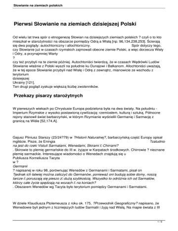 Słowianie na ziemiach polskich Pierwsi Słowianie na ziemiach dzisiejszej Polski Od wielu lat trwa spór o etnogenezę Słowian na dzisiejszych ziemiach polskich ? czyli o to kto mieszkał w starożytności na obszarze pomiędzy Odrą a Wisłą [np. 96,134,238,253]. Ścierają się dwa poglądy: autochtoniczny i allochtoniczny. Spór dotyczy tego, czy Słowianie już w czasach rzymskich zajmowali obecne ziemie Polski, a więc dorzecza Wisły i Odry, a przynajmniej Warty ? czy też przybyli na te ziemie później. Autochtoniści twierdzą, że w czasach Wędrówki Ludów Słowianie właśnie z Polski wyszli na południe ku Dunajowi i Bałkanom. Allochtoniści uważają, że w tej epoce Słowianie przybyli nad Wisłę i Odrę z zewnątrz, mianowicie ze wschodu z terytorium dzisiejszej Ukrainy [121]. Ten drugi pogląd zyskuje większą liczbę zwolenników. Przekazy pisarzy starożytnych W pierwszych wiekach po Chrystusie Europa podzielona była na dwa światy. Na południu Imperium Rzymskie z wysoko postawioną cywilizacją: rzemiosłem, kulturą i sztuką. Północne rejony stanowił świat barbarzyński, w którym Rzymianie wydzielili Germanię i Sarmację z granicą na Wiśle [52,174.A]. Gajusz Pliniusz Starszy (23/24?79) w ?Historii Naturalnej?, barbarzyńską część Europy opisał mgliście. Pisze, że Eningia ?zaludnio na jest do rzeki Vistuli Sarmatami, Wenedami, Skirami i Chirrami? . Skirowie to plemię germańskie do III w. żyjące w Karpatach środkowych. Chirrowie ? nieznane plemię sarmackie. Interesujące wiadomości o Wenedach znajdują się u Publiusza Korneliusza Tacyta w ? Germanii ? napisanej w roku 98, porównując Wenedów z Germanami i Sarmatami, pisał on ?jednak ich łatwiej można zaliczyć do Germanów, ponieważ oni budują sobie domy, noszą tarcze i poruszają się pieszo z dużą szybkością. Wszystko to odróżnia ich od Sarmatów, którzy całe życie spędzają na wozach i na koniach? . Obszarem Wenedów wg Tacyta było terytorium pomiędzy Germanami i Sarmatami. W dziele Klaudiusza Ptolemeusza z roku ok. 175, ?Przewodnik Geograficzny? napisano, że Wenedowie byli jednym z liczniejszych ludów Sarmatii i żyją nad Wisłą. Na mapie świata z III 1/6 Słowianie na ziemiach polskich w., Wenedowie zaznaczeni zostali w dwu miejscach jako ?Wenedowie-Sarmaci? [52,174.B]. Jordan (Jordanes) (ok. 500?ok. 554) pisał, że ?u podnóża Karpat, opadających na północ, poczynając od miejsca narodzin rzeki Vistuli, na bezkresnych przestrzeniach żyją ludne plemiona Wenetów (Wenetowie - Słowianie (Joranes) nie byli tożsami z Wenen d ami (którzy Słowianami nie byli) [238]) , chociaż ich nazwy zmieniają się zależnie od różnych rodów i miejsca pochodzenia, przeważnie oni wszyscy znani są pod trzema nazwami: Wenetów, Antów i Slawenów? . Wenetami we wczesnym średniowieczu nazywali Słowian ich zachodni sąsiedzi ? Germanie. Wzmiankę o Słowianach na obszarze dzisiejszej Polski, znajdujemy u Prokopiusza z Cezarei, k tóry w roku 512 pisał, że na ziemiach pomiędzy Karpatami a Bałtykiem zamieszkiwały ?ludy Słowian? . Ibrahim ibn Jakub pozostawił świadectwo z pobytu w Europie środkowej w latach 965?966: ?Sł owianie są skorzy do zaczepki i gwałtowni i gdyby nie ich niezgoda, wywołana mnogością podziałów na szczepy, żaden lud nie zdołałby im sprostać w sile. Zamieszkują oni krainy najbogatsze w plony. Oddają się ze szczególną gorliwością rolnictwu i poszukiwaniu środków do życia, w czym przewyższają wszystkie ludy Północy. Handel ich dociera lądem i morzem do Rusów i do Konstantynopola?. Własne przekazy Słowian Pierwsze własne teksty Słowian pojawiły się w wieku IX (głagolica (862?863), cyrylica). Około roku 1113, mnich Nestor (~1056? 1114) zredagował w Kijowie ? Powieść minionych lat? [1], 2/6 Słowianie na ziemiach polskich najstarszą kronikę ruską (latopis) opisującą świat od roku 853 . w Polsce pierwszą kronikę, obejmującą okres od czasów legendarnych, napisał po łacinie Gall Anonim w latach 1113?1116. Wincenty Kadłubek (ok. 1160?1223) swoją kronikę napisał w latach 1205?1207. Do niedawna sądzono, że najstarszym polskim zdaniem utrwalonym na piśmie jest ?zdanie henrykowskie? z roku 1270 (Księga Henrykowska , kronika Cystersów). Obecnie przyjmuje się pierwszeństwo ?zdań legnickich?, zanotowanych w nie istniejącej już łacińskiej kronice z XIII wieku, a przechowanych w Rocznikach Jana Długosza. Kronika ta, miałaby powstać krótko po roku 1260 pod piórem Wincentego z Kielczy i znajdować się w zbiorach krakowskiego konwentu dominikańskiego jeszcze w czasie pracy Długosza nad Rocznikami [268]. Sytuacja osadnicza w Europie środkowej w wiekach IV-X. Uważa się, że w wieku III przed Chrystusem plemię Celtów przekroczyło Sudety i osiedliło się w dorzeczu górnej Wisły, mieszając się w II wieku z tamtejszą ludnością. w ten sposób powstała kultura przeworska, której rozkwit przypada na okres i w. przed Chrystusem ? początek V w. po Chrystusie. Na początku naszej ery w dolnym biegu Wisły żyli Goci, lud germański, którzy w drugiej połowie II wieku rozproszyli się na Mazowszu, Podnieprzu i Wołyniu, gdzie zmieszali się z miejscową ludnością kultury przeworskiej [174.A]. Około połowy IV w. po Chrystusie, na obszarach dzisiejszej Polski zamieszkiwały plemiona należące do następujących kultur (rys. 2) [238]: a - kultury przeworskiej związane z germańskim plemieniem Wandalów, b - wandalsko-dackie osadnictwo w Karpatach i na Pogórzu Karpackim, c - kultury bałtyjskiej, 3/6 Słowianie na ziemiach polskich d - grupy dębczyńskiej, e - kultury luboszyckiej, f - kultury wielbarskiej germańskiego plemienia Gotów, g - grupy masłomęckiej również germańskiego plemienia Gotów (Masłomęcz położony jest w odległości 9 km na południe od Hrubieszowa). Niezwykle interasujący jest fakt obecności w Kotlinie Hrubieszowskiej śladów zamieszkiwania 