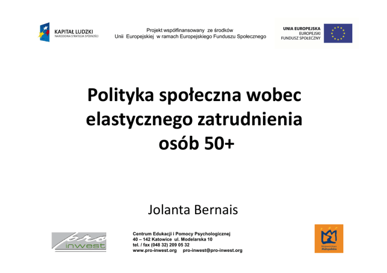 Projekt współfinansowany ze środków Unii Europejskiej w ramach Europejskiego Funduszu Społecznego Polityka społeczna wobec elastycznego zatrudnienia osób 50+ Jolanta Bernais Centrum Edukacji i Pomocy Psychologicznej 40 – 142 Katowice ul. Modelarska 10 tel. / fax (048 32) 209 05 32 www.pro-inwest.org [email protected] Projekt współfinansowany ze środków Unii Europejskiej w ramach Europejskiego Funduszu Społecznego Plan prezentacji: 1. Cel i metodologia badań 2. Wyniki badań 3. Diagnoza najistotniejszych problemów polityki społecznej wobec 50+ 4. Wnioski i rekomendacje Centrum Edukacji i Pomocy Psychologicznej 40 – 142 Katowice ul. Modelarska 10 tel. / fax (048 32) 209 05 32 www.pro-inwest.org [email protected] Projekt współfinansowany ze środków Unii Europejskiej w ramach Europejskiego Funduszu Społecznego Celem głównym prezentowanych badań była analiza i ocena polityki realizowanej w regionie wobec osób w wieku niemobilnym oraz sformułowanie rekomendacji do tworzenia przyszłych strategii rozwiązywania problemów społecznych w Małopolsce w zakresie integracji zawodowej 50+. Centrum Edukacji i Pomocy Psychologicznej 40 – 142 Katowice ul. Modelarska 10 tel. / fax (048 32) 209 05 32 www.pro-inwest.org [email protected] Projekt współfinansowany ze środków Unii Europejskiej w ramach Europejskiego Funduszu Społecznego Metoda badawcza: Indywidualny Wywiad Pogłębiony Respondenci: Eksperci z obszaru Małopolski (30 przedstawicieli podmiotów polityki społecznej) Centrum Edukacji i Pomocy Psychologicznej 40 – 142 Katowice ul. Modelarska 10 tel. / fax (048 32) 209 05 32 www.pro-inwest.org [email protected] Projekt współfinansowany ze środków Unii Europejskiej w ramach Europejskiego Funduszu Społecznego Uwarunkowania polityki wobec osób 50+: - polityka ludnościowa - polityka rodzinna - polityka rynku pracy - polityka zabezpieczeń socjalnych Centrum Edukacji i Pomocy Psychologicznej 40 – 142 Katowice ul. Modelarska 10 tel. / fax (048 32) 209 05 32 www.pro-inwest.org [email protected] Projekt współfinansowany ze środków Unii Europejskiej w ramach Europejskiego Funduszu Społecznego Wnioski: - niska popularność elastycznych form zatrudnienia - słaba znajomość problematyki efz - negatywne stereotypy postrzegania efz - moda i konieczność rozwoju efz - szanse i zagrożenia w procesie aktywizacji osób 50+ - korzyści z przedłużania okresu aktywności zawodowej - odpowiedzialni za działania wobec 50+ w sferze zatrudnienia Centrum Edukacji i Pomocy Psychologicznej 40 – 142 Katowice ul. Modelarska 10 tel. / fax (048 32) 209 05 32 www.pro-inwest.org [email protected] Rekomendowane usprawnienia i uzupełnienia dotychczasowych kierunków działań: – uzupełnienia prowadzonych dotychczas analiz rynku pracy o informacje na temat grupy 50+; – zbadania kompetencji osób 50+ pozostających poza rynkiem pracy (biernych zawodowo); – popularyzacji wyników raportów obrazujących sytuację na rynku pracy wśród pracodawców, menedżerów z rejonu Małopolski, co pozwoli poznać potencjał osób starszych gotowych do natychmiastowego zagospodarowania oraz otworzy pracodawcom drogę do innego postrzegania tej części społeczeństwa. Walka ze stereotypem osób starszych przy wykorzystaniu działań z zakresu: • • edukacji dorosłych i kształceniu skorelowanemu z potrzebami rynku pracy; • promocji programów zarządzania wiekiem w organizacjach; • popularyzacji za pomocą mediów korzyści finansowych wynikających z dłuższego okresu pracy zawodowej; popularyzacji wiedzy o pozytywnych następstwach psychospołecznych podtrzymywania aktywności zawodowej Projekt współfinansowany ze środków Unii Europejskiej w ramach Europejskiego Funduszu Społecznego Dziękuję za uwagę! [email protected] Centrum Edukacji i Pomocy Psychologicznej 40 – 142 Katowice ul. Modelarska 10 tel. / fax (048 32) 209 05 32 www.pro-inwest.org [email protected]
