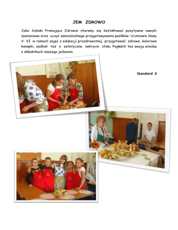 JEM ZDROWO Jako Szkoła Promująca Zdrowie staramy się kształtować pozytywne nawyki żywieniowe oraz uczyć samodzielnego przygotowywania posiłków. Uczniowie klasy V- VI w ramach zajęć z edukacji prozdrowotnej przygotowali zdrowe, kolorowe kanapki, zadbali też o estetyczne nakrycie stołu. Pogłębili też swoją wiedzę o składnikach naszego jedzenia. Standard 3