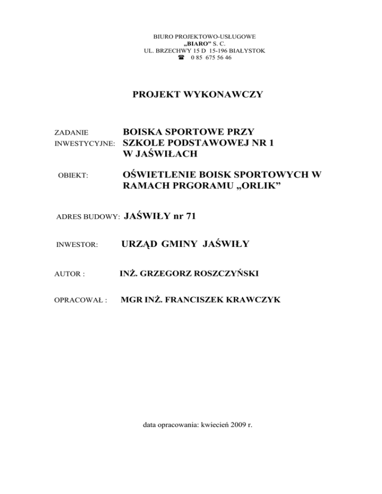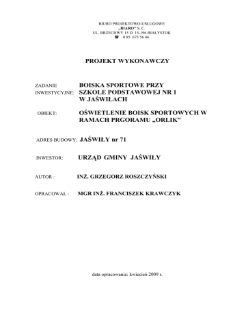 BIURO PROJEKTOWO-USŁUGOWE „BIARO” S. C. UL. BRZECHWY 15 D 15-196 BIAŁYSTOK 0 85 675 56 46 PROJEKT WYKONAWCZY BOISKA SPORTOWE PRZY SZKOLE PODSTAWOWEJ NR 1 W JAŚWIŁACH ZADANIE INWESTYCYJNE: OBIEKT: OŚWIETLENIE BOISK SPORTOWYCH W RAMACH PRGORAMU „ORLIK” ADRES BUDOWY: JAŚWIŁY nr 71 INWESTOR: URZĄD GMINY JAŚWIŁY AUTOR : INś. GRZEGORZ ROSZCZYŃSKI OPRACOWAŁ : MGR INś. FRANCISZEK KRAWCZYK data opracowania: kwiecień 2009 r. Zespół Szkół w Jaświłach – Oświetlenie boisk sportowych - 2 SPIS ZAWARTOŚCI 1. 2. 3. 4. 5. • • Strona tytułowa Warunki przyłączania Opis techniczny Obliczenia techniczne Rysunki techniczne Plan sytuacyjny Schemat zasilania – rozdzielnica RO rys. rys. InŜ. Grzegorz Roszczyński „ BIARO”. ul. Brzechwy 15 D 15-196 Białystok tel. 0 85 675 56 46 1/2 2/2 Zespół Szkół w Jaświłach – Oświetlenie boisk sportowych - 3 OPIS TECHNICZNY do projektu wykonawczego oświetlenia boisk sportowych przy Zespole Szkół w Jaświłach 1. Parametry techniczne: 1.1. Napięcie zasilania -U 1.2. Moc zainstalowana - Pi 1.3. Moc szczytowa - Ps 1.4. Współczynnik jednoczesności - kj 1.5. Współczynnik mocy - cos φ 1.6. Pomiar energii elektrycznej – istniejący w RG szkoły = 400/230 V = 10,06 kW = 10,06 kW = 1,0 = 0,9 1.7.Ochrona od poraŜeń dodatkowa: - szybkie samoczynne włączanie - układ sieci projektowany TN-S - układ sieci istniejący TN-C 2. Zakres opracowania: 2.1. Zasilanie i rozdział energii elektrycznej 2.2. Rozdzielnica oświetlenia boisk 2.3. Oświetlenie boisk 2.4. Ochrona przeciwporaŜeniowa 3. Zasilanie i rozdział energii elektrycznej Moc szczytowa budynku szkoły nie ulegnie zwiększeniu z uwagi na róŜny czas pracy projektowanego oświetlenia z urządzeniami zainstalowanymi w szkole (szczególnie urządzenia technologii kuchni). Projektowane oświetlenie boisk zasilane będzie z istniejącej rozdzielnicy głównej RG szkoły zainstalowanej w pomieszczeniu dozorcy. Na ścianie, obok istniejącej RG, naleŜy zainstalować skrzynkę bezpiecznikową i wyposaŜyć ją w zabezpieczenia wewnętrznej linii zasilającej (WLZ) do projektowanej rozdzielnicy RO. Projektowane zabezpieczenie zasilić z za istniejącego wyłącznika głównego. Projektowany WLZ w rurze ochronnej prowadzić po ścianie korytarza częsci dydaktycznej i sali gimnastycznej do pomieszczenia magazynowego, w którym zainstalowana będzie rozdzielnica RO. Istniejąca rozdzielnica RG szkoły z uwagi na stan techniczny oraz dobudowę zasilania oświetlenia boisk wymaga przebudowy i modernizacji. Projekt przebudowy RG nie jest objęty niniejszym opracowaniem. MoŜe być wykonany na oddzielne zlecenie. 4. Rozdzielnica oświetlenia boisk Zasilanie obwodów oświetlenia boisk zaprojektowano z rozdzielnicy RO, którą naleŜy zainstalować przy ścianie zewnętrznej w pomieszczeniu magazynowym w części adoptowanej na potrzeby socjalno-sanitarne boisk. W rozdzielnicy zainstalowane będą: rozłącznik, zabezpieczenia, styczniki załączające oświetlenie, przekaźniki opóźniające załączanie poszczególnych obwodów oświetleniowych (z uwagi na ograniczenie prądu rozruchowego lamp) oraz w oddzielnej szafce rozłącznik oświetlenia. InŜ. Grzegorz Roszczyński „ BIARO”. ul. Brzechwy 15 D 15-196 Białystok tel. 0 85 675 56 46 Zespół Szkół w Jaświłach – Oświetlenie boisk sportowych - 4 Urządzenia elektryczne instalowane w rozdzielnicy oraz rodzaje i przekroje projektowanych linii kablowych opisano na schemacie rozdzielnicy RO. 5. Oświetlenie boisk Typy i ilość opraw dobrane zostały przez firmę „LAMPOL” Białystok ul. Wyszyńskiego 2/1 (0-85 744 40 99 lub /fax 0-85 744 48 14) do zapewnienia odpowiedniego poziomu oświetlenia na boiskach. Do oświetlenia boisk zastosowano projektory metalohalogenkowe OLIMPIA ASY o mocy 400W, które będą mocowane na słupach stalowych (masztach) o wysokości 12,0 m np. typ Agena P. Zasilanie oświetlenia odbywać się będzie liniami kablowymi. Przy podłączaniu opraw naleŜy zwrócić uwagę na moŜliwie równomierne obciąŜenie poszczególnych faz. Załączanie oświetlenia boisk odbywać się będzie stycznikami sterowanymi rozłącznikiem. 6. Ochrona przeciwporaŜeniowa Ochrona przeciwporaŜeniowa podstawowa (przed dotykiem bezpośrednim) spełniona jest przez izolowanie części czynnych (obudowy aparatów i urządzeń elektrycznych oraz izolację przewodów). Ochrona przeciwporaŜeniowa dodatkowa (przed dotykiem pośrednim) w projektowanej instalacji spełniona jest poprzez połączenie części przewodzących dostępnych z przewodem ochronnym oraz zastosowanie samoczynnego wyłączania za pomocą wyłączników przetęŜeniowych i róŜnicowoprądowych zainstalowanych rozdzielnicy RO. W projektowanej instalacji zastosowano układ sieciowy TN -S, w którym przewody neutralne N i przewody ochronne PE są oddzielne. 7. Uwagi 1. Linie moŜna wykonywać po wytyczeniu boisk i urządzeń sportowych i oznaczeniu ich tras przez uprawnionego geodetę. 2. Przy wykonywaniu prac stosować materiały i urządzenia posiadające aktualne atesty i certyfikaty dopuszczające do ich stosowania. 3. Całość wykonać zgodnie z aktualnie obowiązującymi przepisami. 4. Istniejąca rozdzielnica RG szkoły z uwagi na stan techniczny oraz dobudowę zasilania oświetlenia boisk wymaga przebudowy i modernizacji. Projekt przebudowy RG nie jest objęty niniejszym opracowaniem. InŜ. Grzegorz Roszczyński „ BIARO”. ul. Brzechwy 15 D 15-196 Białystok tel. 0 85 675 56 46 Zespół Szkół w Jaświłach – Oświetlenie boisk sportowych - 5 OBLICZENIA TECHNICZNE 1. Bilans mocy Moc ( kW ) 1.1. Moc projektowana oświetlenie części boiska do piłki noŜnej – obw. 1 oświetlenie części boiska do piłki noŜnej i koszykówki – obw. 2 oświetlenie części boiska do piłki noŜnej i koszykówki – obw. 3 Razem moc projektowana 3,56 3,25 3,25 10,06 2. Dobór zabezpieczenia i projektowanych przewodów Linia zasilająca od sz