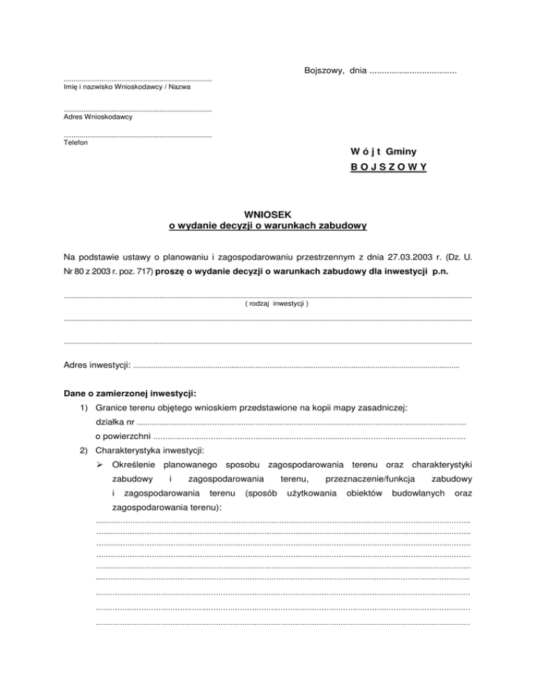 W ó jt Gminy BOJSZOWY WNIOSEK o wydanie decyzji o warunkach
