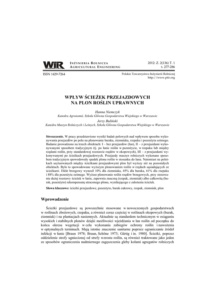 INŻYNIERIA ROLNICZA AGRICULTURAL ENGINEERING ISSN 1429-7264 2012: Z. 2(136) T. 1 S. 277-286 Polskie Towarzystwo Inżynierii Rolniczej http://www.ptir.org WPŁYW ŚCIEŻEK PRZEJAZDOWYCH NA PLON ROŚLIN UPRAWNYCH Hanna Niemczyk Katedra Agronomii, Szkoła Główna Gospodarstwa Wiejskiego w Warszawie Jerzy Buliński Katedra Maszyn Rolniczych i Leśnych, Szkoła Główna Gospodarstwa Wiejskiego w Warszawie Streszczenie. W pracy przedstawiono wyniki badań polowych nad wpływem sposobu wykonywania przejazdów po polu na plonowanie buraka, ziemniaka, rzepaku i pszenżyta ozimego. Badanie prowadzono na trzech obiektach: I – bez przejazdów (łan), II – z przejazdami wykonywanymi sposobem tradycyjnym (tj. po łanie roślin w pszenżycie, w rzepaku lub między rzędami roślin, przy standardowej rozstawie rzędów w okopowych), III – z przejazdami wykonywanymi po ścieżkach przejazdowych. Przejazdy maszyn rolniczych wykonane sposobem tradycyjnym spowodowały spadek plonu roślin w stosunku do łanu. Natomiast na poletkach usytuowanych między ścieżkami przejazdowymi plon był wyższy niż na pozostałych obiektach. Było to spowodowane wyższym plonowaniem roślin w rzędach sąsiadujących ze ścieżkami. Efekt brzegowy wynosił 10% dla ziemniaka, 45% dla buraka, 61% dla rzepaku i 88% dla pszenżyta ozimego. Wyższe plonowanie roślin rzędów brzegowych, przy stosowaniu dużej rozstawy ścieżek w łanie, zapewnia znaczną (rzepak, ziemniak) albo całkowitą (burak, pszenżyto) rekompensatę utraconego plonu, wynikającego z założenia ścieżek. Słowa kluczowe: ścieżki przejazdowe, pszenżyto, burak cukrowy, rzepak, ziemniak, plon Wprowadzenie Ścieżki przejazdowe są powszechnie stosowane w nowoczesnych gospodarstwach w roślinach zbożowych, rzepaku, a również coraz częściej w roślinach okopowych (burak, ziemniak) i na plantacjach nasiennych. Aktualnie są standardem technicznym w osiąganiu wysokich i stabilnych plonów dzięki możliwości wjeżdżania w łan roślin od początku do końca okresu wegetacji w celu wykonania zabiegów ochrony roślin i nawożenia w optymalnych terminach. Mają istotne znaczenie sanitarne poprzez ograniczanie źródeł infekcji w łanie [Braun 1978; Braun, Schöne 1973; Gärtig i in. 1980]. Ścieżki, poprzez oddzielenie strefy ugniecionej od strefy wzrostu roślin, są również traktowane jako jeden ze sposobów ograniczenia nadmiernego zagęszczenia gleby kołami agregatów rolniczych Hanna Niemczyk, Jerzy Buliński podczas pielęgnacji roślin. Największe zagęszczenie gleby powodują 2-3 przejazdy tym samym śladem, przy kolejnych przejazdach gęstość gleby zmienia się nieznacznie [Buliński, Niemczyk 2004, 2009; Byszewski, Haman 1977; Domsch 1993]. Ścieżki umożliwiają zastąpienie wąskich opon ciągników do pielęgnacji normalnym ogumieniem i dzięki większej powierzchni styku opon z glebą ich ugniatające oddziaływanie sięga płycej [Brunotte, Sommer 1993; Kozicz 1996]. Stosowanie ścieżek przejazdowych zmniejsza ogólną liczbę roślin na jednostce powierzchni, jednakże wynikające z tego straty plonu są kompensowane przez efekt brzegowy roślin z rzędów przy ścieżkach. Obniżka plonu jest tym mniejsza, im większa jest odległość między ścieżkami w łanie [Brunotte, Sommer 1993; Heege 1979; Niemczyk 1996; Helmke i in. 1994; Wolf 2000]. Zakres prezentowanych w literaturze kompensacji plonu jest dość szeroki i zależy od zdolności poszczególnych gatunków do wyrównywania plonu, szerokości ścieżki, warunków klimatycznych itp. Dla roślin zbożowych efekt brzegowy wahał się najczęściej od 30 do 117% [Austin, Blackwell 1980; Braun 1978; Braun, Schöne 1973; Hadjichristodoulou 1983, 1993; Niemczyk 1996; Ptaszyński 1984] dla rzepaku od 1 do 186% [Hadjichristodoulou 1993], dla ziemniaków 22-26% [Helmke i in. 1994; Wolf 2000], a dla buraka cukrowego 31-42% [Brunotte, Sommer 1993]. Podawane w literaturze wyniki badań efektu brzegowego są nieliczne, dotyczyły różnych warunków prowadzenia doświadczenia i ocena porównawcza reakcji różnych roślin jest trudna. W literaturze krajowej brak jest danych na ten temat. Celem niniejszej pracy jest porównanie wyników badań prowadzonych w uprawie ziemniaka, rzepaku ozimego, pszenżyta ozimego, buraka cukrowego nad wpływem sposobu przejazdów ścieżkami technologicznymi na plonowanie roślin w rzędach brzegowych i określenie, w jakim stopniu efekt brzegowy rekompensuje straty plonu. Materiał i metody Badania nad burakiem, rzepakiem ozimym i pszenżytem ozimym wykonano w ramach wieloletniego eksperymentu prowadzonego na polu doświadczalnym Katedry Agronomii SGGW w Chylicach. Doświadczenie było założone na czarnej ziemi zdegradowanej, wytworzonej z gliny zwałowej lekkiej o zawartość części spławianych od 17 do 21% i uregulowanych stosunkach wodnych. Badania z uprawą ziemniaków wykonano na polu produkcyjnym w indywidualnym gospodarstwie rolnym na glebie bielicowej, kompleksu żytniego słabego o składzie granulometrycznym piasku słabogliniastego o zawartości części spławianych 10%. Doświadczenie założono metodą długich parceli. Szerokość pola odpowiadała 3 szerokościom roboczym siewnika i jednej szerokości roboczej opryskiwacza. Na polu doświadczalnym założono trzy obiekty badawcze: I – łan zwarty (obiekt kontrolny znajdujący się poza strefą oddziaływania kół), II – obiekt, w którym przejazdy w czasie zabiegów pielęgnacyjnych wykonywane były po łanie roślin (pszenżyto, rzepak) lub między rzędami roślin przy standardowej rozstawie rzędów (burak, ziemniak), III – obiekt z przejazdami wykonywanymi po ścieżkach przejazdowych. Ścieżki przejazdowe założono w czasie siewu (sadzenia). Charakterystykę układu obiektów ze ścieżkami dla poszczególnych roślin przedstawiono w tabeli 1. 278 Wpływ ścieżek przejazdowych... Na każdym obiekcie wytyczono 5 poletek badawczych o długości 1 m. Sze