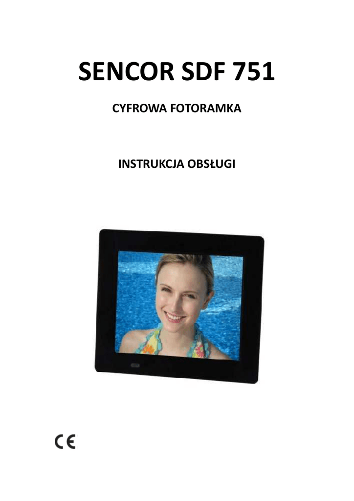 SENCOR SDF 751 CYFROWA FOTORAMKA INSTRUKCJA OBSŁUGI 1. Bezpieczeństwo 1.1 Przeznaczenie Cyfrowa fotoramka jest przeznaczona do wyświetlania fotografii z urządzeń pamięci. Ze względu na dużą różnorodność produktów umożliwiających podłączenie zewnętrznych urządzeń pamięci (USB, SD/SDHC//MMC itd.) oraz na ich specyficzne funkcje, nie możemy zagwarantować, że wszystkie urządzenia zostaną rozpoznane i że wszystkie ich funkcje, będące teoretycznie do dyspozycji, będą również w praktyce działać. 1.2 Podstawowe zalecenia z zakresu bezpieczeństwa OSTRZEŻENIE Przy obsłudze urządzenia nie używaj siły. Mogłoby dojść do jego uszkodzenia. UWAGA Zadbaj o to, aby nie doszło do polania urządzenia jakąkolwiek cieczą. 2. Przygotowanie do użytku 2.1 Wypakowanie Ostrożnie rozpakuj urządzenie. Zgodnie z poniższym opisem sprawdź zawartość opakowania. Jeśli brakuje jakiegoś elementu, skontaktuj się ze sprzedawcą. Jeśli na panelu przednim znajduje się naklejka, ostrożnie zdejmij ją z panelu. 2.2 Zawartość opakowania W tym opakowaniu znajdują się następujące elementy: 1 cyfrowa ramka fotograficzna 1 adapter prądu zmiennego/stałego + kabel 1 instrukcja użycia 2.3 Podłączanie do zasilania sieciowego Podłącz wtyczkę kabla adapteru do złącza napięcia prądu stałego. Włącz wtyczkę do gniazdka sieciowego. 3. Funkcje 1 2 3 4 5 Slot karty pamięci Złącze USB Złącze zasilania prądem stałym Przycisk EXIT (powrót) Przycisk LEFT (w lewo) 6 7 8 9 10 Przycisk DOWN (w dół) Przycisk ENTER (odtwarzanie) Przycisk UP (w górę) Przycisk RIGHT (w prawo) Przycisk MENU (menu) 4. Obsługa 4.1 Fotografie 1) Po pierwszym uruchomieniu cyfrowej fotoramki przy podłączonym urządzeniu USB lub włożonej karcie pamięci z zapisanymi fotografiami uruchomi się ich prezentacja. Najpierw pokaże się kalendarz, a po 1–2 sekundach zostanie rozpoczęta prezentacja fotografii. Jeśli włożysz kartę SD lub podłączysz urządzenie USB później, tryb kalendarza zmieni się automatycznie na tryb prezentacji. 2) W zależności od ustawień fotoramka uruchomi prezentację fotografii lub pokaże jedną fotografię w trybie przeglądania lub podgląd fotografii zapisanych na włożonej karcie pamięci lub na podłączonym urządzeniu USB. 3) Jeśli karta pamięci nie jest włożona ani nie zostało podłączone urządzenie USB zawierające fotografie, na ekranie pokaże się tryb kalendarza. 4.2 Kalendarz W menu głównym wybierz opcję Calendar (kalendarz). Poprzez wciśnięcie przycisku PLAY (odtwarzanie ) (5) wejdź do menu Calendar (kalendarz). Jeśli nie wciśniesz przycisku PLAY (odtwarzanie) w ciągu 15 sekund, odnowi się prezentacja fotografii. W lewej części ekranu jest pokazany kalendarz miesięczny i data , a w prawej części ekranu są pokazane fotografie i czas (jeśli karta pamięci jest włożona lub zostało podłączone urządzenie USB zawierające fotografie). Ponowne wciśnięcie przycisku PLAY (odtwarzanie) umożliwia pokazanie zegara cyfrowego. W lewej części ekranu zostanie pokazany zegar i data, a w prawej części ekranu zostaną pokazane fotografie. Po kolejnym wciśnięciu przycisku PLAY (odtwarzanie) na ekranie zostanie pokazany tylko analogowy zegar i data. 4.3 Ustawienia Ustawienia początkowe 4.3.1 Photo Setup (ustawienia fotografii) Wciśnij przycisk MENU (menu). Poprzez wciśnięcie przycisku LEFT (w lewo) lub RIGHT (w prawo) wybierz odpowiednią opcję menu i potwierdź ją poprzez wciśnięcie przycisku PLAY (odtwarzanie). Poprzez wciśnięcie przycisku LEFT (w lewo) lub RIGHT (w prawo) wybierz opcję Photo Setup (ustawienia fotografii) i potwierdź wybór poprzez wciśnięcie przycisku PLAY (odtwarzanie). Poprzez wciśnięcie przycisku LEFT (w lewo) lub RIGHT (w prawo) wybierz odpowiednią opcję. Aby dokonać zmiany ustawień, wciśnij przycisk PLAY (odtwarzanie). Aby powrócić do menu, wciśnij przycisk EXIT (powrót). Display Mode (tryb ekranu): Tryb prezentacji, podglądu fotografii, przeglądania Tryb Slideshow (prezentacja) W trybie wyświetlania wybierz opcję Slideshow (prezentacja). Wróć do menu głównego i poprzez wciśnięcie przycisku PLAY (odtwarzanie) (5) przejdź do trybu przeglądania fotografii z uruchomieniem prezentacji. (Jeśli nie wciśniesz przycisku PLAY (odtwarzanie) w ciągu 15 sekund, zostanie automatycznie uruchomiony tryb prezentacji.) (Jeśli została włożona karta pamięci lub jeśli zostało podłączone urządzenie USB zawierające fotografie). W trybie prezentacji będą automatycznie pokazywane fotografie. Możesz również wcisnąć przycisk LEFT (w lewo) lub RIGHT (w prawo), aby pokazać poprzednią/następną fotografię. Tryb Thumbnail (podgląd) Wybierz w menu opcję Thumbnail (podgląd). Wróć do menu głównego i poprzez wciśnięcie przycisku PLAY (odtwarzanie) (5) przejdź do trybu przeglądania fotografii z pokazywaniem podglądu fotografii. (Jeśli została włożona karta pamięci lub jeśli zostało podłączone urządzenie USB zawierające fotografie). Na jednej stronie można pokazać 15 zmniejszonych fotografii, a w dolnym wierszu zostanie pokazana informacja o fotografii. Tryb Browse (przeglądanie) Wybierz w menu opcję Browse (przeglądanie). Wróć do menu głównego i poprzez wciśnięcie przycisku PLAY (odtwarzanie) (5) przejdź do trybu przeglądania fotografii z pokazaniem fotografii. (Jeśli została włożona karta pamięci lub jeśli zostało podłączone urządzenie USB zawierające fotografie). Zostanie pokazana aktualna fotografia. Poprzez wciśnięcie przycisku LEFT (w lewo) lub RIGHT (w prawo) możesz pokazać poprzednią/następną fotografię.. Display Ratio (proporcje stron ekranu): Full Screen (cały ekran), Fit to Screen (dostosować do ekranu), Crop to Fill (obciąć, aby wypełnić ekran) Slide show time (czas pokazywania fotografii podczas prezentacji): 5 sekund 15 sekund 30 sekund 60 sekund 5 minut 15 minut Slideshow Repeat (powtarzani