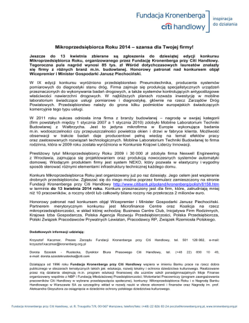 Mikroprzedsiębiorca Roku 2014 – szansa dla Twojej firmy! Jeszcze do 13 kwietnia zbierane są zgłoszenia do dziesiątej edycji konkursu Mikroprzedsiębiorca Roku, organizowanego przez Fundację Kronenberga przy Citi Handlowy. Tegoroczna pula nagród wynosi 85 tys. zł Wśród dotychczasowych laureatów znalazły się firmy z różnych branż m.in. budowlanej. Honorowy patronat nad konkursem objął Wicepremier i Minister Gospodarki Janusz Piechociński. W IX edycji konkursu wyróżniono przedsiębiorstwo Pneumotechnika, producenta systemów pomiarowych do diagnostyki stanu dróg. Firma zajmuje się produkcją specjalistycznych urządzeń przeznaczonych do wykonywania badań drogowych, a także systemów kontrolujących antypoślizgowe właściwości nawierzchni drogowych. W najbliższych planach rozważa inwestycję w mobilne laboratorium świadczące usługi pomiarowe i diagnostykę, głównie na rzecz Zarządów Dróg Powiatowych. Przedsiębiorstwo należy do grona kilku podmiotów europejskich świadczących komercyjnie tego typu usługi. W 2011 roku sukces odniosła inna firma z branży budowlanej – nagrodę w swojej kategorii (firm powstałych między 1 stycznia 2007 a 1 stycznia 2010) zdobyło Mobilne Laboratorium Techniki Budowlanej z Wałbrzycha. Jest to jedyna mikrofirma w Europie wykonująca badania m.in. wodoszczelności czy przepuszczalności powietrza okien i drzwi w fabryce klienta. Możliwość obserwacji w trakcie badań daje producentowi pełną wiedzę na temat efektów pracy oraz zastosowanych rozwiązań technologicznych. Mobilne Laboratorium Techniki Budowlanej to firma rodzinna, która w 2009 roku została wyróżniona w Konkursie Krajowi Liderzy Innowacji. Prestiżowy tytuł Mikroprzedsiębiorcy Roku 2009 i 30 000 zł zdobyła firma Nexwell Engineering z Wrocławia, zajmująca się projektowaniem oraz produkcją nowoczesnych systemów automatyki domowej. Wiodącym produktem firmy jest system NEXO, który pozwala w elastyczny i wygodny sposób sterować różnymi elementami infrastruktury technicznej każdego domu. Konkurs Mikroprzedsiębiorca Roku jest organizowany już po raz dziesiąty. Jego celem jest wspieranie drobnych przedsiębiorców. Zgłaszać się do niego można poprzez formularz zamieszczony na stronie Fundacji Kronenberga przy Citi Handlowy http://www.citibank.pl/poland/kronenberg/polish/6158.htm w terminie do 13 kwietnia 2014 roku. Konkurs przeznaczony jest dla firm, które, zatrudniają mniej niż 10 pracowników, a roczny obrót lub całkowity bilans roczny nie przekracza 2 milionów euro. Honorowy patronat nad konkursem objął Wicepremier i Minister Gospodarki Janusz Piechociński. Partnerem merytorycznym konkursu jest Microfinance Centre oraz Koalicja na rzecz mikroprzedsiębiorczości, w skład której wchodzą: Business Centre Club, Inicjatywa Firm Rodzinnych, Krajowa Izba Gospodarcza, Polska Agencja Rozwoju Przedsiębiorczości, Polska Przedsiębiorcza, Polski Związek Pracodawców Prywatnych Lewiatan, Pracodawcy RP, Związek Rzemiosła Polskiego. Dodatkowych informacji udzielają: Krzysztof Kaczmar, Prezes Zarządu [email protected] Fundacji Dorota Szostek - Rustecka, Dyrektor e-mail: [email protected] Biura Kronenberga przy Citi Handlowy, Prasowego Citi Handlowy, tel. tel. (+48 501 22) 128 882, 690 e-mail: 10 49, Działająca od 1996 roku Fundacja Kronenberga przy Citi Handlowy wspiera w imieniu Banku prace na rzecz dobra publicznego w obszarach tematycznych takich jak: edukacja, rozwój lokalny i ochrona dziedzictwa kulturowego. Realizowane przez nią działania obejmują m.in. program edukacji finansowej dla uczniów szkół ponadgimnazjalnych Moje Finanse organizowany wspólnie z NBP i Fundacją Młodzieżowej Przedsiębiorczości; Wolontariat Pracowniczy (program zaangażowania pracowników Citi Handlowy w wybrane przedsięwzięcia społeczne), konkursy: Mikroprzedsiębiorca Roku i o Nagrodę Banku Handlowego w Warszawie SA za szczególny wkład w rozwój nauki w sferze ekonomii i finansów oraz Nagrodę im. prof. Aleksandra Gieysztora za osiągnięcia w dziedzinie ochrony polskiego dziedzictwa kulturowego. Bank Handlowy w Warszawie S.A. to jedna z największych instytucji finansowych w Polsce, oferująca pod marką Citi Handlowy bogaty i nowoczesny asortyment produktów i usług bankowości korporacyjnej, inwestycyjnej i detalicznej. Bank Handlowy obsługuje 20 tys. klientów korporacyjnych i 869 000 klientów indywidualnych poprzez nowoczesne kanały dystrybucji oraz sieć 88 oddziałów. W skład grupy kapitałowej Banku wchodzą takie podmioty jak: Dom Maklerski Banku Handlowego i Handlowy Leasing. Przynależność do Citigroup, największej na świecie instytucji finansowej, zapewnia klientom Banku Handlowego dostęp do usług finansowych w ponad 100 krajach na całym świecie. Dodatkowe informacje można uzyskać na stronie internetowej www.citihandlowy.pl