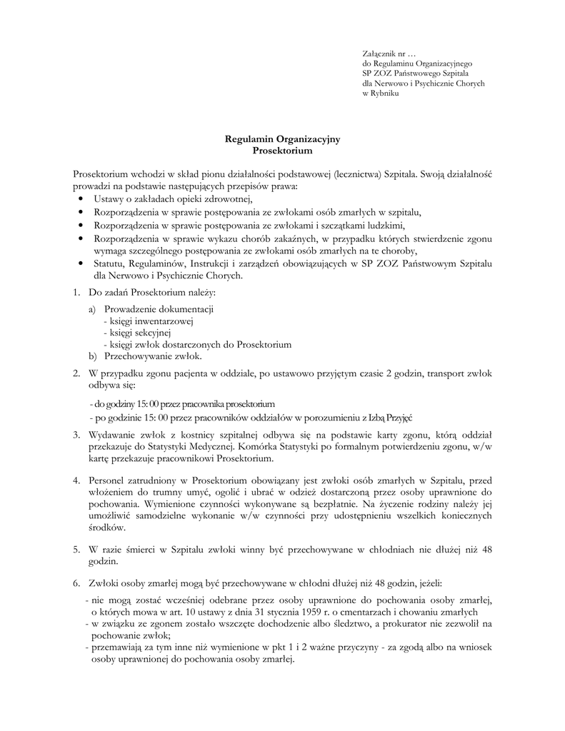 Załącznik nr … do Regulaminu Organizacyjnego SP ZOZ Państwowego Szpitala dla Nerwowo i Psychicznie Chorych w Rybniku Regulamin Organizacyjny Prosektorium Prosektorium wchodzi w skład pionu działalności podstawowej (lecznictwa) Szpitala. Swoją działalność prowadzi na podstawie następujących przepisów prawa: • Ustawy o zakładach opieki zdrowotnej, • Rozporządzenia w sprawie postępowania ze zwłokami osób zmarłych w szpitalu, • Rozporządzenia w sprawie postępowania ze zwłokami i szczątkami ludzkimi, • Rozporządzenia w sprawie wykazu chorób zakaźnych, w przypadku których stwierdzenie zgonu wymaga szczególnego postępowania ze zwłokami osób zmarłych na te choroby, • Statutu, Regulaminów, Instrukcji i zarządzeń obowiązujących w SP ZOZ Państwowym Szpitalu dla Nerwowo i Psychicznie Chorych. 1. Do zadań Prosektorium należy: a) Prowadzenie dokumentacji - księgi inwentarzowej - księgi sekcyjnej - księgi zwłok dostarczonych do Prosektorium b) Przechowywanie zwłok. 2. W przypadku zgonu pacjenta w oddziale, po ustawowo przyjętym czasie 2 godzin, transport zwłok odbywa się: - do godziny 15: 00 przez pracownika prosektorium - po godzinie 15: 00 przez pracowników oddziałów w porozumieniu z Izbą Przyjęć 3. Wydawanie zwłok z kostnicy szpitalnej odbywa się na podstawie karty zgonu, którą oddział przekazuje do Statystyki Medycznej. Komórka Statystyki po formalnym potwierdzeniu zgonu, w/w kartę przekazuje pracownikowi Prosektorium. 4. Personel zatrudniony w Prosektorium obowiązany jest zwłoki osób zmarłych w Szpitalu, przed włożeniem do trumny umyć, ogolić i ubrać w odzież dostarczoną przez osoby uprawnione do pochowania. Wymienione czynności wykonywane są bezpłatnie. Na życzenie rodziny należy jej umożliwić samodzielne wykonanie w/w czynności przy udostępnieniu wszelkich koniecznych środków. 5. W razie śmierci w Szpitalu zwłoki winny być przechowywane w chłodniach nie dłużej niż 48 godzin. 6. Zwłoki osoby zmarłej mogą być przechowywane w chłodni dłużej niż 48 godzin, jeżeli: - nie mogą zostać wcześniej odebrane przez osoby uprawnione do pochowania osoby zmarłej, o których mowa w art. 10 ustawy z dnia 31 stycznia 1959 r. o cmentarzach i chowaniu zmarłych - w związku ze zgonem zostało wszczęte dochodzenie albo śledztwo, a prokurator nie zezwolił na pochowanie zwłok; - przemawiają za tym inne niż wymienione w pkt 1 i 2 ważne przyczyny - za zgodą albo na wniosek osoby uprawnionej do pochowania osoby zmarłej. 7. Zwłoki przechowywane dłużej niż trzy doby w okresie letnim winny być poddane zabiegom utrwalającym przy użyciu konserwujących związków chemicznych (zabieg ten wykonuje lekarz). 8. Zwłoki niepochowane w ciągu 120 godzin przez rodzinę lub inne osoby mogą być przekazane do celów naukowo - dydaktycznych lub pochowane na koszt państwa. 9. Zwłoki winny być wydane na podstawie pisemnej informacji wydanej przez Dział Statystyki Medycznej i Dokumentacji Chorych. 10. Zwłoki osób, które zmarły w Szpitalu poddaje się sekcji, przy czym sekcja powinna być dokonana nie wcześniej niż po upływie 12 godzin od chwili stwierdzenia zgonu. 11. Zwłoki do sekcji winny być przygotowane przez pracownika zatrudnionego w Prosektorium. Zwłoki przeznaczone do sekcji sądowo-lekarskiej pozostawia się w kostnicy do czasu otrzymania decyzji prokuratora lub sądu. 12. O terminie sekcji powinien być powiadomiony ordynator oddziału, w którym zmarły był leczony i powinien być obecny podczas sekcji lub oddelegować lekarza oddziału. 13. Dokumenty sekcyjne przekazuje się do Działu Statystyki Medycznej i dokumentacji Chorych. 14. Przyjmowanie do Prosektorium zwłok osób zmarłych poza szpitalem może mieć miejsce za pisemną zgodą Dyrektora Szpitala lub lekarza dyżurnego Izby Przyjęć. 15. Przestrzeganie reżimu sanitarnego, określonego przepisami PZH oraz MZiOS dotyczącymi pomieszczeń, sprzętu sali sekcyjnej Prosektorium. 16. W Prosektorium mogą znajdować się jedynie przedmioty związane z przechowywaniem zwłok. Wszystkie pomieszczenia Prosektorium powinny być zabezpieczone przed kradzieżą. Prosektorium podlega bezpośrednio Naczelnej Pielęgniarce. W skład Prosektorium wchodzą pracownicy na stanowiskach: starszy asystent (lekarz), sanitariusz.