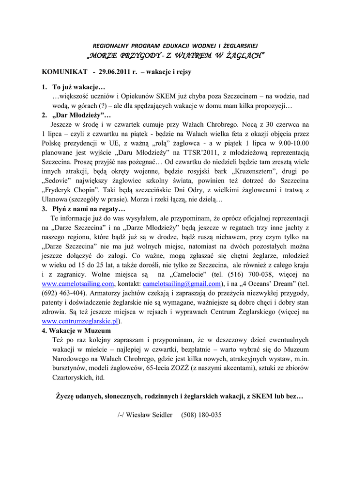 REGIONALNY PROGRAM EDUKACJI WODNEJ I ŻEGLARSKIEJ „MORZE PRZYGODY - Z WIATREM W ŻAGLACH” KOMUNIKAT - 29.06.2011 r. – wakacje i rejsy 1. To już wakacje… …większość uczniów i Opiekunów SKEM już chyba poza Szczecinem – na wodzie, nad wodą, w górach (?) – ale dla spędzających wakacje w domu mam kilka propozycji… 2. „Dar Młodzieży”… Jeszcze w środę i w czwartek cumuje przy Wałach Chrobrego. Nocą z 30 czerwca na 1 lipca – czyli z czwartku na piątek - będzie na Wałach wielka feta z okazji objęcia przez Polskę prezydencji w UE, z ważną „rolą” żaglowca - a w piątek 1 lipca w 9.00-10.00 planowane jest wyjście „Daru Młodzieży” na TTSR’2011, z młodzieżową reprezentacją Szczecina. Proszę przyjść nas pożegnać… Od czwartku do niedzieli będzie tam zresztą wiele innych atrakcji, będą okręty wojenne, będzie rosyjski bark „Kruzensztern”, drugi po „Sedovie” największy żaglowiec szkolny świata, powinien też dotrzeć do Szczecina „Fryderyk Chopin”. Taki będą szczecińskie Dni Odry, z wielkimi żaglowcami i tratwą z Ulanowa (szczegóły w prasie). Morza i rzeki łączą, nie dzielą… 3. Płyń z nami na regaty… Te informacje już do was wysyłałem, ale przypominam, że oprócz oficjalnej reprezentacji na „Darze Szczecina” i na „Darze Młodzieży” będą jeszcze w regatach trzy inne jachty z naszego regionu, które bądź już są w drodze, bądź ruszą niebawem, przy czym tylko na „Darze Szczecina” nie ma już wolnych miejsc, natomiast na dwóch pozostałych można jeszcze dołączyć do załogi. Co ważne, mogą zgłaszać się chętni żeglarze, młodzież w wieku od 15 do 25 lat, a także dorośli, nie tylko ze Szczecina, ale również z całego kraju i z zagranicy. Wolne miejsca są na „Camelocie” (tel. (516) 700-038, więcej na www.camelotsailing.com, kontakt: [email protected]), i na „4 Oceans’ Dream” (tel. (692) 463-404). Armatorzy jachtów czekają i zapraszają do przeżycia niezwykłej przygody, patenty i doświadczenie żeglarskie nie są wymagane, ważniejsze są dobre chęci i dobry stan zdrowia. Są też jeszcze miejsca w rejsach i wyprawach Centrum Żeglarskiego (więcej na www.centrumzeglarskie.pl). 4. Wakacje w Muzeum Też po raz kolejny zapraszam i przypominam, że w deszczowy dzień ewentualnych wakacji w mieście – najlepiej w czwartki, bezpłatnie – warto wybrać się do Muzeum Narodowego na Wałach Chrobrego, gdzie jest kilka nowych, atrakcyjnych wystaw, m.in. bursztynów, modeli żaglowców, 65-lecia ZOZŻ (z naszymi akcentami), sztuki ze zbiorów Czartoryskich, itd. Życzę udanych, słonecznych, rodzinnych i żeglarskich wakacji, z SKEM lub bez… /-/ Wiesław Seidler (508) 180-035