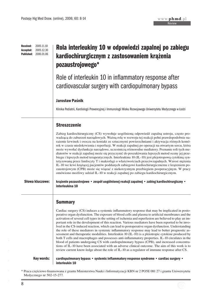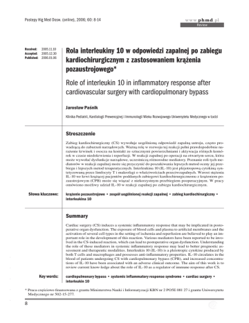 Postepy Hig Med Dosw. (online), 2006; 60: 8-14 www.phmd.pl Review Received: 2005.11.10 Accepted: 2005.12.30 Published: 2006.01.06 Rola interleukiny 10 w odpowiedzi zapalnej po zabiegu kardiochirurgicznym z zastosowaniem krążenia pozaustrojowego* Role of interleukin 10 in inflammatory response after cardiovascular surgery with cardiopulmonary bypass Jarosław Paśnik Klinika Pediatrii, Kardiologii Prewencyjnej i Immunologii Wieku Rozwojowego Uniwersytetu Medycznego w Łodzi Streszczenie Zabieg kardiochirurgiczny (CS) wywołuje uogólnioną odpowiedź zapalną ustroju, często prowadzącą do zaburzeń narządowych. Ważną rolę w rozwoju tej reakcji pełni prawdopodobnie narażenie krwinek i osocza na kontakt ze sztucznymi powierzchniami i aktywacja różnych komórek w czasie niedokrwienia i reperfuzji. W reakcji zapalnej po operacji na otwartym sercu, która może wywołać dysfunkcje narządowe, uczestniczą różnorodne mediatory. Poznanie roli tych mediatorów w reakcji zapalnej może się przyczynić do poszukiwania lepszych metod oceny jej przebiegu i lepszych metod terapeutycznych. Interleukina 10 (IL-10) jest plejotropową cytokiną syntetyzowaną przez limfocyty T i makrofagi o właściwościach przeciwzapalnych. Wzrost stężenia IL-10 we krwi krążącej pacjentów poddanych zabiegowi kardiochirurgicznemu z krążeniem pozaustrojowym (CPB) może się wiązać z niekorzystnym przebiegiem pooperacyjnym. W pracy omówiono możliwy udział IL-10 w reakcji zapalnej po zabiegu kardiochirurgicznym. Słowa kluczowe: krążenie pozaustrojowe • zespół uogólnionej reakcji zapalnej • zabieg kardiochirurgiczny • interleukina 10 Summary - - Cardiac surgery (CS) induces a systemic inflammatory response that may be implicated in postoperative organ dysfunction. The exposure of blood cells and plasma to artificial membranes and the activation of several cell types in the setting of ischemia and reperfusion are believed to play an important role in the development of this reaction. Various mediators have been reported to be involved in the CS-induced reaction, which can lead to postoperative organ dysfunction. Understanding the role of these mediators in systemic inflammatory response may lead to better prognostic assessment and therapeutic modalities. Interleukin 10 (IL-10) is a pleiotropic cytokine produced by both T cells and macrophages and possesses anti-inflammatory properties. IL-10 circulates in the blood of patients undergoing CS with cardiopulmonary bypass (CPB), and increased concentrations of IL-10 have been associated with an adverse clinical outcome. The aim of this work is to review current know-ledge about the role of IL-10 as a regulator of immune response after CS. - cardiopulmonary bypass • systemic inflammatory response syndrome • cardiac surgery • interleukin 10 * Praca częściowo finansowana z grantu Ministerstwa Nauki i Informatyzacji KBN nr 2 PO5E 081 27 i grantu Uniwersytetu Medycznego nr 502-15-277. - - Key words: 8 Paśnik J. – Rola interleukiny 10 w odpowiedzi zapalnej po zabiegu… Full-text PDF: Word count: Tables: Figures: References: http://www.phmd.pl/pub/phmd/vol_60/8610.pdf 2692 1 1 50 Adres autora/autorki: dr n. med. Jarosław Paśnik, Klinika Pediatrii, Kardiologii Prewencyjnej i Immunologii Wieku Rozwojowego Uniwersytet Medyczny, Al. Piłsudskiego 71, 90-329 Łódź; e-mail: [email protected] Wykaz skrótów: ACTH – hormon adrenokortykotropowy (adrenocorticotropin); CARS – zespół kompensacyjnej reakcji przeciwzapalnej (compensatory anti-inflammatory response syndrome); CD – kompleks różnicowania (cluster of differentiation); CPB – krążenie pozaustrojowe (cardiopulmonary bypass); GKS – glikokortykosteroidy; HLA – antygeny ludzkich leukocytów (human leukocyte antigens); IL – interleukina (interleukin); IFN-g – interferon-g; limfocyt Th – limfocyt pomocniczy (helper); MODS – zespół niewydolności wielonarządowej (multiple organ dysfunction syndrome); NK – naturalne komórki cytotoksyczne (natural killer); SIRS – zespół uogólnionej reakcji zapalnej (systemic inflammatory response syndrome); TNF-a – czynnik martwicy nowotworów a (tumor necrosis factor-a). POWIKŁANIA ZAPALNE PO ZABIEGU KARDIOCHIRURGICZNYM – SIRS, MODS I CARS U pacjentów po zabiegu kardiochirurgicznym stwierdza się niekiedy zmiany narządowe, będące wyrazem układowej odpowiedzi ustroju na uraz operacyjny [3,16,18]. Częstość wystąpienia powikłań zwiększa się w przypadku zabiegów wykonywanych w krążeniu pozaustrojowym (cardiopulmonary bypass – CPB). Uszkodzenia tkanek i niewydolność narządową określa się jako zespół systemowej odpowiedzi zapalnej (systemic inflammatory response syndrome – SIRS). Do rozpoznania SIRS upoważnia stwierdzenie dwu lub więcej spośród objawów, takich jak: wzrost temperatury ciała, tachykardia, zaburzenia oddychania i hiperwentylacja, leukocytoza lub leukopenia, wzrost lub spadek skurczowego ciśnienia tętniczego [34]. - - - - - Jak wskazują dotychczasowe doniesienia, występowanie powikłań zapalnych po zabiegu kardiochirurgicznym jest związane z procedurami medycznymi stosowanymi w czasie jego trwania. Zarówno aktywacja komórek układu odpornościowego przez kontakt z aparaturą do CPB jak i hipotermia, zatrzymanie krążenia, zamknięcie aorty – niedokrwienie mięśnia sercowego, a także środki anestezjologiczne mają istotne znaczenie dla rozwoju reakcji zapalnej [6,8,31,41]. Rozważana jest także rola stresu operacyjnego jako czynnika aktywującego komórki układu odpornościowego i doprowadzającego do wystąpienia niekontrolowanej reakcji zapalnej [18]. Zabieg kardiochirurgiczny wywołuje szybką aktywację komórek żernych. Aktywowane neutrofile wykazują zwiększoną ekspresję cząstek adhezyjnych CD11b/CD18 już w pierwszych minutach po rozpoczęciu CPB [36]. W tym okresie zabiegu zwiększa się także chemotaksja i aktywność fagocytarna tych komórek, 