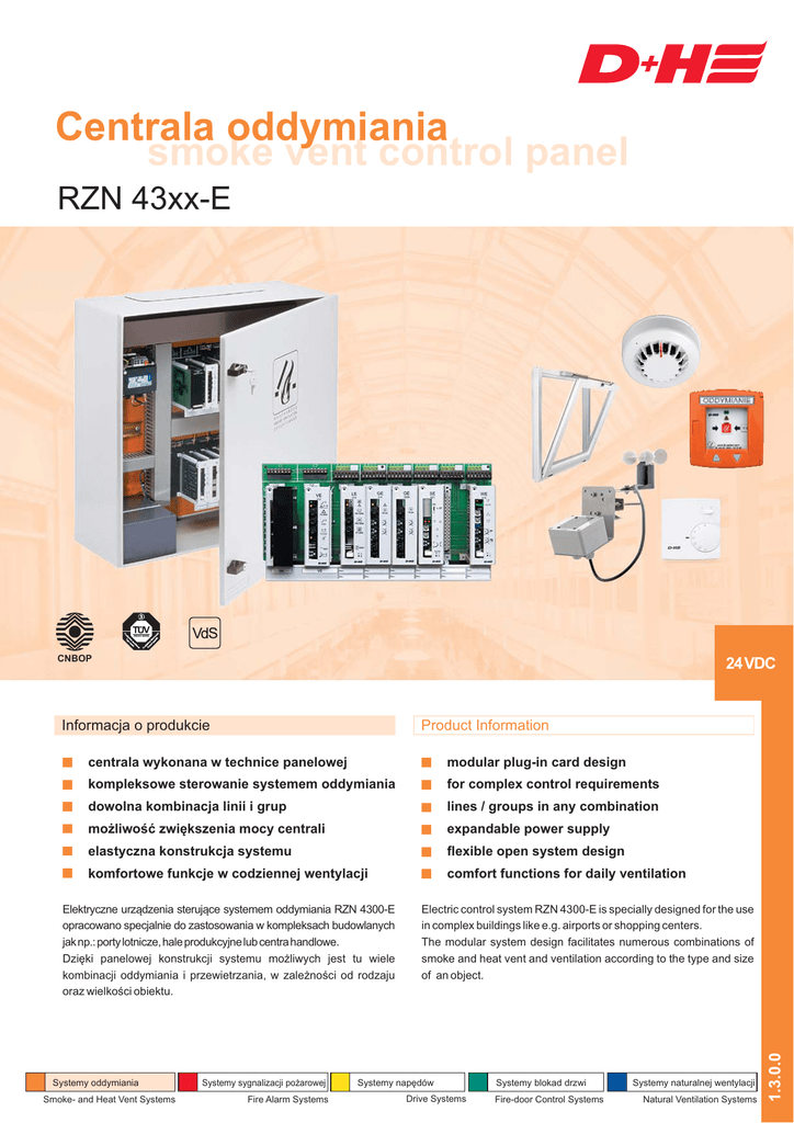 Centrala oddymiania smoke vent control panel RZN 43xx-E CNBOP 24VDC Informacja o produkcie Product Information centrala wykonana w technice panelowej modular plug-in card design kompleksowe sterowanie systemem oddymiania for complex control requirements dowolna kombinacja linii i grup lines / groups in any combination możliwość zwiększenia mocy centrali expandable power supply elastyczna konstrukcja systemu flexible open system design komfortowe funkcje w codziennej wentylacji comfort functions for daily ventilation Systemy oddymiania Smoke- and Heat Vent Systems Systemy sygnalizacji pożarowej Fire Alarm Systems Electric control system RZN 4300-E is specially designed for the use in complex buildings like e.g. airports or shopping centers. The modular system design facilitates numerous combinations of smoke and heat vent and ventilation according to the type and size of an object. Systemy napędów Drive Systems Systemy blokad drzwi Fire-door Control Systems Systemy naturalnej wentylacji Natural Ventilation Systems 1.3.0.0 Elektryczne urządzenia sterujące systemem oddymiania RZN 4300-E opracowano specjalnie do zastosowania w kompleksach budowlanych jak np.: porty lotnicze, hale produkcyjne lub centra handlowe. Dzięki panelowej konstrukcji systemu możliwych jest tu wiele kombinacji oddymiania i przewietrzania, w zależności od rodzaju oraz wielkości obiektu. Parametry Features - płyta główna wyposażona w sloty do montażu paneli, 2 gniazda montażowe dla modułów dodatkowych, zasilacz z układem prostownikowym - maksymalny prąd napędu 10A na grupę (panel grupowy GE) - opcjonalnie moduły stabilizacji napięcia - możliwość podłączenia do 8 przycisków oddymiania i 14 czujek pożarowych na każdą linię (panel liniowy LE) (dozwolone stosowanie tylko czujek dopuszczonych przez D+H) - możliwość podłączenia optycznych i akustycznych urządzeń sygnalizacji zadziałania - komfortowe funkcje wentylacji w połączeniu z dodatkowymi modułami - możliwość rozszerzenia konfiguracji centrali w przypadku zmian dokonywanych w budynku - włączalne funkcje bezpieczeństwa: uszkodzenie = alarm, zdalne resetowanie czujek dymowych - system szyn nośnych dla różnych modułów funkcjonalnych - wygodne sterowanie pogodowe z możliwością ustawiania siły wiatru oraz czasu opóźnienia (WE 516) - podzespoły przyłączeniowe dla urządzenia sterującego GLT (opcja) - specjalne podzespoły służące tylko do wentylacji (opcja) - w zamykanej obudowie natynkowej z blachy stalowej - 72 godziny awaryjnego zasilania w wypadku przerwy w dostawach zasilania sieciowego - w ofercie D+H jako akcesoria dostępne są przyciski oddymiania i przewietrzania, napędy elektryczne, automatyczne czujki pożarowe oraz urządzenia sterujące automatyką pogodową i regulujące temperaturę w pomieszczeniu - system monitorowania przewodów pod kątem występowania zwarć i przerwania. - funkcja resetowania systemu oddymiana z poziomu np: SAP za pomocą modułu IM 44-E - (UWAGA) Podłączanie napędów obcych do central RZN wymaga konsultacji z D+H - mounting plate with motherboard, plug-in units, 2 plug-in slots for supplementary modules, supply plug-in card and stabilization - increase of actuating current in 16A-steps - maximum 10A actuating current per group - modular voltage stabilization (optional) - connection of max. 8 smoke vent buttons + 14 fire detectors per line - only D+H approved detectors permissible - connection possibility for optical and acoustical alarm devices - functions for comfortable ventilation by supplementary modules - possibility of retrofitting in case of building alterations - switchable smoke vent safety function: fault = alarm and smoke detector remote reset - smoke vent retriggering function (GE 628) - mounting rail system for different function modules - comfortable weather control with adjustable wind force and retention time (WE 516) - intersecting point componentries for GLT-control (optional) - special Only-Ventilation componentries (optional) - in lockable steel sheet housing, surface type - 72 hours emergency supply in case of power failure - smoke vent and vent buttons, window drives, automatic fire detectors including wind, rain and room temperature controls available as accessories in D+H-program - line monitoring for short circuit and interruption Przykład zastosowania Example for Application regulator temp.pomieszczenia room temp. control przycisk wentylacji vent button ZLT / BMS 621 panel serwo servo plug-in unit grupa / group GEL 542 GE panel grupowy do wentylacji group plug-in unit for ventilation 628 F6,3A 2 15 min panel grupowy group plug-in unit panel liniowy line plug-in unit przycisk oddymiania smoke vent button 45 30 2 20 napęd okienny window drive sec 60 40 LE 513 linia / line 516 panel pogodowy weather plug-in unit czujka a wind/rain transmitter NIE IA M DY OD OK Ai 1 2 r I n 3 di 4 sterowanie zewnętrzne external control czujka pożarowa fire detector RZN 43xx-E ca to 5 r 6 7 8 Bft . 9 10 panel wskazań pogodowych air indicator panel Panele Plug-in Cards LE 513 WE 516 - line plug-in card for connecting of maximum 14 fire detectors and 8 smoke vent buttons each - functions: · line On/Off · alarm/fault - panel liniowy do przyłączenia maksymalnie 14 czujek oddymiania oraz 8 przycisków oddymiania na linię - funkcje: · zał. / wył. linii · sygnalizacja alarmu / uszkodzenia GE 628 V2 panel grupowy 10A do sterowania napędów oddymiania w powiązaniu z LE 513 - funkcje: regulacja czasu wentylacji oraz poprzez ograniczenie wysuwu napędu regulacja stopnia OTWARCIA do wentylacji - funkcja resetowania instalacji oddymiania - group plug-in card for control of smoke and heat vent drives in conjunction with LE 513 - functions: · ventilation time and OPENrunning time adjustable · smoke vent retriggering function · power failure-CLOSE function GE 628-L V2 - panel grupowy do wentylacyjnego sterowania napędami (10A) - funkcje: regulacja czasu 