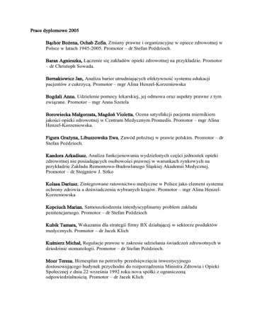 Prace dyplomowe 2005 Bąchor Bożena, Ochab Zofia, Zmiany prawne i organizacyjne w opiece zdrowotnej w Polsce w latach 1945-2005. Promotor – dr Stefan Poździoch. Baran Agnieszka, Łączenie się zakładów opieki zdrowotnej na przykładzie. Promotor – dr Christoph Sowada. Bernakiewicz Jan, Analiza barier utrudniających efektywność systemu edukacji pacjentów z cukrzycą. Promotor – mgr Alina Henzel-Korzeniowska Bogdali Anna, Udzielenie pomocy lekarskiej, jej odmowa oraz aspekty prawne z tym związane. Promotor – mgr Anna Szetela Borowiecka Małgorzata, Magdoń Violetta, Ocena satysfakcji pacjenta miernikiem jakości opieki zdrowotnej w Centrum Medycznym Promedis. Promotor – mgr Alina Henzel-Korzeniowska. Figura Grażyna, Libuszowska Ewa, Zawód położnej w prawie polskim. Promotor – dr Stefan Poździoch. Kandora Arkadiusz, Analiza funkcjonowania wydzielonych części jednostek opieki zdrowotnej nie posiadających osobowości prawnej w warunkach rynkowych na przykładzie Zakładu Remontowo-Budowlanego Śląskiej Akademii Medycznej. Promotor – dr Stojgniew J. Sitko Kolasa Dariusz, Zintegrowane ratownictwo medyczne w Polsce jako element systemu ochrony zdrowia a doświadczenia wybranych krajów. Promotor – mgr Alina HenzelKorzeniowska Kopciuch Marian, Samouszkodzenia interdyscyplinarny problem zakładu penitencjarnego. Promotor – dr Stefan Poździoch Kubik Tamara, Wskazania dla strategii firmy BX działającej w sektorze produktów medycznych. Promotor – dr Jacek Klich Kuśnierz Michał, Regulacje prawne w zakresie udzielania świadczeń zdrowotnych w dziedzinie stomatologii. Promotor – dr Stefan Poździoch. Moor Teresa, Biznesplan na potrzeby przedsięwzięcia inwestycyjnego dostosowującego budynek przychodni do rozporządzenia Ministra Zdrowia i Opieki Społecznej z dnia 22 września 1992 roku nova spółki z ograniczoną odpowiedzialnością. Promotor – dr Jacek Klich Beata Piórecka, Bezpieczeństwo żywności i żywienia w ustawodawstwie międzynarodowym i polskim. Promotor – dr Stefan Poździoch Popławska Małgorzata, Plan Strategiczny Krakowskiego Pogotowia Ratunkowego w latach: 2005-2006. Promotor – dr Stefan Poździoch Swolkień Jolanta, Strategia rozwoju na przykładzie tworzenia Centrum Diagnostyki Laboratoryjnej w ramach Szpitala Uniwersyteckiego w Krakowie. Promotor – dr Jacek Klich. Szopa Magdalena, Epidemia otyłości w świetle badań genetycznych. Analiza poszerzona o ocenę związku z uwarunkowaniem osteoporozy. Promotor – dr Grażyna Jasińska Witkowska-Gacoń Danuta, Niemiec Krzysztof, Inteligencja emocjonalna a sukces managera opieki zdrowotnej. Promotor – dr Krzysztof Brocławik