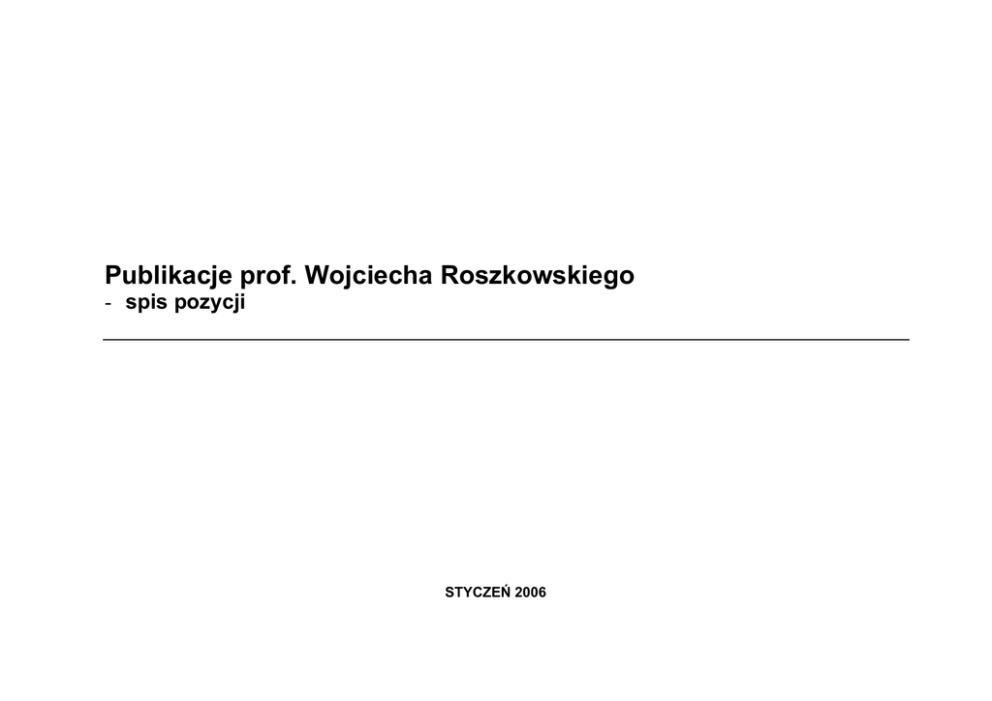 Publikacje prof. Wojciecha Roszkowskiego - spis pozycji STYCZEŃ 2006 Publikacje prof. . Wojciech Roszkowskiego KSIĄŻKI Tytuł Wydawca Rok wydania Miejsce Słownik biograficzny Europy Środkowo-Wschodniej XX wieku RYTM 2005 - (opracowanie 500 haseł) Półwiecze - Historia polityczna świata po 1945 roku Wydawnictwo Naukowe PWN 2005, 1998 Cień Jałty Raport Historia Polski 1914 – 2004 Cz. 9, 10 Historia dla maturzysty Wiek XX Podręcznik Muzeum Powstania Warszawskiego Wydawnictwo Naukowe PWN Wydawnictwo Szkolne PWN 2005 Najnowsza historia Polski 1945-1980 Najnowsza historia Polski 1980-2002 Świat Książki 2003 Warszawa - 832 Świat Książki 2003 Warszawa - 296 Do horyzontu i z powrotem. Eseje z historii i współczesności (To the Horizon and Backwards. Essays in Contemporary History) Znak 2000 Kraków - 289 Transformacja i postkomunizm Instytut Studiów Politycznych PAN 1999 Warszawa Jan Kofman 268 2 Współpraca Liczba stron Jan Kofman -współredaktor 1458 - 636,665 - 109 2004 - 500 2004 Anna Radziwiłł Warszawa styczeń 2006 Publikacje prof. . Wojciech Roszkowskiego Wiedza Powszechna 1999 Changing Rules. Polish Political and Economic Transformation in Comparative Perspective Institute of Political Studies PAS 1997 Historia 1789-1871 Wydawnictwo Szkolne PWN Wydawnictwo Szkolne PWN Wydawnictwo Szkolne PWN Wydawnictwo Szkolne PWN 1997-1998 Warszawa 1997-1998 Warszawa 1997-1998 Warszawa 1997-1998 Warszawa Institute of Political Studies Polish Academy of Sciences Puls 1995 Warszawa - 255 1994 London - 638 Plus 1994 London - 1043 Historia 1871-1939 Historia 1939-1956 Historia 1956-1997 Land Reforms In East Central Europe after Word War One Najnowsza historia Polski 1914-1993 vol. 1 Najnowsza historia Polski 1914-1993 vol. 2 3 Warszawa Andrzej Garlicki; Zbigniew Landau; Piotr Stawecki; Jerzy Tomaszewski Warszawa Leslie T.Holmes 543 Encyklopedia historii Rzeczypospolitej 178 Anna Radziwiłł Anna Radziwiłł Anna Radziwiłł Anna Radziwiłł styczeń 2006 Publikacje prof. . Wojciech Roszkowskiego Wydawnictwo Naukowe PWN East European Monograph 1999 Warszawa - 482 1991 Colorado Boulder - 203 Dramat narodów bałtyckich (pod pseudonimem Jan Korzeń) Wydawnictwo "Pokolenie", 1987 - - 73 Gospodarcza rola większej prywatnej własności ziemskiej w Polsce 1918-1939 SGPiS 1986 Warszawa - 431 Kształtowanie się podstaw polskiej gospodarki państwowej w przemyśle i bankowości w latach 1918-1924 Państwowe Wydawnictwo Naukowe 1982 Warszawa - 267 Społeczny ruch ekonomistów w Polsce przed rokiem 1939 Polskie Towarzystwo Ekonomiczne 1977 Warszawa - 128 Historia Polski 1914-1998 Landowners in Poland 1918-1939 East European Monographs No 299 4 styczeń 2006 Publikacje prof. . Wojciech Roszkowskiego ROZDZIAŁY Tytuł rozdziału Numery stron „Zarys historii integracji europejskiej po II wojnie światowej” Tytuł książki Autor książki Wydawnictwo Rok Miejsce Integracja europejska Red.: Miłowit Kuniński - 2005 - “ New Europe. The Impast of the First Decode.” - Institute of Political Studis and Collegium Civitas 2005 Warszawa Opracowanie: M. Jasiński, R. Biniak Redaktorzy: Marek Jan Chodkiewicz; John Radzilowski; Dariusz Tolczyk A. Cubała Zin Zin Press 2005 Poznań Leopolis Press CHarlotesville 2003 USA, Virginia Rytm 2003 Warszawa „The Land Between: the Making of East Central Europe”; 13 -176 “Economic transformation” (współautor: Jan Kofman) 139-176 WSTĘP - „Solidarność”- nadzieja zwykłych ludzi: 25 lat ( komiks) “Points of Departure” 17 – 58 „Poland Transformation. A Work In Progress.” WSTĘP - „Ku wolności…: Międzynarodowe i psychologiczno- socjologiczne aspekty Powstania Warszawskiego 5 styczeń 2006 Publikacje prof. . Wojciech Roszkowskiego „Pamięć i odpowiedzialność” - - - “ Polacy i Żydzi oraz wspólne miary ocen” 519 – 529 - „Świat XX wieku” 211214 „Prawda i pojednanie. W 80- rocznicę urodzin Władysława Bartoszewskiego” „Wielki atlas historyczny” „Martyrology of Christian Churches In East Central Europe In the Years 1944- 1956” 24-46 Tom II “Churches in the Century of Totalitarian Systems” - “Bydgoski marzec 1981 – więcej pytań niż odpowiedzi” 23- 32 ” Marzec 1981. Perspektywa społeczeństwa obywatelskiego” - „ Rządy koalicji Sojuszu Lewicy Demokratycznej i Polskiego Stronnictwa Ludowego” 50- 55 „10-lecia Polski Niepodległej 1989 – 1999” Redaktor: Waldemar Kuczyński 6 - Ośrodek Myśli 2004 Politycznej; Centrum Konserwatywne Oficyna Wydawnicza Rytm Demark Kraków, Wrocław 2002 Warszawa 2002 Warszawa Instytut Europy Środkowo – Wschodniej 2001 Lublin Instytut Wydawniczy Świadectwo 2001 Bydgoszcz Fundacja Księgi 2001 10- lecia Polski Niepodległej” Warszawa styczeń 2006 Publikacje prof. . Wojciech Roszkowskiego „ Podział Europy w latach 1944- 1955” 68- 71 „Polska i Niemcy w XX wieku” Redaktorzy tomu: Ursula A.J. Becker; Włodzimierz Borodziej; Krzysztof Ruchniewicz „Defat In Victory: Polish War Efforts 1939 – 1945” 221–232 “Latvia in Warld War II” Praca zbiorowa “Litewskie partie chłopskie 1905- 1970” 478492 “Europa nieprowincjonalna” “Dylematy rozwoju społecznego I gospodarczego Polski w punktach zwrotnych historii XX wieku” 225239 „Do niepodległości 1918,1944/45,1989. Wizje- drogi- spełnienia” Praca zbiorowa pod red. Krzysztofa Jasiewicza Praca zbiorowa pod red. Wojciecha Wrzesińskiego „On Systemie transformation In China and Russia” 1-7 “The Transformation of Communist and PostCommunist Systems” Praca zbiorowa Przedmowa 5-7 “Szara księga” Radosław Januszewski, Jan Strękowski 7 Wydawnictwo Poznańskie 2001 Latvijas vestures 2000 institute apgads Poznań Rłga ISP PAN 1999 Warszawa Wydawnictwo Sejmowe 1998 Warszawa 1997 Canbera, Australia 1996 Warszawa Wydawnictwo Most styczeń 2006 Publikacje prof. . Wojciech Roszkowskiego “Warunki powstania Polskiej Rzeczypospolitej Ludowej” 31-50 „Historia gospodarcza