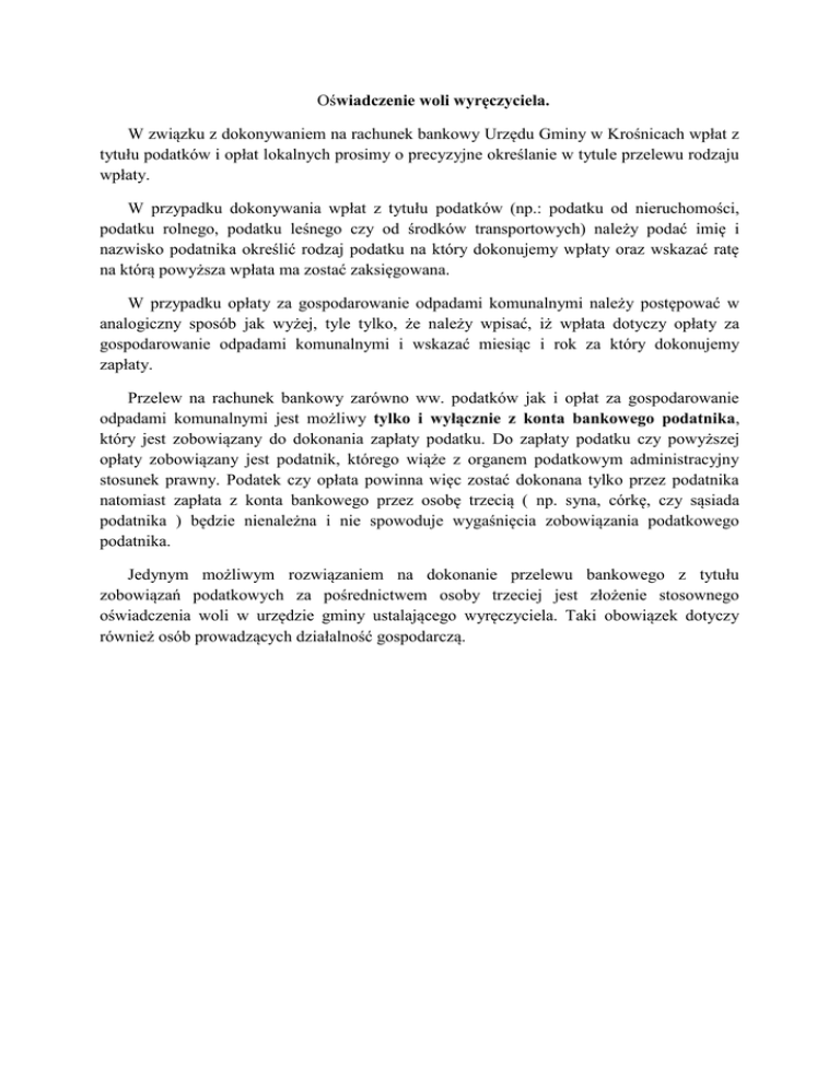 Oświadczenie woli wyręczyciela. W związku z dokonywaniem na rachunek bankowy Urzędu Gminy w Krośnicach wpłat z tytułu podatków i opłat lokalnych prosimy o precyzyjne określanie w tytule przelewu rodzaju wpłaty. W przypadku dokonywania wpłat z tytułu podatków (np.: podatku od nieruchomości, podatku rolnego, podatku leśnego czy od środków transportowych) należy podać imię i nazwisko podatnika określić rodzaj podatku na który dokonujemy wpłaty oraz wskazać ratę na którą powyższa wpłata ma zostać zaksięgowana. W przypadku opłaty za gospodarowanie odpadami komunalnymi należy postępować w analogiczny sposób jak wyżej, tyle tylko, że należy wpisać, iż wpłata dotyczy opłaty za gospodarowanie odpadami komunalnymi i wskazać miesiąc i rok za który dokonujemy zapłaty. Przelew na rachunek bankowy zarówno ww. podatków jak i opłat za gospodarowanie odpadami komunalnymi jest możliwy tylko i wyłącznie z konta bankowego podatnika, który jest zobowiązany do dokonania zapłaty podatku. Do zapłaty podatku czy powyższej opłaty zobowiązany jest podatnik, którego wiąże z organem podatkowym administracyjny stosunek prawny. Podatek czy opłata powinna więc zostać dokonana tylko przez podatnika natomiast zapłata z konta bankowego przez osobę trzecią ( np. syna, córkę, czy sąsiada podatnika ) będzie nienależna i nie spowoduje wygaśnięcia zobowiązania podatkowego podatnika. Jedynym możliwym rozwiązaniem na dokonanie przelewu bankowego z tytułu zobowiązań podatkowych za pośrednictwem osoby trzeciej jest złożenie stosownego oświadczenia woli w urzędzie gminy ustalającego wyręczyciela. Taki obowiązek dotyczy również osób prowadzących działalność gospodarczą.