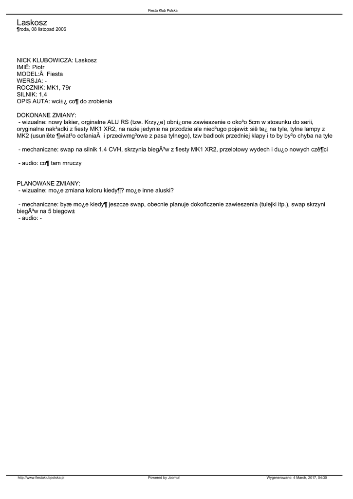Fiesta Klub Polska Laskosz ¶roda, 08 listopad 2006 NICK KLUBOWICZA: Laskosz IMIÊ: Piotr MODEL: Fiesta WERSJA: ROCZNIK: MK1, 79r SILNIK: 1,4 OPIS AUTA: wci±¿ co¶ do zrobienia DOKONANE ZMIANY: - wizualne: nowy lakier, orginalne ALU RS (tzw. Krzy¿e) obni¿one zawieszenie o oko³o 5cm w stosunku do serii, oryginalne nak³adki z fiesty MK1 XR2, na razie jedynie na przodzie ale nied³ugo pojawi± siê te¿ na tyle, tylne lampy z MK2 (usuniête ¶wiat³o cofania i przeciwmg³owe z pasa tylnego), tzw badlook przedniej klapy i to by by³o chyba na tyle - mechaniczne: swap na silnik 1.4 CVH, skrzynia biegów z fiesty MK1 XR2, przelotowy wydech i du¿o nowych czê¶ci - audio: co¶ tam mruczy PLANOWANE ZMIANY: - wizualne: mo¿e zmiana koloru kiedy¶? mo¿e inne aluski? - mechaniczne: byæ mo¿e kiedy¶ jeszcze swap, obecnie planuje dokoñczenie zawieszenia (tulejki itp.), swap skrzyni biegów na 5 biegow± - audio: - http://www.fiestaklubpolska.pl Powered by Joomla! Wygenerowano: 4 March, 2017, 04:30
