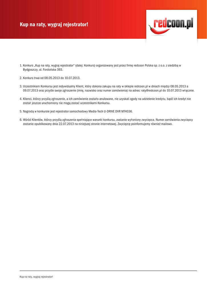 Kup na raty, wygraj rejestrator! 1. Konkurs „Kup na raty, wygraj rejestrator“ (dalej: Konkurs) organizowany jest przez firmę redcoon Polska sp. z o.o. z siedzibą w Bydgoszczy, ul. Fordońska 393. 2. Konkurs trwa od 08.05.2013 do 10.07.2013. 3. Uczestnikiem Konkursu jest indywidualny Klient, który dokona zakupu na raty w sklepie redcoon.pl w dniach między 08.05.2013 a 09.07.2013 oraz przyśle swoje zgłoszenie (imię, nazwisko oraz numer zamówienia) na adres: [email protected] do 10.07.2013 włącznie. 4. K lienci, którzy przyślą zgłoszenie, a ich zamówienie zostało anulowane, nie uzyskali zgody na udzielenie kredytu, bądź ich kredyt nie został jeszcze uruchomiony nie mogą zostać uczestnikami Konkursu. 5. Nagrodą w konkursie jest rejestrator samochodowy Media-Tech U-DRIVE DVR MT4036. 6. Wśród Klientów, którzy przyślą zgłoszenia spełniające warunki konkursu, zostanie wyłoniony zwycięzca. Numer zamówienia zwycięzcy zostanie opublikowany dnia 22.07.2013 na niniejszej stronie internetowej. Zwycięzcę poinformujemy również mailowo. Kup na raty, wygraj rejestrator!