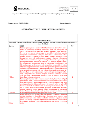 Projekt współfinansowany ze środków Unii Europejskiej w ramach Europejskiego Funduszu Społecznego Numer sprawy Oś.271.02.2012 Załącznik nr 1A SZCZEGÓLOWY OPIS PRZEDMIOTU ZAMÓWIENIA SP TARNÓW OPOLSKI Zajęcia dla dzieci ze specjalnymi trudnościami w czytaniu i pisaniu, w tym także zagrożonych ryzykiem dysleksji Ilość Nazwa OPIS Pomoc dydaktyczna z zestawu linii bambusowej. Zawartość umieszona w poręcznej wysokiej kolorowej tubie nie mniejszej niż 31cm z uchwytem. Wykonana z twardej tektury z zamykaną pokrywką z tworzywa sztucznego, co umożliwi dzieciom szybkie sprzątanie i utrzymanie porządku. Zawiera 32 bambusowe, lakierowane kształty (kwadrat, trójkąt, kółko, kółko z dziurką). Każdy kształt jest w dwóch wielkościach - małym i dużym. 4 kolorowe oddzielne woreczki w różnych jednolitych kolorach wykonanych z grubego materiału, o mocnych szwach. Dla łatwego trzymania worek zakończony bambusową obręczą o średnicy nie mniejszej niż 11 cm i zapiętą na 6 metalowych zatrzasków co umożliwia łatwe odpięcie i wypranie worka. Worek musi posiadać gumowy sznurek ze stoperem, umożliwiający dopasowanie otworu do wielkości dłoni gracza tak, aby zawartość nie była widoczna dla grającego. Zabawa polega na jak najszybszym wykonaniu polecenia prowadzącego i rozpoznaniu z pomocą dotyku- kształtu, wielkości, ilości i cech wspólnych elementów umieszczonych w worku. Dołączona Pelikan 2 instrukcja w języku polskim. Pomoc dydaktyczna, która otrzymała certyfikat „Klasy Marzeń” pod patronatem MEN.4 kolorowe bambusowe specjalnie wyprofilowane łyżki o długości przynajmniej 21cm. Łyżki posiadają otwór oraz cienką gumkę ułatwiającą nałożenie i utrzymanie kulki na łyżce. 36 kulek w czterech podstawowych kolorach ponumerowanych od 1 do 9, oraz 4 wąskie materiałowe woreczki zakończone pierścieniem a z drugiej strony gumką. Całość zapakowana w poręcznej tubie. Produkt do ćwiczeń nauki pisania, przeprowadzenia zadań Gąsienice matematycznych zajęć ruchowych i utrwalenia liczb. 2 Pomoc dydaktyczna wykonana w dużej części z bambusa. Zawiera cienkie, bambusowe listewki służące do utworzenia planszy oraz 25 bambusowych wież różnej wielkości, kolorze z wgłębieniem na górze. Gra ćwiczy i usprawnia pracę rąk, koncentrację, cierpliwość i współpracę w grupie. Zawartość umieszona w wysokiej kolorowej Wieże tubie 2 1 Projekt współfinansowany ze środków Unii Europejskiej w ramach Europejskiego Funduszu Społecznego Rybki Tangalo Schattenmemo plansza zadaniowa Schattenmemo płytki zadaniowe Kreativmemo planasza zadaniowa Kreativmemo wkłady zadaniowe Abecadło - 150 liter Pomoc do ćwiczenia precyzji rąk i koordynacji ruchowej. Wykonana z bambusa. Zawiera m.in. dużą ilość bambusowych rybek w 3 różnych kolorach i kształtach, bambusowe miseczki oraz opaski samuraja. Zawartość umieszona w poręcznej wysokiej tubie. 2 drewniane pudełka (jasne i ciemne), w których mieści się 7 drewnianych klocków o różnym kształcie i wielkości: Zestaw zawiera 30 sztywnych kart z obrazkami. Każda karta posiada wycięty fragment, który dziecko musi wypełnić klockami z pudełka, według oznaczonej ilości przedstawionej na obrazku. Ćwiczy kierunkowość, orientacje przestrzenną, analizę i syntezę dobieranie właściwych elementów. Całość zamieszczona w kartonowym pudełku. Duże, żółte, lakierowane, drewniane pudełko o wymiarach nie mniejszych niż wys. 9, dł. 40, gł.17 cm z 5 głębokimi szufladami. W przedniej części każdej z szuflad poręczna kolorowa gałka, wyznaczająca m.in. ułożenie ciągów rytmicznych. Do zestawu dołączono ponad 30 drewnianych, kwadratowych płytek nie mniejszych niż 6 cm z kolorowymi obrazkami, namalowanymi trudnościeralnymi i nietoksycznymi farbami. Budowanie zdań, tworzenie historyjek, segregowanie , układanie w oparciu o wzory. Zawartość minimum 90 drewnianych, kwadratowych płytek nie mniejszych niż 6 cm z kolorowymi obrazkami, namalowanymi trudnościeralnymi i nietoksycznymi farbami. Motywy na płytkach bliskie otoczeniu dzieci ze środowiska wiejskiego i miejskiego. Każdy obrazek powtórzony pięciokrotnie, jako: kolorowy obrazek dwukrotnie, bez koloru z konturem, czarny motyw na białym tle, biały motyw na czarnym tle. Płytki umożliwiają: klasyfikowanie obrazków wg cech, figur, łączenie w pary, układanie prostych zdań. Drewniane, kwadratowe pudełko o wymiarach nie mniejszych niż 29 cm z okrągłymi otworami i przykrywkami do nich. Otwory umożliwiają umieszczanie płaskich elementów. Plansza pozwala na przeprowadzenie zadań z zakresu płynności wzrokowej, szukania podobieństw i szczegółów oraz zajęć o różnej tematyce. Minimum 12 długich szablonów po 4 z każdej grupy wykonanych z tworzywa sztucznego z 96 obrazkami z podstawowymi pojęciami jak warzywa, owoce nad , pod , stary młody… Minimum 220 obrazków umieszczonych na 28 długich szablonach wykonanych z masywnego, elastycznego tworzywa sztucznego. Szablony posiadają numerację pozwalającą rozróżnić grupy obrazków o bardzo różnorodenj tematyce pojęć pozwalające na klasyfikowanie wg stopnia trudności. M.in. pojęcie kredki, klaun, czarne koła. Abecadło drewniane składające się przynajmniej z 25 sześcianów. Na każdej ściance znajduje się literka. Abecadło zawierają znaki polskie jak: ó, ż, ć, ś powtórzone dwukrotnie, Samogłoski i spółgłoski rozróżnione są kolorami. Klocki umieszczone w drewnianym pudełku. A,E,I,O powtórzone przynajmniej siedmiokrotnie co umożliwia układanie wyrazów i budowanie prostych zdań, przeprowadzanie ćw. ortograficznych i zabaw logicznych 2 2 1 1 1 1 5 2 Projekt współfinansowany ze środków Unii Europejskiej w ramach Europejskiego Funduszu Społecznego Tablica z literkami Teatrzyk - scena Kurtyna, oświetlenie, 2 pacynki Puzzelator elementy do działań Puzzelator karty zadaniowe Puzzelator 