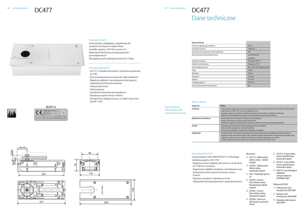Samozamykacze DC477 69 Samozamykacze ASSA ABLOY DC477 Samozamykacz podłogowy z regulowaną siłą zamykania do dużych i ciężkich drzwi. Certyfikat zgodny z EN1154, rozmiar 2-4 Odpowiedni dla drzwi przeciwpożarowych i przeciwdymowych Dla pojedynczych i podwójnych drzwi do 170 kg DC477.2 Via Modena, 68 40017 San Giovanni in Persiceto Bologna - Italy 0425.DO.2221 EN 1154:1996+A1:2002 10 3 8 24 1 1 4 Zmienna regulacja siły zamykania EN 2-4 Szerokość drzwi do 1100 mm Ochrona przeciwpożarowa i przeciwdymowa Tak Kierunek otwierania/zamykania drzwi Lewe/Prawe lub podwójne Szybkość zamykania Pomiędzy 150°-0° Prędkość zatrzaskiwania Pomiędzy 15°-0° Opcja stałego otwarcia 90° / 105° / Brak stałego otwarcia Waga 5.4 kg Wysokość 70 mm Głębokość 110 mm Długość 277 mm Certyfikat zgodny z EN 1154 Znak CE dla wyrobów budowlanych Tak Zalety w skrócie Tutaj znajdują się indywidualne zalety modeli samozamykaczy. !""!#!$%&'#()*+,*#"-.-!-# DC477 Dane techniczne Dane techniczne Charakterystyka DC477 · od 175° w obydwu kierunkach z hydrauliczną kontrolą do 150°. · Dwa termodynamiczne zawory dla stałej wydajności · Regulacja szybkości i zatrzaskiwania drzwi poprzez regulowanie frontowych zaworów. · Funkcja back-check. · Żeliwny korpus. · Ocynkowana skrzynka samozamykacza. · Wymienny trzpień od 0 do +30mm. · Dostępne bez stałego otwarcia, ze stałym otwarciem kąt 90° i 105°. Segmenty: Zalety Architekci - Szeroki zakres zastosowań: do drzwi przeciwpożarowych i przeciwdymowych oraz do drzwi standardowych. - Stałe otwarcie na 90°,105° oraz bez stałego otwarcia. - Dostępne trzpienie: kwadratowe włoskie, kwadratowe francuskie, prostokątne niemieckie. - Wykończenia architektoniczne: płyta z polerowanej stali nierdzewnej, matowej. Budowlańcy i Instalatorzy - Uniwersalny do drzwi lewych i prawych oraz podwójnych. - Zawór ciśnieniowy do ochrony przed nadużyciem. - Możliwość regulacji z obudową aby rozwiązać problemy montażu bez zdejmowania drzwi. Handel - Redukcja kosztów zapasów dzięki modułowej gamie produktów. - Jeden produkt pasujący do wszystkich aplikacji. - Akcesoria uzupełniające dostępne dla całej gamy produktów. Użytkownik - Idealny do wnętrz mieszkalnych dzięki regulacji siły otwierania/zamykania ułatwiającej otwieranie/ zamykanie. - Regulowana siła otwierania/zamykania aby zaspokoić potrzeby użytkownika i wymagania konstrukcyjne drzwi. - Ułatwione otwieranie oraz zwiększenie dostępności dzięki technologii cam-motion. - Funkcja regulacji tłumienia otwierania BC zapewnia ochronę dla drzwi i ścian. 15±1 49-59 94 Specyfikacja dla DC477 Samozamykacze ASSA ABLOY DC477 z technologią zębatkową zgodne z EN 1154 · Regulowana siła zamykania, EN rozmiar 2-4, dla drzwi do 1100 mm szerokości · Regulowana szybkość zamykania, zatrzaskiwania oraz funkcja back-check, poprzez frontowe zawory · Znak CE · Regulacja wysokości z obudową o 9 mm · Odpowiedni dla lewych/prawych i podwójnych drzwi 70 5±1 261 110 130 68 277 294 Akcesoria: AC115 - Odwracalne dolne ramię – włoski trzpień AC393 - Odwracalne dolne ramię niemiecki trzpień AC8 - Podwójna górna oś AC583 - Prawe i lewe dolne ramię. Kwadratowy włoski trzpień. AC392 - Prawe i lewe dolne ramię. Niemiecki trzpień AC384 - Górna oś dla lewych i prawych drzwi. AC373 - Prawe dolne ramię. Kwadratowy francuski trzpień. AC374 - Lewe dolne ramię. Kwadratowy francuski trzpień. AC612- Uszczelniające składniki samozamykacza podłogowego. Pokrywy AC534: Polerowana stal nierdzewna A0534IR Matowa stal nierdzewna A0534HR Mosiądz polerowany A0534PR
