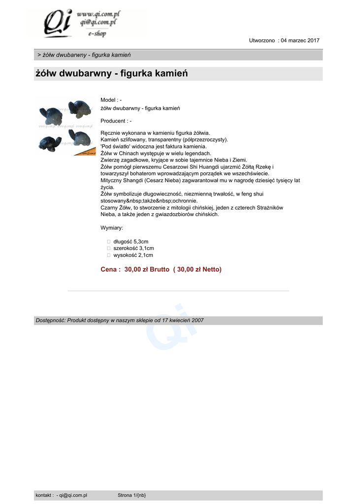 Utworzono : 04 marzec 2017 > żółw dwubarwny - figurka kamień żółw dwubarwny - figurka kamień Model : żółw dwubarwny - figurka kamień Producent : Ręcznie wykonana w kamieniu figurka żółwia. Kamień szlifowany, transparentny (półprzezroczysty). 'Pod światło' widoczna jest faktura kamienia. Żółw w Chinach występuje w wielu legendach. Zwierzę zagadkowe, kryjące w sobie tajemnice Nieba i Ziemi. Żółw pomógł pierwszemu Cesarzowi Shi Huangdi ujarzmić Żółtą Rzekę i towarzyszył bohaterom wprowadzającym porządek we wszechświecie. Mityczny Shangdi (Cesarz Nieba) zagwarantował mu w nagrodę dziesięć tysięcy lat życia. Żółw symbolizuje długowieczność, niezmienną trwałość, w feng shui stosowany także ochronnie. Czarny Żółw, to stworzenie z mitologii chińskiej, jeden z czterech Strażników Nieba, a także jeden z gwiazdozbiorów chińskich. Wymiary: � długość 5,3cm � szerokość 3,1cm � wysokość 2,1cm Cena : 30,00 zł Brutto ( 30,00 zł Netto) i Q Dostępność: Produkt dostępny w naszym sklepie od 17 kwiecień 2007 kontakt : - [email protected] Strona 1/{nb}