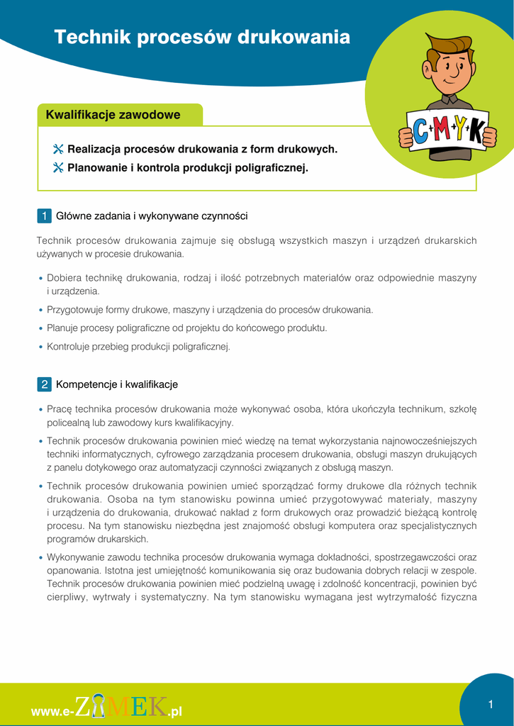 Technik procesów drukowania Kwalifikacje zawodowe Realizacja procesów drukowania z form drukowych. Planowanie i kontrola produkcji poligraficznej. 1 Główne zadania i wykonywane czynności Technik procesów drukowania zajmuje się obsługą wszystkich maszyn i urządzeń drukarskich używanych w procesie drukowania. Dobiera technikę drukowania, rodzaj i ilość potrzebnych materiałów oraz odpowiednie maszyny i urządzenia. Przygotowuje formy drukowe, maszyny i urządzenia do procesów drukowania. Planuje procesy poligraficzne od projektu do końcowego produktu. Kontroluje przebieg produkcji poligraficznej. 2 Kompetencje i kwalifikacje Pracę technika procesów drukowania może wykonywać osoba, która ukończyła technikum, szkołę policealną lub zawodowy kurs kwalifikacyjny. Technik procesów drukowania powinien mieć wiedzę na temat wykorzystania najnowocześniejszych techniki informatycznych, cyfrowego zarządzania procesem drukowania, obsługi maszyn drukujących z panelu dotykowego oraz automatyzacji czynności związanych z obsługą maszyn. Technik procesów drukowania powinien umieć sporządzać formy drukowe dla różnych technik drukowania. Osoba na tym stanowisku powinna umieć przygotowywać materiały, maszyny i urządzenia do drukowania, drukować nakład z form drukowych oraz prowadzić bieżącą kontrolę procesu. Na tym stanowisku niezbędna jest znajomość obsługi komputera oraz specjalistycznych programów drukarskich. Wykonywanie zawodu technika procesów drukowania wymaga dokładności, spostrzegawczości oraz opanowania. Istotna jest umiejętność komunikowania się oraz budowania dobrych relacji w zespole. Technik procesów drukowania powinien mieć podzielną uwagę i zdolność koncentracji, powinien być cierpliwy, wytrwały i systematyczny. Na tym stanowisku wymagana jest wytrzymałość fizyczna 1 i zręczność oraz dobra sprawność ruchowa, a także wrażliwość estetyczna. Technik procesów drukowania powinien umieć pracować pod presją czasu oraz mieć zdolność szybkiego analizowania sytuacji i podejmowania decyzji. Przeciwskazaniami zdrowotnymi do wykonywania pracy w zawodzie technika procesów drukowania są: wady wzroku nieskorygowane szkłami optycznymi, brak widzenia obuocznego, zaburzenia widzenia barw, zaburzenia adaptacji wzroku do ciemności, a także choroby układu oddechowego, nerwowego, alergie i choroby skóry, zaburzenia równowagi, w tym zawroty głowy, omdlenia. 3 Środowisko i charakter pracy Technik procesów drukowania może pracować w drukarniach i zakładach poligraficznych, w firmach rzemieślniczych, w zakładach prowadzących usługi poligraficzne, jako przedstawiciel handlowy firm poligraficznych. Praca w tym zawodzie ma charakter zespołowy. Osoba na tym stanowisku pracuje zazwyczaj 7 godzin dziennie w systemie zmianowym, często w dni ustawowo wolne. Praca wymaga wymuszonej pozycji ciała (siedzącej lub stojącej), jest wykonywana w pomieszczeniach zamkniętych pełnych urządzeń i maszyn drukarskich i poligraficznych. Towarzyszy jej występowanie dużego hałasu, a także pyłu z papieru i drukarek. 2