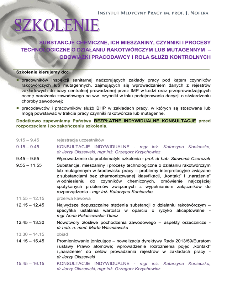 SUBSTANCJE CHEMICZNE, ICH MIESZANINY, CZYNNIKI I PROCESY TECHNOLOGICZNE O DZIAŁANIU RAKOTWÓRCZYM LUB MUTAGENNYM – OBOWIĄZKI PRACODAWCY I ROLA SŁUŻB KONTROLNYCH Szkolenie kierujemy do: pracowników inspekcji sanitarnej nadzorujących zakłady pracy pod kątem czynników rakotwórczych lub mutagennych, zajmujących się wprowadzaniem danych z rejestrów zakładowych do bazy centralnej prowadzonej przez IMP w Łodzi oraz przeprowadzających ocenę narażenia zawodowego na ww. czynniki w toku podejmowania decyzji o stwierdzeniu choroby zawodowej; pracodawców i pracowników służb BHP w zakładach pracy, w których są stosowane lub mogą powstawać w trakcie pracy czynniki rakotwórcze lub mutagenne. Dodatkowo zapewniamy Państwu BEZPŁATNE INDYWIDUALNE KONSULTACJE przed rozpoczęciem i po zakończeniu szkolenia. 9.15 – 9.45 rejestracja uczestników 9.15 – 9.45 KONSULTACJE INDYWIDUALNE - mgr inż. Katarzyna Konieczko, dr Jerzy Olszewski, mgr inż. Grzegorz Krzychowicz 9.45 – 9.55 Wprowadzenie do problematyki szkolenia - prof. dr hab. Sławomir Czerczak 9.55 – 11.55 Substancje, mieszaniny i procesy technologiczne o działaniu rakotwórczym lub mutagennym w środowisku pracy – problemy interpretacyjne związane z substancjami bez zharmonizowanej klasyfikacji, „kontakt” i „narażenie” w odniesieniu do czynników chemicznych, omówienie najczęściej spotykanych problemów związanych z wypełnianiem załączników do rozporządzenia - mgr inż. Katarzyna Konieczko 11.55 – 12.15 przerwa kawowa 12.15 – 12.45 Najwyższe dopuszczalne stężenia substancji o działaniu rakotwórczym – specyfika ustalania wartości w oparciu o ryzyko akceptowalne mgr Anna Pałaszewska-Tkacz 12.45 – 13.30 Nowotwory złośliwe pochodzenia zawodowego – aspekty orzecznicze dr hab. n. med. Marta Wiszniewska 13.30 – 14.15 obiad 14.15 – 15.45 Promieniowanie jonizujące – nowelizacja dyrektywy Rady 2013/59/Euratom i ustawy Prawo atomowe; wprowadzenie rozróżnienia pojęć „kontakt” i „narażenie” do celów prowadzenia rejestrów w zakładach pracy dr Jerzy Olszewski 15.45 – 16.15 KONSULTACJE INDYWIDUALNE - mgr inż. Katarzyna Konieczko, dr Jerzy Olszewski, mgr inż. Grzegorz Krzychowicz Ze względu na ograniczoną ilość miejsc o uczestnictwie Państwa w szkoleniu będzie decydowała kolejność zgłoszeń. Proponujemy następujące terminy szkoleń: 5 kwietnia 2016 r. 15 listopada 2016 r. Na zgłoszenia oczekujemy w terminie 30 dni przed rozpoczęciem poszczególnych szkoleń. Zajęcia odbędą się w: Instytucie Medycyny Pracy w Łodzi, ul. Św. Teresy od Dzieciątka Jezus 8 w godz. 9:45 – 15:45 konsultacje indywidualne w godz. 9:15 – 9:45 oraz 15:45 – 16:15 Uczestnicy otrzymają świadectwa potwierdzające udział w szkoleniu. Zgłoszenia prosimy przesyłać na adres sekretariatu szkolenia: Instytut Medycyny Pracy Zakład Bezpieczeństwa Chemicznego 91-348 Łódź, ul. Św. Teresy od Dzieciątka Jezus 8 Tel./Fax: 42 63 14 702 e-mail: [email protected] Koszt uczestnictwa wynosi 700 zł i obejmuje: materiały szkoleniowe, obiad, kawę, herbatę w przerwach Wpłat należy dokonywać w terminie 7 dni przed rozpoczęciem zajęć na konto: Instytut Medycyny Pracy w Łodzi NIP: 724 000 31 25 PEKAO S.A. II Oddział w Łodzi 46 1240 3028 1111 0000 2822 2723 W tytule przelewu koniecznie prosimy podać: nazwisko uczestnika z dopiskiem CZYNNIKI RAKOTWÓRCZE Ogólne informacje i karta zgłoszenia dostępna pod adresem: http://www.imp.lodz.pl zakładka: Edukacja / Szkolenia i kursy Noclegi - rezerwacji miejsc hotelowych dokonują Państwo we własnym zakresie. Hotel IMP ul. Św. Teresy od Dzieciątka Jezus 8, 91-348 Łódź tel.: 42 63 14 874 Hotel Nobo ul. Liściasta 86 / al. Włókniarzy, 91-357 Łódź tel.: 42 234 14 61; kom.: 604 527 908; fax: 42 234 14 61 http://www.nobohotel.pl/pl/kontakt-pl/ Hotel Borowiecki ul. Kasprzaka 7/9, 91-078 Łódź tel.: 42 288 01 00; fax: 42 288 01 21 http://www.hotelborowiecki.pl/