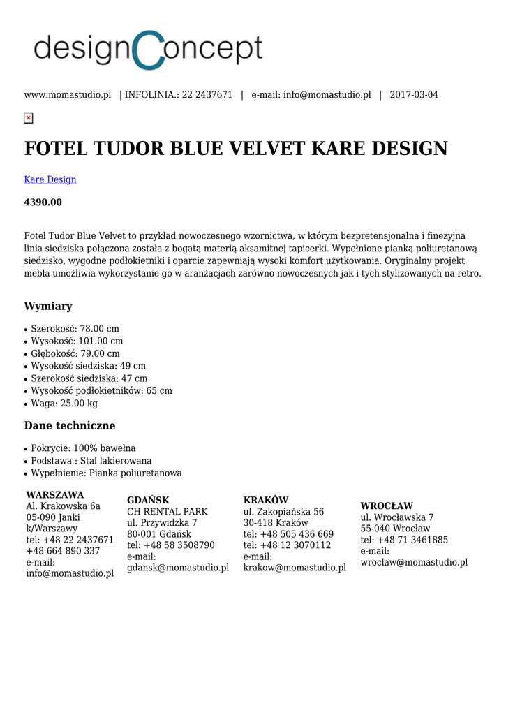 www.momastudio.pl | INFOLINIA.: 22 2437671 | e-mail: [email protected] | 2017-03-04 FOTEL TUDOR BLUE VELVET KARE DESIGN Kare Design 4390.00 Fotel Tudor Blue Velvet to przykład nowoczesnego wzornictwa, w którym bezpretensjonalna i finezyjna linia siedziska połączona została z bogatą materią aksamitnej tapicerki. Wypełnione pianką poliuretanową siedzisko, wygodne podłokietniki i oparcie zapewniają wysoki komfort użytkowania. Oryginalny projekt mebla umożliwia wykorzystanie go w aranżacjach zarówno nowoczesnych jak i tych stylizowanych na retro. Wymiary ● ● ● ● ● ● ● Szerokość: 78.00 cm Wysokość: 101.00 cm Głębokość: 79.00 cm Wysokość siedziska: 49 cm Szerokość siedziska: 47 cm Wysokość podłokietników: 65 cm Waga: 25.00 kg Dane techniczne ● ● ● Pokrycie: 100% bawełna Podstawa : Stal lakierowana Wypełnienie: Pianka poliuretanowa WARSZAWA Al. Krakowska 6a 05-090 Janki k/Warszawy tel: +48 22 2437671 +48 664 890 337 e-mail: [email protected] GDAŃSK CH RENTAL PARK ul. Przywidzka 7 80-001 Gdańsk tel: +48 58 3508790 e-mail: [email protected] KRAKÓW ul. Zakopiańska 56 30-418 Kraków tel: +48 505 436 669 tel: +48 12 3070112 e-mail: [email protected] WROCŁAW ul. Wrocławska 7 55-040 Wrocław tel: +48 71 3461885 e-mail: [email protected]