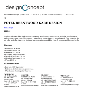 www.momastudio.pl | INFOLINIA.: 22 2437671 | e-mail: [email protected] | 2017-03-04 FOTEL BRENTWOOD KARE DESIGN Kare Design 2220.00 Fotel to piękny przykład funkcjonalnego designu. Komfortowe, tapicerowane siedzisko zostało ujęte w stalową polerowaną ramę. Nowoczesna i lekka forma mebla stanowi o jego elegancji. Fotel sprawdzi się nie tylko w użytku domowym, ale także jako element aranżacji biur i innych pomieszczeń komercyjnych. Wymiary ● ● ● ● ● ● ● Szerokość: 70.00 cm Wysokość: 68.00 cm Głębokość: 87.00 cm Wysokość siedziska: 40 cm Szerokość siedziska: 70 cm Głębokość siedziska: 55 cm Waga: 20.00 kg Dane techniczne ● ● ● Pokrycie: 100 % poliester Podstawa: Stal nierdzewna polerowana Wypełnienie: Pianka poliuretanowa WARSZAWA Al. Krakowska 6a 05-090 Janki k/Warszawy tel: +48 22 2437671 +48 664 890 337 e-mail: [email protected] GDAŃSK CH RENTAL PARK ul. Przywidzka 7 80-001 Gdańsk tel: +48 58 3508790 e-mail: [email protected] KRAKÓW ul. Zakopiańska 56 30-418 Kraków tel: +48 505 436 669 tel: +48 12 3070112 e-mail: [email protected] WROCŁAW ul. Wrocławska 7 55-040 Wrocław tel: +48 71 3461885 e-mail: [email protected]