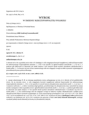Sygnatura akt II K 1709/11 Ds. 1357/11 Prok. Rej. w O. WYROK W IMIENIU RZECZYPOSPOLITEJ POLSKIEJ Dnia 23 lutego 2012 r. Sąd Rejonowy w Oleśnicy II Wydział Karny w składzie: Przewodniczący:SSR Andrzej Lewandowski Protokolant:Anna Niełacna Przy udziale Prokuratora: Bartosza Kupniewskiego po rozpoznaniu w dniach 2 lutego 2012 r. oraz 23 lutego 2012 r. w O. na rozprawie sprawy T. Z. syna B. i K. z domu N. urodzonego (...) w (...) oskarżonego o to, że w okresie od 11 do 15 grudnia 2010 roku w D. działając w celu osiągnięcia korzyści majątkowej, usiłował doprowadzić do niekorzystnego rozporządzenia mieniem (...) SA w ten sposób, że zgłosił kradzież samochodu (...) nr rej. (...) podczas gdy faktycznie to zdarzenie nie miało miejsca i tym samych chciał uzyskać nienależne odszkodowanie z tytułu polisy (...) w kwocie 125 000 zł lecz zamierzonego celu nie osiągnął z uwagi na efekt czynności wyjaśniających prowadzonych przez pokrzywdzonego, tj. o czyn z art. 13 § 1 k.k. w zw. z art. 286 § 1 k.k. ****************** I. uznaje oskarżonego T. Z. za winnego popełnienia czynu, polegającego na tym, że w okresie od 26 października 2010r. do 25 stycznia 2011r. w celu osiągnięcia korzyści majątkowej usiłował doprowadzić do niekorzystnego rozporządzenia mieniem (...) S.A. w ten sposób, że zawarł umowę ubezpieczenia samochodu marki (...) o nr rej. (...) i numerze nadwozia (...), który wcześniej uległ spaleniu, przedstawiając do ubezpieczenia inny samochód tej samej marki a następnie w dniu 15 grudnia 2010r. zgłosił kradzież samochodu marki (...) o nr rej. (...), podczas gdy faktycznie to zdarzenie nie miało miejsca i w ten sposób chciał uzyskać nienależne odszkodowanie w wysokości 125 000 zł z tytułu polisy (...), lecz zamierzonego celu nie osiągnął z uwagi na odmowę wypłaty odszkodowania i podjęte przez ubezpieczyciela dalsze czynności wyjaśniające, tj. czynu stanowiącego przestępstwo z art. 13 § 1 k.k. w zw. z art. 286 § 1 k.k. i za to na podstawie art. 14 § 1 k.k. w zw. z art. 286 § 1 k.k. wymierza mu karę 1 (jednego) roku pozbawienia wolności a na podstawie art. 33 § 2 k.k. wymierza mu grzywnę w ilości 100 (stu) stawek dziennych, ustalając wysokość jednej stawki dziennej na kwotę 20 (dwudziestu) złotych; II. na podstawie art. 69 § 1 i 2 k.k. oraz art. 70 § 1 pkt 1 k.k. wykonanie wymierzonej oskarżonemu kary pozbawienia wolności warunkowo zawiesza na okres próby wynoszący 3 (trzy) lata; III. na podstawie art. 230 § 2 k.p.k. zwraca pokrzywdzonemu (...) S.A. Oddział (...) dowód rzeczowy w postaci akt szkodowych o nr PL (...); IV. na podstawie art. 627 k.p.k. zasądza od oskarżonego na rzecz Skarbu Państwa koszty sądowe w kwocie 470 (czterysta siedemdziesiąt) złotych, w tym wymierza mu opłatę w wysokości 380 (trzystu osiemdziesięciu) złotych. UZASADNIENIE Oskarżony T. Z. prowadził działalność gospodarczą w postaci usług transportowych pod nazwą T.. W ramach tej działalności użytkował samochód ciężarowy marki (...) o numerze rejestracyjnym (...) i numerze nadwozia (...). Samochód był sprowadzony jako używany z Belgii w listopadzie 2007r. Cena w wysokości 207 400 zł zapłacona została za ten pojazd poprzez kredyt udzielony oskarżonemu przez (...) Oddział w S.. Na pojeździe ustanowiono zastaw rejestrowy na rzecz (...) S.A. Samochód przez cały okres użytkowania przez oskarżonego był ubezpieczony w (...) S.A. W okresie od 2 listopada 2009r. do 1 listopada 2010r. objęty był ubezpieczeniem od następstw nieszczęśliwych wypadków na podstawie polisy AC serii (...). (dowód: częściowo wyjaśnienia oskarżonego – k. 96-97, faktura VAT nr (...)r. w aktach szkodowych (...), kopia dowodu rejestracyjnego w aktach szkodowych (...), druk zgłoszenia szkody – k. 18-19) W dniu 10 czerwca 2010r. w B. z nieznanych przyczyn uległa spaleniu kabina samochodu marki (...) o nr rej. (...). O zdarzeniu był poinformowany Komisariat Policji w D.. Oskarżony skontaktował się telefonicznie z R. D., który wcześniej kilka razy naprawiał siłownik hydrauliczny w tym samochodzie i poprosił go o pomoc w holowaniu spalonego samochodu. R. D. skontaktował się z firmą, która zajmowała się holowaniem pojazdów ciężarowych i spalony pojazd został przywieziony na plac przy warsztacie R. D., który też zapłacił za holowanie. Oprócz kosztów holowanie oskarżony zalegał mu jeszcze z zapłatą za wcześniejsze naprawy około 8 tys. zł. (dowód: zeznania świadka R. D. – k. 104, druk zgłoszenia szkody – k. 18-19 ) Szkoda pożarowa została zgłoszona do ubezpieczyciela (...) S.A. W dniu 21 czerwca 2010r. dokonano oględzin pojazdu i tego samego dnia w (...) Centrum (...) we W. przy ul. (...) sporządzono kalkulację naprawy pojazdu. Przebieg samochodu w dniu zgłoszenia szkody wynosił 590 000 km. Zgodnie z kalkulacją koszty naprawy samochodu po spaleniu wyniosły 214 183,58 zł i w związku z tym pismem z dnia 26 czerwca 2010r. ubezpieczyciel (...) S.A poinformował oskarżonego, że przywrócenie pojazdu do stanu sprzed wypadku jest ekonomicznie nieuzasadnione. Z tych też powodów rozmiar szkody ustalono na podstawie różnicy pomiędzy wartością samochodu sprzed zdarzenia i po zdarzeniu. Kwota tak ustalonego odszkodowania wyniosła 92 200 zł i została w całości wypłacona kredytodawcy - (...) S.A. (dowód: druk zgłoszenia szkody – k. 18-19, kalkulacja naprawy – k. 20-27, pismo (...) S.A. z dnia 26 czerwca 2010r. – k. 28, częściowo wyjaśnienia oskarżonego – k. 97, akta szkodowe (...)) W dniu 26 października 2010r. za pośrednictwem brokera ubezpieczeniowego z K. B. L. oskarżony wystąpił z wnioskiem o wznowienie ubezpieczenia samochodu marki (...) o nr rej. (...). We wniosku o wznowienie ubezpieczenia wskazano przebieg pojazdu 670 000 km. Jednocześnie broker przyjmujący wniosek dokonał oględzin innego pojazdu marki (...) z zawieszonymi tablicami rej