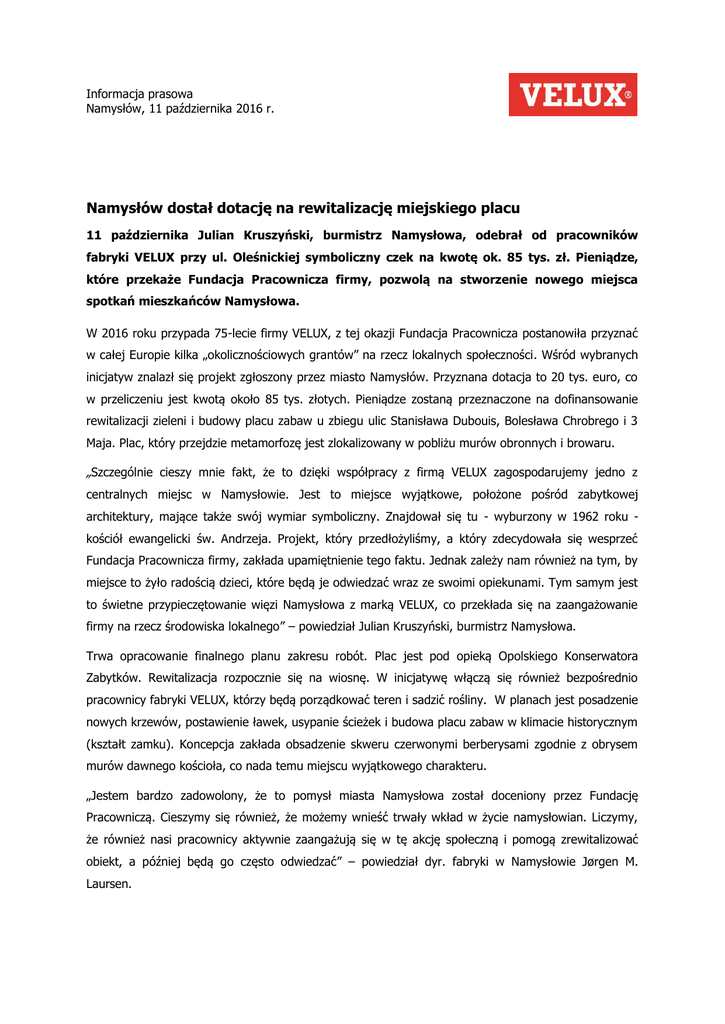 Informacja prasowa Namysłów, 11 października 2016 r. Namysłów dostał dotację na rewitalizację miejskiego placu 11 października Julian Kruszyński, burmistrz Namysłowa, odebrał od pracowników fabryki VELUX przy ul. Oleśnickiej symboliczny czek na kwotę ok. 85 tys. zł. Pieniądze, które przekaże Fundacja Pracownicza firmy, pozwolą na stworzenie nowego miejsca spotkań mieszkańców Namysłowa. W 2016 roku przypada 75-lecie firmy VELUX, z tej okazji Fundacja Pracownicza postanowiła przyznać w całej Europie kilka „okolicznościowych grantów” na rzecz lokalnych społeczności. Wśród wybranych inicjatyw znalazł się projekt zgłoszony przez miasto Namysłów. Przyznana dotacja to 20 tys. euro, co w przeliczeniu jest kwotą około 85 tys. złotych. Pieniądze zostaną przeznaczone na dofinansowanie rewitalizacji zieleni i budowy placu zabaw u zbiegu ulic Stanisława Dubouis, Bolesława Chrobrego i 3 Maja. Plac, który przejdzie metamorfozę jest zlokalizowany w pobliżu murów obronnych i browaru. „Szczególnie cieszy mnie fakt, że to dzięki współpracy z firmą VELUX zagospodarujemy jedno z centralnych miejsc w Namysłowie. Jest to miejsce wyjątkowe, położone pośród zabytkowej architektury, mające także swój wymiar symboliczny. Znajdował się tu - wyburzony w 1962 roku kościół ewangelicki św. Andrzeja. Projekt, który przedłożyliśmy, a który zdecydowała się wesprzeć Fundacja Pracownicza firmy, zakłada upamiętnienie tego faktu. Jednak zależy nam również na tym, by miejsce to żyło radością dzieci, które będą je odwiedzać wraz ze swoimi opiekunami. Tym samym jest to świetne przypieczętowanie więzi Namysłowa z marką VELUX, co przekłada się na zaangażowanie firmy na rzecz środowiska lokalnego” – powiedział Julian Kruszyński, burmistrz Namysłowa. Trwa opracowanie finalnego planu zakresu robót. Plac jest pod opieką Opolskiego Konserwatora Zabytków. Rewitalizacja rozpocznie się na wiosnę. W inicjatywę włączą się również bezpośrednio pracownicy fabryki VELUX, którzy będą porządkować teren i sadzić rośliny. W planach jest posadzenie nowych krzewów, postawienie ławek, usypanie ścieżek i budowa placu zabaw w klimacie historycznym (kształt zamku). Koncepcja zakłada obsadzenie skweru czerwonymi berberysami zgodnie z obrysem murów dawnego kościoła, co nada temu miejscu wyjątkowego charakteru. „Jestem bardzo zadowolony, że to pomysł miasta Namysłowa został doceniony przez Fundację Pracowniczą. Cieszymy się również, że możemy wnieść trwały wkład w życie namysłowian. Liczymy, że również nasi pracownicy aktywnie zaangażują się w tę akcję społeczną i pomogą zrewitalizować obiekt, a później będą go często odwiedzać” – powiedział dyr. fabryki w Namysłowie Jørgen M. Laursen. Firmę VELUX tworzy zespół ludzi, którzy mają bezpośredni wpływ na jej rozwój. Wiemy, że każdy pracownik jest wyjątkowy i zasługuje na szczególne traktowanie. Właśnie dlatego w 1991 roku powstała Fundacja Pracownicza, której celem jest świadczenie pomocy finansowej na rzecz członków naszego zespołu. Pomagamy pracownikom, którzy znaleźli się w trudnej sytuacji (np. ciężka choroba, rehabilitacja, trudności z pokryciem kosztów wykształcenia dzieci itp.). Co ważne, o wsparcie może ubiegać się również najbliższa rodzina naszych pracowników. Fundacja pracownicza regularnie wspiera również najbliższe środowisko naszych pracowników: szkoły, przedszkola, szpitale i inne organizacje, z których korzystają nasi pracownicy i ich rodziny. Ostatnio wsparcie otrzymały również Straż Pożarna, Przedszkole nr 1, 4 i 5, Szkoła Specjalna, Dom Dziecka, Szkoła Podstawowa nr 4, Środowiskowy Hufiec Pracy. Fabryka okien i kołnierzy aluminiowych w Namysłowie powstała w 2003 roku, obecnie zatrudnia ponad 800 osób, a jej powierzchnia – blisko 70 tysięcy metrów kwadratowych zajmuje obszar kilkunastu boisk piłkarskich. Zakład w Namysłowie jest cenionym miejscem pracy, otrzymała I miejsce w konkursie „Organizator Pracy Bezpiecznej od Państwowej Inspekcji Pracy w Opolu. Fabryka otrzymała także tytuł „wiodącego przedsiębiorstwa we wdrażaniu procesów ciągłego doskonalenia” podczas Międzynarodowego Kongresu Gemba Kaizen. W Namysłowie znajduje się również centrum dystrybucji Grupy VELUX na rynek polski i europejski. *** Pytania dziennikarzy: Agnieszka Kamińska PR Manager, VELUX Polska tel.: (+48) 502 410 414, (22) 33 77 053 e-mail: agnieszka.kamiń[email protected] Ewa Łukawska PR Manager, Komuniado PR Tel.: (+48) 507 091 294, (22) 64 91 953 e-mail: [email protected] Informacje o Grupie VELUX Od 75 lat Grupa VELUX dzięki swoim produktom poprawia warunki życia ludzi w budynkach, umożliwiając lepszy dostęp do światła dziennego i świeżego powietrza. Oferta VELUX obejmuje szeroki asortyment okien do poddaszy oraz system doświetleń modułowych, jak również różnego rodzaju rolety wewnętrzne i zewnętrzne, żaluzje, zestawy izolacyjne oraz do zdalnego sterowania. Produkty te pomagają stworzyć zdrowy klimat wewnętrzny, idealny do pracy, nauki, zabawy i odpoczynku. Grupa VELUX działa globalnie – posiada przedstawicielstwa handlowe w ponad 40 państwach, zatrudnia około 9500 pracowników. Grupa VELUX należy do VKR Holding A/S, którego większościowym udziałowcem są Fundacje VELUX oraz rodzina założyciela. Więcej informacji na stronie www.velux.com. Informacja o Grupie VELUX i spółkach siostrzanych w Polsce Grupa VELUX i spółki siostrzane w Polsce, należące do duńskiego holdingu VKR, są największym producentem i eksporterem okien dachowych w Polsce, a ich poziom obrotów wynosi ponad 1,5 mld zł. Zatrudniają w sumie ponad 3500 osób, w tym większość w czterech zakładach zlokalizowanych w Gnieźnie (dwie fabryki), Namysłowie i Wędkowach koło Tczewa. Firma cały czas się rozwija i inwestuje w nowe technologi