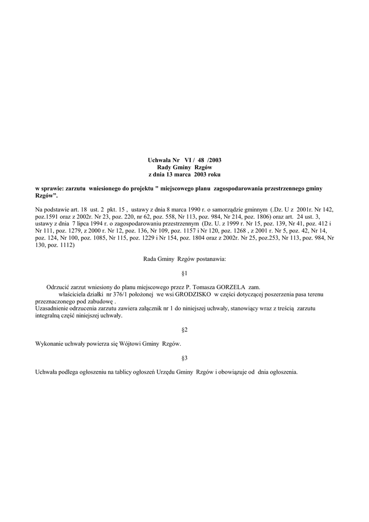 Uchwała Nr VI / 48 /2003 Rady Gminy Rzgów z dnia 13 marca 2003 roku w sprawie: zarzutu wniesionego do projektu " miejscowego planu zagospodarowania przestrzennego gminy Rzgów”. Na podstawie art. 18 ust. 2 pkt. 15 , ustawy z dnia 8 marca 1990 r. o samorządzie gminnym (.Dz. U z 2001r. Nr 142, poz.1591 oraz z 2002r. Nr 23, poz. 220, nr 62, poz. 558, Nr 113, poz. 984, Nr 214, poz. 1806) oraz art. 24 ust. 3, ustawy z dnia 7 lipca 1994 r. o zagospodarowaniu przestrzennym (Dz. U. z 1999 r. Nr 15, poz. 139, Nr 41, poz. 412 i Nr 111, poz. 1279, z 2000 r. Nr 12, poz. 136, Nr 109, poz. 1157 i Nr 120, poz. 1268 , z 2001 r. Nr 5, poz. 42, Nr 14, poz. 124, Nr 100, poz. 1085, Nr 115, poz. 1229 i Nr 154, poz. 1804 oraz z 2002r. Nr 25, poz.253, Nr 113, poz. 984, Nr 130, poz. 1112) Rada Gminy Rzgów postanawia: §1 Odrzucić zarzut wniesiony do planu miejscowego przez P. Tomasza GORZELA zam. 93-329 Łódź, ul. Ogniskowa 13 m 21 właściciela działki nr 376/1 położonej we wsi GRODZISKO w części dotyczącej poszerzenia pasa terenu przeznaczonego pod zabudowę . Uzasadnienie odrzucenia zarzutu zawiera załącznik nr 1 do niniejszej uchwały, stanowiący wraz z treścią zarzutu integralną część niniejszej uchwały. §2 Wykonanie uchwały powierza się Wójtowi Gminy Rzgów. §3 Uchwała podlega ogłoszeniu na tablicy ogłoszeń Urzędu Gminy Rzgów i obowiązuje od dnia ogłoszenia. Załącznik nr 1 UZASADNIENIE do uchwały Rady Gminy Rzgów nr VI / 48 /2003 z dnia 13 marca 2003r. w sprawie rozpatrzenia zarzutu wniesionego do projektu " miejscowego planu zagospodarowania przestrzennego gminy Rzgów" W dniach 23.12.2002 r. - 23.01.2003r. w siedzibie Urzędu Gminy w Rzgowie został wyłożony do publicznego wglądu projekt planu " miejscowego planu zagospodarowania przestrzennego gminy Rzgów". Do dnia 06.02.2003 r. Wójt Gminy przyjmował protesty i zarzuty do projektu planu. W dniu 29.01.2003 r. wpłynął zarzut, złożony przez: P. Tomasza GORZELA zam. 93-329 Łódź, ul. Ogniskowa 13 m 21 dotyczący poszerzenia pasa terenu przeznaczonego pod zabudowę. Gmina z mocy art. 4 ust. 1 ustawy z dnia 7 lipca 1994 r. o zagospodarowaniu przestrzennym (tekst jednolity Dz. U. nr 15 z dnia 25 lutego 1999r. poz. 139 z późniejszymi zmianami) dysponuje władztwem planistycznym, w ramach którego może decydować o przeznaczeniu i zasadach zagospodarowania terenu. Stosownie bowiem do art. 18 ust. 1 cyt. Ustawy o zagospodarowaniu przestrzennym organem właściwym do sporządzania miejscowego planu zagospodarowania przestrzennego jest Wójt Gminy. Wójt Gminy w wyniku rozpatrzenia zarzutu uznał co następuje: – Planowany pas pod zabudowę zagrodową i jednorodzinną ma szerokość taką jak w obowiązującym w chwili obecnej miejscowym planie zagospodarowania przestrzennego gminy Rzgów zatwierdzonym uchwałą Rady Gminy Rzgów nr 110/94 z dnia 25 maja 1994 roku (opublikowany w Dzienniku Urzędowym Województwa Łódzkiego Nr 10, poz. 77 z 1994 roku ). – Poszerzenie tego pasa jest niemożliwe z uwagi na ochronę zespołu przyrodniczo-krajobrazowego doliny rzeki Ner, w której leży przedmiotowa działka. Teren zachowuje przeznaczenie dotychczasowe. Przytoczone wyżej przesłanki faktyczne i prawne spowodowały, że Wójt Gminy zdecydował o odrzuceniu zarzutu złożonego do projektu " miejscowego planu zagospodarowania przestrzennego gminy Rzgów”. Rada Gminy Rzgów podzieliła stanowisko Wójta i postanowiła jak w treści uchwały. Wnosząca zarzut może zaskarżyć uchwałę Rady Gminy o odrzuceniu zarzutu bezpośrednio do Naczelnego Sądu Administracyjnego w Warszawie - Ośrodek Zamiejscowy w Łodzi, Łódź, ul. Piotrkowska 135 - w terminie 30 dni od dnia jej doręczenia.