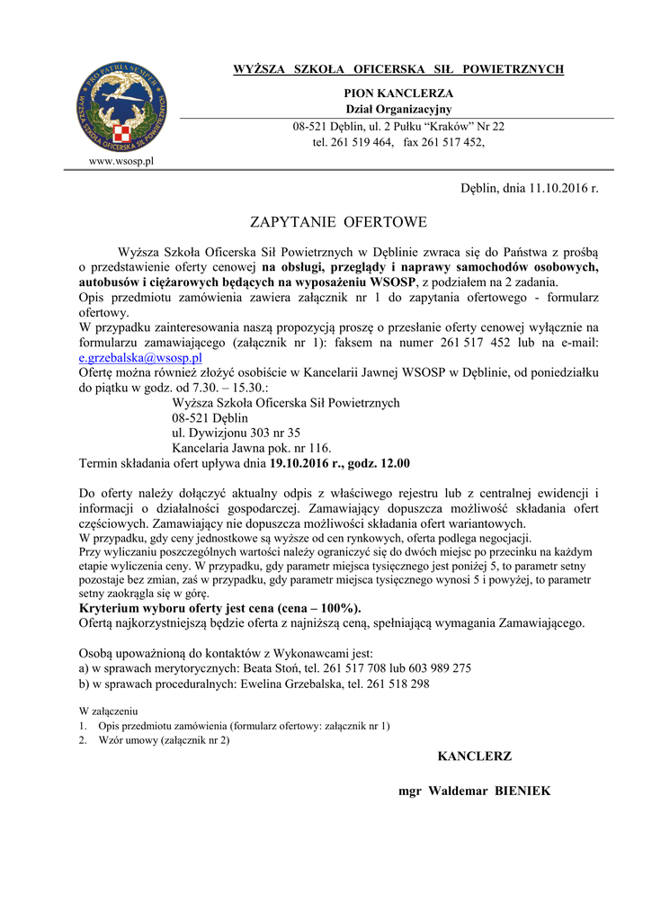WYŻSZA SZKOŁA OFICERSKA SIŁ POWIETRZNYCH PION KANCLERZA Dział Organizacyjny 08-521 Dęblin, ul. 2 Pułku “Kraków” Nr 22 tel. 261 519 464, fax 261 517 452, www.wsosp.pl Dęblin, dnia 11.10.2016 r. ZAPYTANIE OFERTOWE Wyższa Szkoła Oficerska Sił Powietrznych w Dęblinie zwraca się do Państwa z prośbą o przedstawienie oferty cenowej na obsługi, przeglądy i naprawy samochodów osobowych, autobusów i ciężarowych będących na wyposażeniu WSOSP, z podziałem na 2 zadania. Opis przedmiotu zamówienia zawiera załącznik nr 1 do zapytania ofertowego - formularz ofertowy. W przypadku zainteresowania naszą propozycją proszę o przesłanie oferty cenowej wyłącznie na formularzu zamawiającego (załącznik nr 1): faksem na numer 261 517 452 lub na e-mail: [email protected] Ofertę można również złożyć osobiście w Kancelarii Jawnej WSOSP w Dęblinie, od poniedziałku do piątku w godz. od 7.30. – 15.30.: Wyższa Szkoła Oficerska Sił Powietrznych 08-521 Dęblin ul. Dywizjonu 303 nr 35 Kancelaria Jawna pok. nr 116. Termin składania ofert upływa dnia 19.10.2016 r., godz. 12.00 Do oferty należy dołączyć aktualny odpis z właściwego rejestru lub z centralnej ewidencji i informacji o działalności gospodarczej. Zamawiający dopuszcza możliwość składania ofert częściowych. Zamawiający nie dopuszcza możliwości składania ofert wariantowych. W przypadku, gdy ceny jednostkowe są wyższe od cen rynkowych, oferta podlega negocjacji. Przy wyliczaniu poszczególnych wartości należy ograniczyć się do dwóch miejsc po przecinku na każdym etapie wyliczenia ceny. W przypadku, gdy parametr miejsca tysięcznego jest poniżej 5, to parametr setny pozostaje bez zmian, zaś w przypadku, gdy parametr miejsca tysięcznego wynosi 5 i powyżej, to parametr setny zaokrągla się w górę. Kryterium wyboru oferty jest cena (cena – 100%). Ofertą najkorzystniejszą będzie oferta z najniższą ceną, spełniającą wymagania Zamawiającego. Osobą upoważnioną do kontaktów z Wykonawcami jest: a) w sprawach merytorycznych: Beata Stoń, tel. 261 517 708 lub 603 989 275 b) w sprawach proceduralnych: Ewelina Grzebalska, tel. 261 518 298 W załączeniu 1. Opis przedmiotu zamówienia (formularz ofertowy: załącznik nr 1) 2. Wzór umowy (załącznik nr 2) KANCLERZ mgr Waldemar BIENIEK Załącznik nr 1 FORMULARZ OFERTOWY ZADANIE NR 1 W odpowiedzi na zapytanie składamy ofertę. Szczegółowy opis przedmiotu zamówienia Obsługi, przeglądy i naprawy samochodów osobowych w 2017 r. Do przeglądów, obsług i napraw podlegają: (przebieg pojazdów na dzień 31.08.2016) 1. 2. 3. 4. 5. 6. 7. 8. 9. Skoda Superb, nr rej. UA 01721, rok. prod. 2009, przebieg 211831 km, Ford Transit, nr rej. UD 00087, rok. prod. 2001, przebieg 364517 km, Daewoo Lublin, nr rej. UWZ 9209, rok. prod. 1999, przebieg 176404 km, Honker ZWD – 3 nr rej. UA 04293, rok. prod. 2009, przebieg 69004 km, Honker 2000, nr rej. UA 00105 rok. prod. 2000, przebieg 53 177 km, Honker 2000, nr rej. UA 02085 rok. prod. 2004, przebieg 7789 km, Nissan Pathfinder, nr rej. LRY 50PT, rok prod. 2009, przebieg 205500 km, Opel INSIGNIA nr rej. UA 02614 , rok prod. 2012, przebieg 117580 km Jelcz CD-7,5 B nr. rej. UB 01295 rok pr.1988 przebieg 8313 km. wymagania techniczne warunki dostawy warunki odbioru termin realizacji zamówienia dodatkowe obowiązki wykonawcy w związku z realizacją zamówienia płatność gwarancja zgodnie z danymi producenta części Usługa wykonywana w warsztacie Po wcześniejszych oględzinach i zaakceptowaniu usługi 01.01.2017 – 31.12.2017 Z możliwością aneksowania umowy w związku ze zmianą pojazdów Własne części gwarancja na części, zabezpieczenie lawety do transportu zepsutego pojazdu Przelew w ciągu 21 dni od daty dostarczenia faktury Na wymienione części gwarancja Zakład ma być zlokalizowany w odległości nie większej niż 50 km od siedziby Zamawiającego. Ceny części zamiennych i materiałów eksploatacyjnych po cenach rynkowych. CENY ROBOCZOGODZIN I BADAŃ DIAGNOSTYCZNYCH 1. Cena roboczogodziny brutto: 1. Mechanik- …………..…… zł; 2. Elektryk-……….……… zł; 3. Blacharz/lakiernik- ………….…… zł; 2. Cena jednego badania diagnostycznego przegląd samochodu brutto: Pojazdy osobowe ……………..……zł; Opłata ewidencyjna CEPIK- …………. zł; Zabezpieczenie lawety do transportu pojazdów w razie zepsucia i niemożliwości dojazdu pojazdu do miejsca naprawy pojazdów. Laweta km. ……………………….. zł. Wykonawca: ............................................................................................................................... Siedziba/adres:............................................................................................................................ ..................................................................................................................................................... Nr telefonu:...................................................... Nr faksu: ….................................................. e-mail: …………………………………………………………………………………………. Nr NIP: ........................................................ Nr REGON: ................................................... Nr KRS …………………………………… ……………………………….…… Miejscowość, data ..……………………………………………….. Pieczęć i podpis przedstawiciela(li) Wykonawcy Załącznik nr 1 FORMULARZ OFERTOWY ZADANIE NR 2 W odpowiedzi na zapytanie składamy ofertę. Szczegółowy opis przedmiotu zamówienia Do przeglądów, obsług i napraw podlegają: 1) 2) 3) 4) 5) Star 944, nr rej. UE 01422, rok. prod. 2004, przebieg Star Thema, nr rej. UD 00125, rok prod. 2002, przebieg Samochód ciężarowy DAF, rok pr.2013, przebieg Cysterna DAV nr. rej. LRY 2F61 rok pr. 2013 przebieg Scania nr rej. UD 01661 
