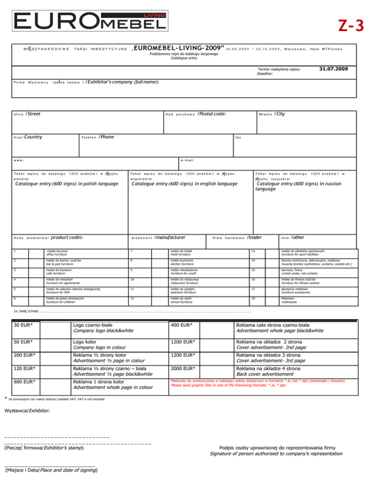 Z-3 MIĘ D Z Y N A R O D O W E TA R G I IN W E S T Y C Y J N E „EUROMEBEL- LIVING-2009” 30.0 9.2 0 0 9 – 02. 1 0 . 2 0 0 9 , W a r s z a w a , Hal a M T P o l s k a Podstawowy wpis do katalogu targowego Catalogue entry Termin nadsyłania wpisu: Deadline: 31.07.2009 Fir m a W y s t a w c y (peł na na z w a ) / Exhibitor’s company (full name): Uli c a /Street K o d po c z t o w y /Postal code: Kr aj/ Country Tel e f o n /Phone Mi a s t o /City fax www. e-m ai l Te k s t w pi s u do kat al o g u (600 zn a k ó w) w ję zy k u pol s k i m Catalogue entry (600 signs) in polish language Te k s t w pi s u do kat al o g u (600 zn a k ó w) w ję zy k u an g i e l s k i m Catalogue entry (600 signs) in english language K o d y pr o d u k t ó w/ product codes : pr o d u c e n t /manufacturer Te k s t w pi s u do kat al o g u (600 zn a k ó w) w ję zy k u ros yj s k i m Catalogue entry (600 signs) in russian language fir m a ha n d l o w a /trader inn e /other 1 meble biurowe office furniture 7 meble do hoteli hotel furniture 13 meble do obiektów sportowych furniture for sport facilities 2 meble do barów i pub’ów bar & pub furniture 8 meble kuchenne kitchen furniture 14 tkaniny techniczne, dekoracyjne, meblowe housing textiles (upholstery, curtains, carpets etc.) 3 meble do kawiarni cafe furniture 9 meble młodzieżowe furniture for youth 15 karnisze, firany curtain poles, net curtains 4 meble do mieszkań furniture for apartments 10 meble do restauracji restaurant furniture 16 meble do fitness club’ów furniture for fitness centres 5 meble do salonów odnowy biologicznej furniture for SPA 11 meble do sypialni bedroom furniture 17 akcesoria meblowe furniture accessories 6 meble do pokoi dziecięcych furniture for children 12 meble do szkół school furniture 18 Materace mattresses 19. INNE/ OTHER …………………………………………………………………………………………………………………………………………………………………………………………………………………………. * 30 EUR* Logo czarno-białe Company logo black&white 400 EUR* Reklama cała strona czarno-biała Advertisement whole page black&white 50 EUR* Logo kolor Company logo in colour 1200 EUR* Reklama na okładce 2 strona Cover advertisement- 2nd page 200 EUR* Reklama ½ strony kolor Advertisement ½ page in colour 1200 EUR* Reklama na okładce 3 strona Cover advertisement- 3rd page 120 EUR* Reklama ½ strony czarno – biała Advertisement ½ page black&white 2000 EUR* Reklama na okładce 4 strona Back cover advertisement 600 EUR* Reklama 1 strona kolor Advertisement whole page in colour Materiały do umieszczenia w katalogu należy dostarczyć w formacie *.ai, lub *.eps (zamknięte i otwarte) Please send graphic files in one of the folowwing formats: *.ai, *.eps do powyższych cen należy doliczyć podatek VAT/ VAT is not included Wystawca/Exhibitor: __ _ _ _ _ _ _ _ _ _ _ _ _ _ _ _ _ _ _ _ _ _ _ _ _ _ _ _ _ _ __ _ _ _ _ _ _ _ _ _ _ _ _ _ _ _ _ _ _ _ _ _ _ _ _ _ _ _ _ _ _ _ _ _ _ _ _ _ _ _ _ _ (Pieczęć firmowa/Exhibitor’s stamp) _________________________________ (Miejsce i Data/Place and date of signing) Podpis osoby uprawnionej do reprezentowania firmy Signature of person authorised to company’s representation