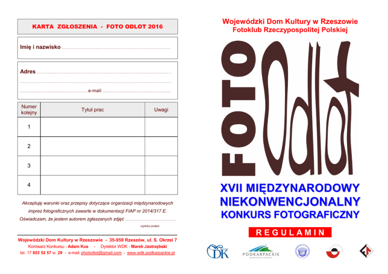 KARTA ZGŁOSZENIA - FOTO ODLOT 2016 Wojewódzki Dom Kultury w Rzeszowie Fotoklub Rzeczypospolitej Polskiej Imię i nazwisko . . . . . . . . . . . . . . . . . . . . . . . . . . . . . . . . . . . . . . . . . . . . . . . . . . . . . . . . . . . . . . . . . . . . . . Adres . . . . . . . . . . . . . . . . . . . . . . . . . . . . . . . . . . . . . . . . . . . . . . . . . . . . . . . . . . . . . . . . . . . . . . . . . . . . . . . . . . . . . . . .................................................................................................. ............................................ Numer kolejny e-mail: . . . . . . . . . . . . . . . . . . . . . . . . . . . . . . . . . . . . . . . . . . . . Tytuł prac Uwagi 1 2 3 4 XVII MIĘDZYNARODOWY Akceptuję warunki oraz przepisy dotyczące organizacji międzynarodowych imprez fotograficznych zawarte w dokumentacji FIAP nr 2014/317 E. Oświadczam, że jestem autorem zgłaszanych zdjęć ................................. NIEKONWENCJONALNY KONKURS FOTOGRAFICZNY czytelny podpis REGULAMIN Wojewódzki Dom Kultury w Rzeszowie - 35-959 Rzeszów, ul. S. Okrzei 7 Komisarz Konkursu - Adam Kus - Dyrektor WDK - Marek Jastrzębski tel. 17 853 52 57 w. 29 - e-mail: [email protected] - www.wdk.podkarpackie.pl Zapraszamy do udziału w XVII Międzynarodowym Niekonwencjonalnym Konkursie Fotograficznym „Foto Odlot” organizowanym przez WDK w Rzeszowie pod patronatem Międzynarodowej Federacji Sztuki Fotograficznej FIAP - Nr 2016/365, Marszałka Województwa Podkarpackiego oraz Fotoklubu Rzeczypospolitej Polskiej - Nr 147/2016 TEMAT „Odlot” - to funkcjonujące w młodzieżowym slangu określenie stanu polegającego na oderwaniu się od rzeczywistości, ogólnie przyjętych schematów, norm i utartych wzorców. Tematem konkursu jest jego fotograficzna, eksperymentalna i niekonwencjonalna interpretacja. WARUNKI UCZESTNICTWA 1. Konkurs dostępny jest dla wszystkich fotografujących. 2. Każdy autor może zgłosić na konkurs do 4 najbardziej „odlotowych” prac czarno-białych lub barwnych, wykonanych w dowolnej technice. W zgłoszonych pracach mogą znajdować się dwa zestawy (do 4 zdjęć w każdym zestawie) wyraźnie oznaczone, które będą traktowane jako prace pojedyncze. 3. Format zgłaszanych na konkurs prac - od 20x30 cm do 70x100 cm. 4. Uczestnik konkursu organizowanego pod patronatem FIAP wyraża zgodę na możliwość weryfikacji przez FIAP, czy fotografie spełniają przepisy i definicje FIAP, nawet jeżeli autor zdjęć nie jest członkiem tej organizacji. FIAP może użyć wszelkich dostępnych jej środków w celu sprawdzenia fotografii. Każda odmowa współpracy z FIAP lub odmowa przedstawienia oryginalnych fotografii (plików) wykonanych aparatem będzie zauważona przez FIAP. W przypadku sankcji za niezgodność z przepisami, FIAP udostępni nazwisko uczestnika w dowolnej formie przydatnej do informowania o naruszeniu przepisów. W celu ułatwienia ewentualnej weryfikacji zaleca się pozostawienie oryginalnych danych EXIF w przesłanych na konkurs fotografiach. OBOWIĄZKI AUTORÓW 1. Każdą pracę należy czytelnie opisać na odwrocie podając: - imię i nazwisko oraz dokładny adres autora, - tytuł pracy i numer kolejny zdjęć zgłaszanych w zestawach. 2. Do prac powinna być dołączona wypełniona czytelnie karta zgłoszenia wraz z oświadczeniem dotyczącym autorstwa prac. 3. Jeśli to możliwe prosimy również o załączenie wersji cyfrowych zdjęć. 4. Prace należy przesłać w sztywnym opakowaniu na adres: Wojewódzki Dom Kultury, ul. S. Okrzei 7, 35-959 Rzeszów z dopiskiem: „FOTO ODLOT”. NAGRODY Laureaci Konkursu otrzymają medale i wyróżnienia FIAP, medale Fotoklubu RP, nagrody pieniężne, pamiątkowe plakiety, dyplomy oraz nagrody specjalne. PRAWA I OBOWIĄZKI ORGANIZATORÓW 1. Wyboru prac na wystawę pokonkursową oraz podziału nagród dokona Jury powołane przez organizatorów. 2. Organizatorzy zastrzegają sobie prawo do bezpłatnej reprodukcji i publikacji zdjęć w katalogu oraz w środkach masowego przekazu w celu informacji o wystawie pokonkursowej. 3. Organizatorzy mają prawo do wyłączenia spod obrad Jury prac nie spełniających warunków regulaminu. TERMINARZ 1. Nadsyłanie prac - do 22 sierpnia 2016 r. 2. Rozstrzygnięcie konkursu i powiadomienie uczestników o jego wynikach - do 26 września 2016 r. 3. Wernisaż wystawy pokonkursowej oraz rozdanie nagród odbędzie się 15 października 2016 r. w Galerii WDK Rzeszów. Ekspozycja pokonkursowa będzie czynna do 31 października 2016 r. UWAGI 1. Udział w Konkursie jest płatny. Opłata dla uczestników z Polski wynosi 25 zł - (m.in. koszty związane z korespondencją i zwrotem przesyłek). Konto: Wojewódzki Dom Kultury, 35-959 Rzeszów, ul. Okrzei 7 Bank Pekao SA, nr: 63124047511111001054839833 2. Wszystkie nadesłane prace zostaną zwrócone ich autorom najpóźniej do 30 grudnia 2016 r. - przewidujemy dodatkowe ekspozycje wystawy. 3. Każdy uczestnik konkursu otrzyma pamiątkowy katalog. 4. Organizatorzy nie biorą odpowiedzialności za ewentualne uszkodzenia prac w transporcie pocztowym. 5. Interpretację tematu pozostawiamy pomysłowości autorów. 6. Nadesłanie prac jest równoznaczne z akceptacją warunków regulaminu.