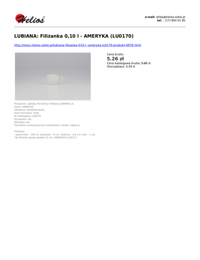 e-mail: [email protected] tel. : (17) 854 91 85 LUBIANA: Filiżanka 0,10 l - AMERYKA (LU0170) http://stary.helios-szklo.pl/lubiana-filizanka-010-l--ameryka-lu0170-produkt-6976.html Cena brutto: 5.26 zł Cena katalogowa brutto: 5.85 zł Oszczędzasz: 0,59 zł Producent: Zakłady Porcelany Stołowej LUBIANA S.A. Fason: AMERYKA Zdobienie: Niedekorowany Kolor porcelany: biała Nr katalogowy: LU0170 Zmywarka: tak Mikrofala: tak Porcelana o podwyższonym standardzie, trwała i odporna Filiżanka: - pojemność – 100 ml, wysokość – 6 cm, średnica – 6,5 cm, ilość – 1 szt. *do filiżanki pasuje spodek 11 cm / AMERYKA (LU0171)