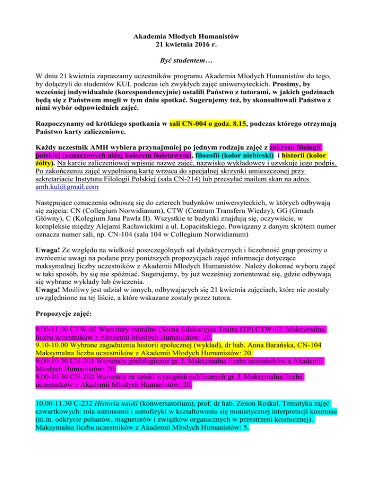 Akademia Młodych Humanistów 21 kwietnia 2016 r. Być studentem… W dniu 21 kwietnia zapraszamy uczestników programu Akademia Młodych Humanistów do tego, by dołączyli do studentów KUL podczas ich zwykłych zajęć uniwersyteckich. Prosimy, by wcześniej indywidualnie (korespondencyjnie) ustalili Państwo z tutorami, w jakich godzinach będą się z Państwem mogli w tym dniu spotkać. Sugerujemy też, by skonsultowali Państwo z nimi wybór odpowiednich zajęć. Rozpoczynamy od krótkiego spotkania w sali CN-004 o godz. 8.15, podczas którego otrzymają Państwo karty zaliczeniowe. Każdy uczestnik AMH wybiera przynajmniej po jednym rodzaju zajęć z zakresu filologii polskiej (oznaczonych niżej kolorem fioletowym), filozofii (kolor niebieski) i historii (kolor żółty). Na karcie zaliczeniowej wpisuje nazwę zajęć, nazwisko wykładowcy i uzyskuje jego podpis. Po zakończeniu zajęć wypełnioną kartę wrzuca do specjalnej skrzynki umieszczonej przy sekretariacie Instytutu Filologii Polskiej (sala CN-214) lub przesyłać mailem skan na adres [email protected] Następujące oznaczenia odnoszą się do czterech budynków uniwersyteckich, w których odbywają się zajęcia: CN (Collegium Norwidianum), CTW (Centrum Transferu Wiedzy), GG (Gmach Główny), C (Kolegium Jana Pawła II). Wszystkie te budynki znajdują się, oczywiście, w kompleksie między Alejami Racławickimi a ul. Łopacińskiego. Powiązany z danym skrótem numer oznacza numer sali, np. CN-104 (sala 104 w Collegium Norwidianum) Uwaga! Ze względu na wielkość poszczególnych sal dydaktycznych i liczebność grup prosimy o zwrócenie uwagi na podane przy poniższych propozycjach zajęć informacje dotyczące maksymalnej liczby uczestników z Akademii Młodych Humanistów. Należy dokonać wyboru zajęć w taki sposób, by się nie spóźniać. Sugerujemy, by już wcześniej zorientować się, gdzie odbywają się wybrane wykłady lub ćwiczenia. Uwaga! Możliwy jest udział w innych, odbywających się 21 kwietnia zajęciach, które nie zostały uwzględnione na tej liście, a które wskazane zostały przez tutora. Propozycje zajęć: 9.00-11.30 CTW-02 Warsztaty teatralne (Scena Edukacyjna Teatru ITP) CTW-02. Maksymalna liczba uczestników z Akademii Młodych Humanistów: 20. 9.10-10.00 Wybrane zagadnienia historii społecznej (wykład), dr hab. Anna Barańska, CN-104 Maksymalna liczba uczestników z Akademii Młodych Humanistów: 20. 9.00-10.30 CN-203 Warsztaty grafologiczne gr. I. Maksymalna liczba uczestników z Akademii Młodych Humanistów: 20. 9.00-10.30 CN-202 Warsztaty ze sztuki wystąpień publicznych gr. I. Maksymalna liczba uczestników z Akademii Młodych Humanistów: 20. 10.00-11.30 C-232 Historia nauki (konwersatorium), prof. dr hab. Zenon Roskal. Tematyka zajęć czwartkowych: rola astronomii i astrofizyki w kształtowaniu się monistycznej interpretacji kosmosu (m.in. odkrycie pulsarów, magnetarów i związków organicznych w przestrzeni kosmicznej). Maksymalna liczba uczestników z Akademii Młodych Humanistów: 5. 10.00-11.30 C-919 Teoria poznania (wykład), dr Piotr Lipski. Tematyka zajęć czwartkowych: klasyczna definicja wiedzy i zarzuty Gettiera pod jej adresem, czyli jak prostą definicję można obalić za pomocą zabawnych przykładów. Maksymalna liczba uczestników z Akademii Młodych Humanistów: 60. 10.00-10.45 CN-104 „Trzeba się uzbroić w bezstronność w ocenie tak jej zalet, jak i wad”. O kobiecie polskiej epoki zaborów (wykład) Prof. KUL dr hab. Anna Barańska. Maksymalna liczba uczestników z Akademii Młodych Humanistów: 20. 10.30-12.00 CN-203 Warsztaty grafologiczne gr. II. Maksymalna liczba uczestników z Akademii Młodych Humanistów: 20. 10.30-12.00 CN-202 Warsztaty ze sztuki wystąpień publicznych gr. II. Maksymalna liczba uczestników z Akademii Młodych Humanistów: 20. 10.50-12.30 GG-236 Etyka (wykład) dr Jacek Frydrych. Tematyka zajęć czwartkowych: Charakterystyka personalizmu etycznego, czyli ciąg dalszy sporu o normatywność w etyce. Maksymalna liczba uczestników z Akademii Młodych Humanistów: 15. 10.50-12.30 GG-249 The Question of Absolute and God in European Philosophy (wykład) ks mgr Artur Wójtowicz. Tematyka zajęć czwartkowych: Etienne Gilson – „God and Philosophy”. Maksymalna liczba uczestników z Akademii Młodych Humanistów: 5. 11.40-14.10 GG-107 Historia filozofii współczesnej (wykład) dr Maksymilian Roszyk. Tematyka zajęć: francuska historystyczna filozofia nauki (Bachelard, Canguillhem) oraz Michel Foucault. Maksymalna liczba uczestników z Akademii Młodych Humanistów: 40. 11.45-13.20 C-232 Wybrane zagadnienia z teorii poznania (wykład) dr Piotr Lipski. Tematyka zajęć czwartkowych: logika indukcji, tzw. kanony Milla, czyli schematy rozumowań dotyczących realcji przyczynowo-skutkowych. Maksymalna liczba uczestników z Akademii Młodych Humanistów:15. 11.40-12. 30 CN-101 Kościoły wschodnie w Rzeczypospolitej (wykład), dr Irena Wodzianowska. Maksymalna liczba uczestników z Akademii Młodych Humanistów: 20. 11.40-13. 20 GG-26 Polska na tle Europy Środkowo-Wschodniej w XIV wieku (wykład), dr hab. Piotr Plisiecki. Maksymalna liczba uczestników z Akademii Młodych Humanistów: 20. 12.30-14.10 CN-101 Historia powszechna XIX wieku (konwersatorium), dr Irena Wodzianowska Maksymalna liczba uczestników z Akademii Młodych Humanistów: 20. 12.30-13.20 CN-107 Polski Panteon. Wielcy Polacy w dziejach (wykład), dr hab. Tomasz Panfil. Maksymalna liczba uczestników z Akademii Młodych Humanistów: 5. 13.20-14.50 GG-246 Etyczne i aksjologiczne podstawy systemów politycznych (konwersatorium), prof. KUL dr hab. Jan Kłos. Tematyka zajęć czwartkowych: relacja tzw. klasycznego liberalizmu do nowoczesnego; wolności oraz władza i jej ograniczenia (Locke, Smith, Tocqueville, Hayek). Referaty studentów: relacja państwo – Kościół (encyklika Leona XIII) oraz Locke'a List o tolerancji. Maksymalna liczba uczestników z Ak