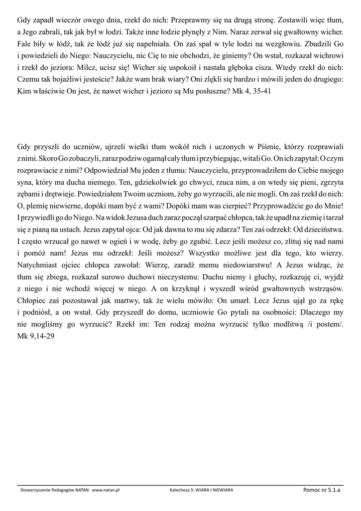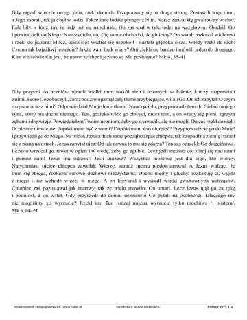 Gdy zapadł wieczór owego dnia, rzekł do nich: Przeprawmy się na drugą stronę. Zostawili więc tłum, a Jego zabrali, tak jak był w łodzi. Także inne łodzie płynęły z Nim. Naraz zerwał się gwałtowny wicher. Fale biły w łódź, tak że łódź już się napełniała. On zaś spał w tyle łodzi na wezgłowiu. Zbudzili Go i powiedzieli do Niego: Nauczycielu, nic Cię to nie obchodzi, że giniemy? On wstał, rozkazał wichrowi i rzekł do jeziora: Milcz, ucisz się! Wicher się uspokoił i nastała głęboka cisza. Wtedy rzekł do nich: Czemu tak bojaźliwi jesteście? Jakże wam brak wiary? Oni zlękli się bardzo i mówili jeden do drugiego: Kim właściwie On jest, że nawet wicher i jezioro są Mu posłuszne? Mk 4, 35-41 Gdy przyszli do uczniów, ujrzeli wielki tłum wokół nich i uczonych w Piśmie, którzy rozprawiali z nimi. Skoro Go zobaczyli, zaraz podziw ogarnął cały tłum i przybiegając, witali Go. On ich zapytał: O czym rozprawiacie z nimi? Odpowiedział Mu jeden z tłumu: Nauczycielu, przyprowadziłem do Ciebie mojego syna, który ma ducha niemego. Ten, gdziekolwiek go chwyci, rzuca nim, a on wtedy się pieni, zgrzyta zębami i drętwieje. Powiedziałem Twoim uczniom, żeby go wyrzucili, ale nie mogli. On zaś rzekł do nich: O, plemię niewierne, dopóki mam być z wami? Dopóki mam was cierpieć? Przyprowadźcie go do Mnie! I przywiedli go do Niego. Na widok Jezusa duch zaraz począł szarpać chłopca, tak że upadł na ziemię i tarzał się z pianą na ustach. Jezus zapytał ojca: Od jak dawna to mu się zdarza? Ten zaś odrzekł: Od dzieciństwa. I często wrzucał go nawet w ogień i w wodę, żeby go zgubić. Lecz jeśli możesz co, zlituj się nad nami i pomóż nam! Jezus mu odrzekł: Jeśli możesz? Wszystko możliwe jest dla tego, kto wierzy. Natychmiast ojciec chłopca zawołał: Wierzę, zaradź memu niedowiarstwu! A Jezus widząc, że tłum się zbiega, rozkazał surowo duchowi nieczystemu: Duchu niemy i głuchy, rozkazuję ci, wyjdź z niego i nie wchodź więcej w niego. A on krzyknął i wyszedł wśród gwałtownych wstrząsów. Chłopiec zaś pozostawał jak martwy, tak że wielu mówiło: On umarł. Lecz Jezus ujął go za rękę i podniósł, a on wstał. Gdy przyszedł do domu, uczniowie Go pytali na osobności: Dlaczego my nie mogliśmy go wyrzucić? Rzekł im: Ten rodzaj można wyrzucić tylko modlitwą /i postem/. Mk 9,14-29 Stowarzyszenie Pedagogów NATAN www.natan.pl Katecheza 5: WIARA I NIEWIARA Pomoc nr 5.1.a