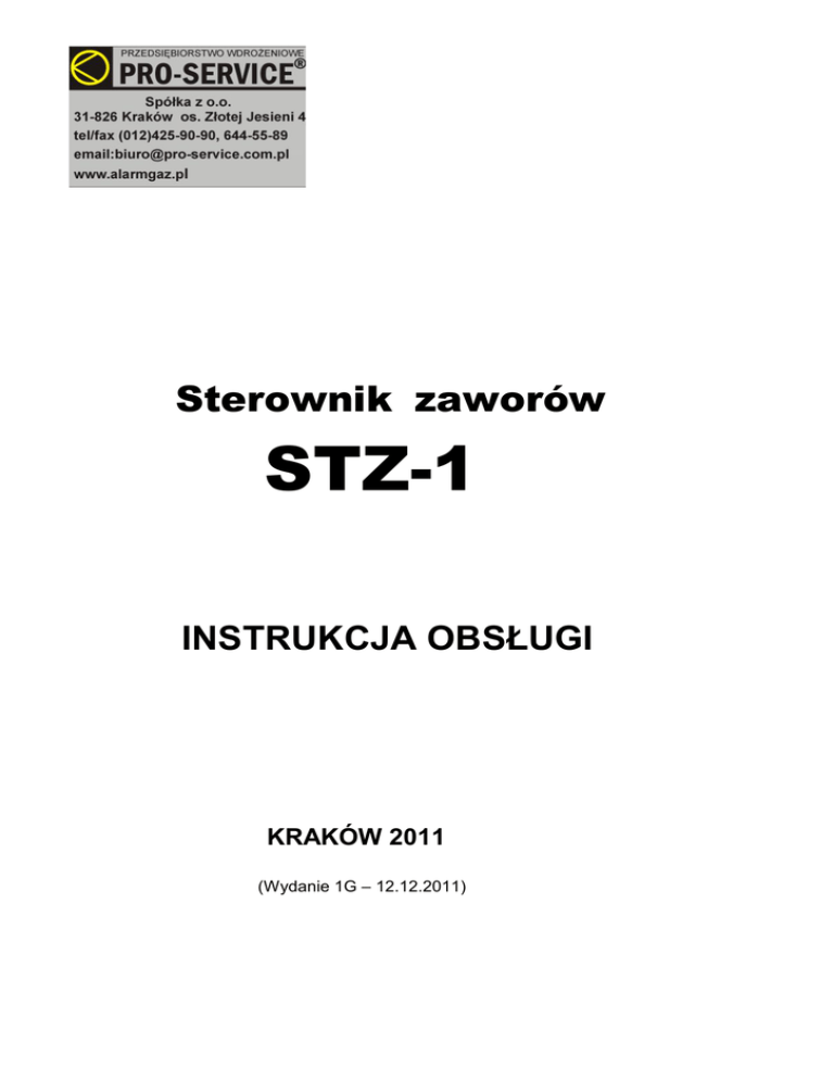 Sterownik zaworów STZ-1 INSTRUKCJA OBSŁUGI KRAKÓW 2011 (Wydanie 1G – 12.12.2011) Spis treści : I.. II.. III. IV. V. VI. VII. Podstawowe parametry techniczne Listwy zaciskowe, widok Połączenia sterownika STZ-1 Warunki gwarancji Karta gwarancyjna Protokół kontroli jakości Deklaracja Zgodności WE - str. 3 - str. 4 - str. 5 - str. 7 - str. 8 - str. 9 - str. 10 2 I. PODSTAWOWE PARAMETRY TECHNICZNE Sterownik STZ-1 przeznaczony jest do współpracy z dowolnym modułem alarmowym z wyjściem zaworowym (3 impulsy 12V o czasie trwania ok. 1 sek.). Przykładowo mogą to być centralki : uniSTER8z, uniSTER16z, PAG8, EXter4z, MD2z, MD4z. Do sterownika można podłączyć zawory gazowe (elektrozawory), o cewkach 12-24V DC, sterowanych impulsowo o dużym poborze prądu. 1. Napięcie zasilania – 230 V AC, 50 Hz 2. Napięcie wyjściowe - impulsy 24V (napięcie pojawia się po wysterowaniu wejścia) 3. Maksymalny prąd wyjściowy - 12A chwilowy 4. Pobór mocy z sieci – max. 20 W 5. Wejście – impulsowe 12V. o o 6. Temperatura pracy - od - 15 do + 50 C (zalecana +5 - + 40 C) 7. Kontrola zasilania – optyczna (zielona LED) 8. Sygnalizacja wysterowania zaworu – optyczna (żółta LED) 9. Wymiary (bez dławic) – wysokość x szerokość x głębokość : 215 x 240 x 115 mm 10. Waga : 2100g 11. Obudowa – wysokoudarowy ABS, IP-54, mocowanie 3-punktowe 12. Elementy wymienne: - Akumulatory żelowe 12V/1,3Ah - 2szt. - bezpiecznik topikowy 5x20 0,63A/T - 1szt. (bezpiecznik F8) - bezpiecznik samochodowy nożowy standardowy 10A - 1szt. (bezpiecznik F7) 3 II. LISTWY ZACISKOWE, WIDOK 0,63A/T STZ-1 Akumulator 12V/1,3Ah Akumulator 12V/1,3Ah F8 + - Akumulator SW-ZAS F7 CON1 L 10A P4 N ZASILANIE 230V AC CON11 W2 NC COM NO (-) ZASILANIE ~230V (+) WEJ. Rys.1. Listwy zaciskowe STZ-1 ZASILANIE WYSTEROWANIE ZAWORU STEROWNIK ZAWORU tel./fax:(12) 425-90-90 www.pro-service.com.pl Rys.2. Płyta czołowa 4 + ZAWOR WYJ. (ZAWÓR) Na listwie zaciskowej dostępne są następujące wyprowadzenia: - zasilanie sieciowe „ 230V AC” (zaciski L, N) - WEJ (zaciski „-„ / „+”) - podłączamy do odpowiedniego wyjścia zaworowego w centralce UWAGA: NIE WOLNO NA STAŁE WYSTEROWAĆ TEGO WEJŚCIA !!! - WYJ. (ZAWÓR) (zaciski „-„ / „+”) – podłączamy cewkę zaworu samozamykającego (o napięciu pracy 12V -24 DC, sterowanie impulsowe) Bezpieczniki wymienne: - bezpiecznik topikowy 5x20 0,63A/T - 1szt. (bezp. F8) – w obwodzie zasilania sieciowego - bezpiecznik samochodowy nożowy standardowy 10A - 1szt. (bezp. F7) – sterowanie cewki zaworu Na płycie czołowej (rys.2.) umieszczone są następujące elementy : - Dioda LED ZASILANIE (kolor zielony): - świecenie ciągłe – zasilanie sieciowe ~230V. - Dioda LED WYSTEROWANIE ZAWORU (kolor żółty): - impulsy – w takt wysterowania cewki zaworu III. POŁĄCZENIA STEROWNIKA STZ-1 Współpraca sterownika STZ-1 z typowymi centralkami firmy Pro-Service przedstawiono na rys.3. Wyjście zaworowe centralki (impulsowe 12V) centralki łączy się z wejściem WEJ. sterownika. Należy zwrócić uwagę na odpowiednią polaryzację sygnału wejściowego. Do połączenia można użyć dowolnego 2 kabla 2 x 1mm . Sterownik STZ-1 może współpracować z typowymi zaworami odcinającymi (np. kulowymi typu SK firmy GAZOMET i grzybkowymi typu ZB firmy FLAMA-GAZ) posiadającymi cewki zasilane impulsami 12 -24V. Zawory takie nie wymagają ciągłego zasilania. Napięcie wyjściowe impulsowe sterownika STZ-1 używane jest tylko do zamknięcia elektrozaworu – otwieranie jest ręczne. Ze względu na duże prądy sterujące cewkami zaworów (i możliwe duże spadki napięć na kablach) należy umieszczać sterownik jak najbliżej elektrozaworu. Nie zamykanie elektrozaworu może być też spowodowane rozładowanym lub uszkodzonym akumulatorem. Impulsy 24V z wyjścia zaworowego WYJ. sterownika są podawane na cewkę zaworu poprzez rezystor dodatkowy Rd. ogranicza on napięcie i prąd cewki do bezpiecznych wartości -dotyczy to zwłaszcza cewek o napięciu sterującym 12V. Wartość rezystora Rd (moc 5W) należy dobierać uwzględniając rezystancję kabla łączącego zawór i sterownik (zależy od długości i średnicy przewodu) oraz rezystancję cewki zaworu. Suma rezystancji kabla i rezystora Rd ma być w przybliżeniu równa (lub nieco mniejsza) rezystancji cewki zaworu. Do połączenia używać dowolnych kabli 2-żyłowych, np. typu YDY, YLY, OMY itp. Dobór kabli między elektrozaworem a centralką ( w zależności od odległości i typu zaworu ) przedstawia tabela 1. Maksymalna długość kabla ↓ Kabel - przekroje ↓ Zawory kulowe SK Zawory grzybkowe ZB 1,5 mm 2 10 m 50 m 2,5 mm 2 20 m 100 m 4,0 mm 2 50 m 100 m Tabela.1. 5 Wsółpraca sterownika zaworu STZ-1 z centralkami uniSTER/PAG Centrala Alarmowa Sterownik zaworu STZ-1 uniSTER8z / uniSTER16z / PAG8 STER. ZAW. Z1 - WEJ. + ZAWÓR - + - + Rd Elektrozawór Wsółpraca sterownika zaworu STZ-1 z centralkami EXter4z Centrala Alarmowa EXter4z Sterownik zaworu STZ-1 ZAWOR - WEJ. + + ZAWÓR - + - Rd Elektrozawór Wartość rezystora Rd (o mocy 5W) dobierać w zależności od długości kabla łączącego sterownik STZ-1 i zawór. Suma rezystancji kabla i Rd ma być w przybliżeniu równa (lub nieco mniejsza) od rezystancji cewki zaworu W skrajnym przypadku (duża odległość między sterownikiem a zaworem) można nie montować (zwarcie) rezystor Rd (Rd=0R). Rys.3. Współpraca z centralkami EXter4z, uniSTER8z, uniSTER16z, PAG8 6 IV. WARUNKI GWARANCJI 1. Pro-Service sp. z o.o. potwierdza w dokumentach dobrą jakość i prawidłowe działanie wyrobu. Użytkownikowi wyrobu gwarantuje się dobrą jakość i sprawność odnośnie konstrukcji, wykonania, a także zastosowanych materiałów. Gwarantuje się prawidłowe działanie wyrobu zamontowanego i eksploatowanego zgodnie z Instrukcją Obsługi i przeznaczeniem. 2. Gwarancja jest udzielana na okres 24 miesięcy od daty sprzedaży. 3. Gwarancja obejmuje ukryte wady materiałowe