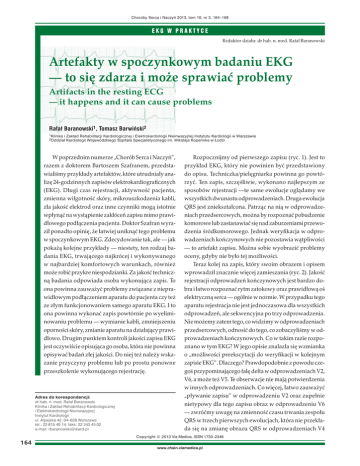 Choroby Serca i Naczyń 2013, tom 10, nr 3, 164–168 EKG W PRAKTYCE Redaktor działu: dr hab. n. med. Rafał Baranowski Artefakty w spoczynkowym badaniu EKG — to się zdarza i może sprawiać problemy Artifacts in the resting ECG — it happens and it can cause problems Rafał Baranowski1, Tomasz Barwiński2 1Klinika i Zakład Rehabilitacji Kardiologicznej i Elektrokardiologii Nieinwazyjnej Instytutu Kardiologii w Warszawie Kardiologii Wojewódzkiego Szpitala Specjalistycznego im. Mikołaja Kopernika w Łodzi 2Oddział W poprzednim numerze „Chorób Serca i Naczyń”, razem z doktorem Bartoszem Szafranem, przedstawialiśmy przykłady artefaktów, które utrudniały analizę 24-godzinnych zapisów elektrokardiograficznych (EKG). Długi czas rejestracji, aktywność pacjenta, zmienna wilgotność skóry, mikrouszkodzenia kabli, zła jakość elektrod oraz inne czynniki mogą istotnie wpłynąć na wystąpienie zakłóceń zapisu mimo prawidłowego podłączenia pacjenta. Doktor Szafran wyraził ponadto opinię, że łatwiej uniknąć tego problemu w spoczynkowym EKG. Zdecydowanie tak, ale — jak pokażą kolejne przykłady — niestety, ten rodzaj badania EKG, trwającego najkrócej i wykonywanego w najbardziej komfortowych warunkach, również może robić przykre niespodzianki. Za jakość techniczną badania odpowiada osoba wykonująca zapis. To ona powinna zauważyć problemy związane z nieprawidłowym podłączeniem aparatu do pacjenta czy też ze złym funkcjonowaniem samego aparatu EKG. I to ona powinna wykonać zapis powtórnie po wyeliminowaniu problemu — wymianie kabli, zmniejszeniu oporności skóry, zmianie aparatu na działający prawidłowo. Drugim punktem kontroli jakości zapisu EKG jest oczywiście opisująca go osoba, która nie powinna opisywać badań złej jakości. Do niej też należy wskazanie przyczyny problemu lub po prostu ponowne przeszkolenie wykonującego rejestrację. Adres do korespondencji: dr hab. n. med. Rafał Baranowski Klinika i Zakład Rehabilitacji Kardiologicznej i Elektrokardiologii Nieinwazyjnej Instytut Kardiologii ul. Alpejska 42, 04–628 Warszawa tel.: 22 815 40 14, faks: 22 343 45 02 e-mail: [email protected] 164 Rozpocznijmy od pierwszego zapisu (ryc. 1). Jest to przykład EKG, który nie powinien być przedstawiony do opisu. Techniczka/pielęgniarka powinna go powtórzyć. Ten zapis, szczęśliwie, wykonano najlepszym ze sposobów rejestracji —te same ewolucje oglądamy we wszystkich dwunastu odprowadzeniach. Druga ewolucja QRS jest zniekształcona. Patrząc na nią w odprowadzeniach przedsercowych, można by rozpoznać pobudzenie komorowe lub zastanawiać się nad zaburzeniami przewodzenia śródkomorowego. Jednak weryfikacja w odprowadzeniach kończynowych nie pozostawia wątpliwości — to artefakt zapisu. Można sobie wyobrazić problemy oceny, gdyby nie było tej możliwości. Teraz kolej na zapis, który swoim obrazem i opisem wprowadził znacznie więcej zamieszania (ryc. 2). Jakość rejestracji odprowadzeń kończynowych jest bardzo dobra i łatwo rozpoznać rytm zatokowy oraz prawidłową oś elektryczną serca — ogólnie w normie. W przypadku tego aparatu rejestracja nie jest jednoczasowa dla wszystkich odprowadzeń, ale sekwencyjna po trzy odprowadzenia. Nie możemy zatem tego, co widzimy w odprowadzeniach przedsercowych, odnosić do tego, co zobaczyliśmy w odprowadzeniach kończynowych. Co w takim razie rozpoznano w tym EKG? W jego opisie znalazła się wzmianka o „możliwości preekscytacji do weryfikacji w kolejnym zapisie EKG”. Dlaczego? Prawdopodobnie z powodu czegoś przypominającego falę delta w odprowadzeniach V2, V6, a może też V5. Te obserwacje nie mają potwierdzenia w innych odprowadzeniach. Co więcej, łatwo zauważyć „pływanie zapisu” w odprowadzeniu V2 oraz zupełnie nietypowy dla tego zapisu obraz w odprowadzeniu V6 — zwróćmy uwagę na zmienność czasu trwania zespołu QRS w trzech pierwszych ewolucjach, która nie przekłada się na zmianę obrazu QRS w odprowadzeniach V4 Copyright © 2013 Via Medica, ISSN 1733–2346 www.chsin.viamedica.pl Rafał Baranowski, Tomasz Barwiński, Artefakty w spoczynkowym badaniu EKG — to się zdarza i może sprawiać problemy Rycina 1. A Rycina 2A. www.chsin.viamedica.pl Æ 165 Choroby Serca i Naczyń 2013, tom 10, nr 3 B Rycina 2B. i V5. Podsumowując, nie ma tu preekscytacji, są natomiast artefakty zapisu. Ten elektrokardiogram nie powinien zostać przedstawiony do opisu — należało powtórzyć rejestrację odprowadzeń przedsercowych. Jeśli już trafił do opisania, to należało go skwitować jednym zdaniem: „EKG do powtórnego wykonania z powodu złej jakości zapisu odprowadzeń przedsercowych”. Zamiast takiego opisu 16-letni pacjent i jego matka otrzymali opis z hasłem „preekscytacja”. Z nim wiąże się inne, groźniejsze — ryzyko nagłego zgonu. Efekt? Zwolnienie z zajęć wychowania fizycznego i korowód badań... Kolejne zapisy nadesłał doktor Tomasz Barwiński. Wykonano je u 13-letniego chłopca uprawiającego sport (piłka nożna). Problem tkwił w odprowadzeniach przedsercowych. Popatrzmy na rycinę 3. To, co zwraca uwagę, to obraz typowy dla zespołu Brugadów w odprowadzeniu V2. Pacjent nie miał objawów, nie było też wywiadu rodzinnego nagłych zgonów. Rozpoznanie zespołu Brugadów to poważny problem zdrowotny — ryzyko nagłego zgonu, wskazania do wszczepienia kardiowertera-defibrylatora i, oczywiście, koniec kariery piłkarskiej. Czy to jednak na pewno zespół Brugadów? Popatrzmy na kolejne zapisy EKG odprowadzeń przedsercowych tego pacjenta wykonane na innych aparatach (ryc. 4 166 i 5). Nie widać w nich żadnych cech zespołu Brugadów. Gdzie tkwi przyczyna ich zniknięcia? Przyczyną było filtrowanie sygnału EKG. Podlega mu każdy sygnał EKG i zawsze jakieś filtry pozostają włączone. Są ustawiane fabrycznie, ale praktycznie w każdym aparacie można je zmienić w prostszy (naciskając 