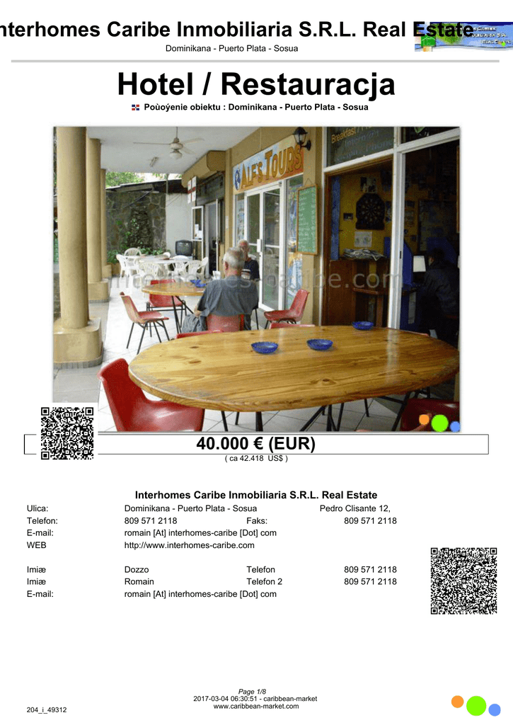 nterhomes Caribe Inmobiliaria S.R.L. Real Estate Dominikana - Puerto Plata - Sosua Hotel / Restauracja Poùoýenie obiektu : Dominikana - Puerto Plata - Sosua 40.000 € (EUR) ( ca 42.418 US$ ) Interhomes Caribe Inmobiliaria S.R.L. Real Estate Ulica: Telefon: E-mail: WEB Dominikana - Puerto Plata - Sosua 809 571 2118 Faks: romain [At] interhomes-caribe [Dot] com http://www.interhomes-caribe.com Imiæ Imiæ E-mail: Dozzo Telefon Romain Telefon 2 romain [At] interhomes-caribe [Dot] com 204_i_49312 Page 1/8 2017-03-04 06:30:51 - caribbean-market www.caribbean-market.com Pedro Clisante 12, 809 571 2118 809 571 2118 809 571 2118 nterhomes Caribe Inmobiliaria S.R.L. Real Estate Dominikana - Puerto Plata - Sosua Numer kodu Typ budynku Poùoýenie Materiaùy Property Address Powierzchnia dziaùki Firma Ýycie Kuchnia Sypialnie Zùy Opinie Toaleta 204_i_49312 Hotel / Restauracja Úródmieúcie Beton Numer kodu Nr referencyjny Status objektet Rok Powierzchnia 60 m2 1 1 Biznes Inne Usùugi Garaý Carport zadaszony taras Akcesoria Dzierýawa Taras Balkon Jetty Pokój Party Klimatyzacja Resort Ogród Pralnia Goràcy zadaszony taras ogrodzony / murem 204_i_49312 186 krótki potrzebne Page 2/8 2017-03-04 06:30:51 - caribbean-market www.caribbean-market.com 1 Bar 1 nterhomes Caribe Inmobiliaria S.R.L. Real Estate Dominikana - Puerto Plata - Sosua 204_i_49312 Page 3/8 2017-03-04 06:30:51 - caribbean-market www.caribbean-market.com nterhomes Caribe Inmobiliaria S.R.L. Real Estate Dominikana - Puerto Plata - Sosua Aussenplätze Aussenplätze 204_i_49312 Page 4/8 2017-03-04 06:30:51 - caribbean-market www.caribbean-market.com nterhomes Caribe Inmobiliaria S.R.L. Real Estate Dominikana - Puerto Plata - Sosua Internetplätze mit Bar Bar 204_i_49312 Page 5/8 2017-03-04 06:30:51 - caribbean-market www.caribbean-market.com nterhomes Caribe Inmobiliaria S.R.L. Real Estate Dominikana - Puerto Plata - Sosua Bar mit Blick zur Küche Aussenplätze 204_i_49312 Page 6/8 2017-03-04 06:30:51 - caribbean-market www.caribbean-market.com nterhomes Caribe Inmobiliaria S.R.L. Real Estate Dominikana - Puerto Plata - Sosua Bar Internet 204_i_49312 Page 7/8 2017-03-04 06:30:51 - caribbean-market www.caribbean-market.com nterhomes Caribe Inmobiliaria S.R.L. Real Estate Dominikana - Puerto Plata - Sosua Toilette 204_i_49312 Page 8/8 2017-03-04 06:30:51 - caribbean-market www.caribbean-market.com