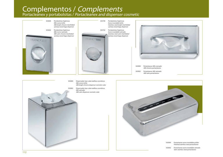 Complementos / Complements Portacleanex y portabolsitas / Portacleanex and dispenser cosmetic 112 503600 Portabolsitas higiénicas ABS cromo brillo ABS bright chrome interfolded sanitary towel bags dispenser 503700 Portabolsitas higiénicas Acero inoxidable brillo Stainless steel bright interfolded sanitary towel bags dispenser 503602 Portabolsitas higiénicas ABS cromo satinado ABS satin chrome interfolded sanitary towel bags dispenser 503702 Portabolsitas higiénicas Acero inoxidable satinado Stainless steel satin interfolded sanitary towel bags dispenser 503800 Dispensador tipo cubo toallitas cosméticas ABS cromo brillo ABS bright chrome dispenser cosmetic cube 503802 Dispensador tipo cubo toallitas cosméticas ABS satinado ABS satin dispenser cosmetic cube 503900 Portacleanex ABS cromado ABS chrome portacleanex 503902 Portacleanex ABS satinado ABS satin portacleanex 502000 Portacleanex acero inoxidable pulido Polished stainless steel portacleanex 502002 Portacleanex acero inoxidable satinado Satin stainless steel portacleanex