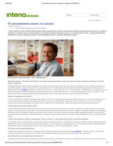 13.02.2015 W poszukiwaniu wzoru na sukces Biznes w INTERIA.PL Szukaj w serwisie Biznes Dodaj do zakładek w W poszukiwaniu wzoru na sukces Czwartek, 5 lutego (15:11) Lubię to! 33 osoby lubią to. Bądź pierwszą wśród swoich znajomych. Kiedy trzymasz w ręku młotek, każdy problem będzie wyglądać jak gwóźdź. Dlatego jeśli próbujesz znaleźć jakieś rozwiązanie, odejdź od znanych ci narzędzi i spójrz na dany problem z innej strony. Wszyscy biegną w prawo, a ty spróbuj pójść w lewo z doktorem Robertem Kozielskim*, autorem najlepszej książki ze sfery "Strategii Biznesu", rozmawia Agnieszka Czapla. W poszukiwaniu wzoru na sukces... Fot. Leszek Ogrodnik Agnieszka Czapla: Co może zrobić każdy z nas, żeby osiągać postawione sobie cele? Mam na myśli nie tylko te w biznesie, ale też te drobne, codzienne. Dr Robert Kozielski: Albert Einstein powiedział, że obłędem jest powtarzać w kółko tę samą czynność i oczekiwać innych rezultatów. Jeśli wczoraj posłodziłaś herbatę dwoma łyżeczkami cukru i dziś zrobisz to samo, nie zakładaj, że herbata będzie mniej lub bardziej słodka. To bardzo proste, jednak często mamy problem z wyjściem z rutynowych czynności zarówno w pracy, jak i w życiu prywatnym. Oczekujemy, że coś nagle zacznie nam magicznie wychodzić, zostaniemy bogaczami albo osiągniemy jakiś sukces. Gdy robisz coś, co nie przynosi rezultatu, znajdź inny sposób. To nie łatwe, trzeba stale od siebie wymagać. Na tym właśnie polega kultura uczenia się, która jest ważnym czynnikiem sukcesu. Polega na wymaganiu od siebie? Tak i na nadążaniu za szybko zmieniającym się światem. W 2012 roku zostało wyprodukowanych tyle informacji, ile w całej historii świata do 2011 roku. Samolot potrzebował prawie 70 lat aby dotrzeć do 50 milionów swoich klientów, a Facebook zrobił to w dwa lata. To oznacza, że żyjemy w bardzo dynamicznie zmieniającym się świecie. Żeby nadążyć za nim i sobie radzić, musisz mieć dużą otwartość i gotowość uczenia się. To wystarczy, żeby zostać prekursorem? Prawie. Potrzebne są trzy rzeczy. Po pierwsze dopuszczenie do siebie myśli, że jestem na tyle silny i wyjątkowy, że mogę coś odkryć. Naprawdę każdy może być prekursorem. Po drugie wspomniana czujność i gotowość uczenia się. Po trzecie szukanie i wdrażanie narzędzi, które pomagają odnaleźć unikalne rozwiązania. Einstein powiedział: kiedy trzymasz w ręku młotek, to każdy problem będzie wyglądał jak gwóźdź. A więc rada jest taka: jeśli próbujesz coś odkryć, odejdź od znanych ci narzędzi i spójrz na dany problem z innej strony. Wszyscy biegną w prawo, to ty spróbuj pójść w lewo. Parę lat prowadził pan badania i poszukiwał "wzoru na sukces". Czy znalazł pan też wzór na unikanie porażek? Ale porażek wcale nie trzeba unikać, są naturalnym elementem drogi do sukcesu. Ludzie, którzy próbują coś osiągnąć, ciągle napotykają trudności. Wejdziesz na jeden szczyt, zaczyna się wspinaczka na kolejny. Chwila oddechu czy satysfakcji jest krótka. Jednak to właśnie ten wysiłek i zdolność pokonywania siebie jest najważniejsza. Tylko to, co zostaje osiągnięte z trudem, daje satysfakcję i rozwija. Pan miewa takie momenty krytyczne? Oczywiście. Budzę się o 3 czy 4 rano i myślę jak pokryć koszty, jak zabezpieczyć przyszłość mojego biznesu. To bardzo osobiste, ekstremalne momenty. Ale jest we mnie wtedy nie tylko strach, ale też jakaś wola walki, która sprawia, że myślę "Robert dasz sobie radę". Jak zmotywować się w krytycznych momentach? Motywuje mnie świadomość, że trudności to wyzwanie do pokonania, a nie problem. Po drugie odpowiedzialność za innych. Za moją rodzinę, za http://biznes.interia.pl/wiadomosci/news/wposzukiwaniuwzorunasukces,2088644,4199 1/3 13.02.2015 W poszukiwaniu wzoru na sukces Biznes w INTERIA.PL moich pracowników. Jeśli jesteś odpowiedzialny za innych, nie możesz wykazywać słabości. Słaby byłby generał armii, który jako pierwszy ucieka z pola bitwy. I trzeci element bardzo ważny w przywództwie świadomość, że możesz się bardzo dużo nauczyć pokonując przeszkodę. Porażki rozwijają nas mocniej niż sukcesy. Sukces często prowadzi do arogancji, do przekonania o swojej wielkości. A to jest pierwszy krok do prawdziwej porażki. Kiedy mówi pan o tych porażkach i stawianiu im czoła, przypomina mi się to, co napisał pan w swojej książce o wrażliwości na zmiany i wykorzystywaniu okazji, które pojawiają się w naszym życiu. Chodzi nie tylko o wykorzystywanie okazji, ale po prostu o przyjmowanie tego, co nas spotyka. Nie trzeba pytać "dlaczego?", ale "co ja mogę z tym zrobić?". To dotyczy zarówno tych dobrych, jak i złych rzeczy, które przytrafiają się w życiu niezależnie od nas. Mając 22 lata byłem piłkarzem zawodowym. Jestem chyba jedynym zawodnikiem w historii polskiego futbolu, który w swoim debiucie ligowym strzelił trzy bramki. I nie były to bramki samobójcze (śmiech). Nagle, w tym samym roku, zmarł mój ojciec i doznałem poważnej kontuzji. Te dwie rzeczy wywróciły moje życie do góry nogami. Musiałem zejść na stałe z boiska, pożegnać się z planami kariery piłkarskiej. Trzeba było znaleźć dla siebie nową drogę. Zacząłem się uczyć, studiowałem wtedy zarządzanie na Uniwersytecie Łódzkim. Dostałem propozycję pracy na uczelni. Zostałem asystentem i tak rozpoczęła się moja kariera naukowa. A te dobre rzeczy łatwo je przegapić? Bardzo łatwo przegapić wiele szans. Słyszałaś o "serendipity"? To nieoczekiwane zdarzenie, które wpływa na naszą przyszłość. Określenie to pochodzi od tytułu filmu, w którym kobieta i mężczyzna spotykają się przypadkowo w sklepie. Chcą kupić tę samą parę rękawiczek. Ten drobiazg zmienia ich dalsze losy. Takich zdarzeń, czy osób, które mogą zmienić nasze życie, jest bardzo dużo, ale nie wszystkie dost